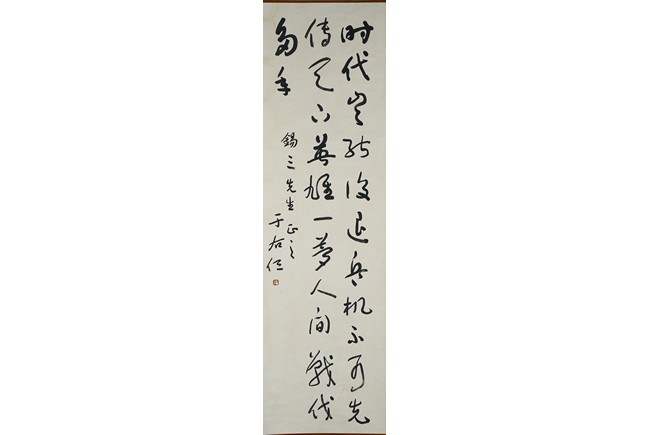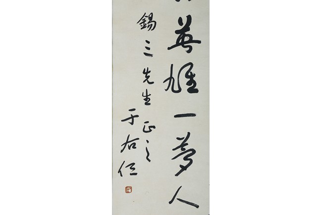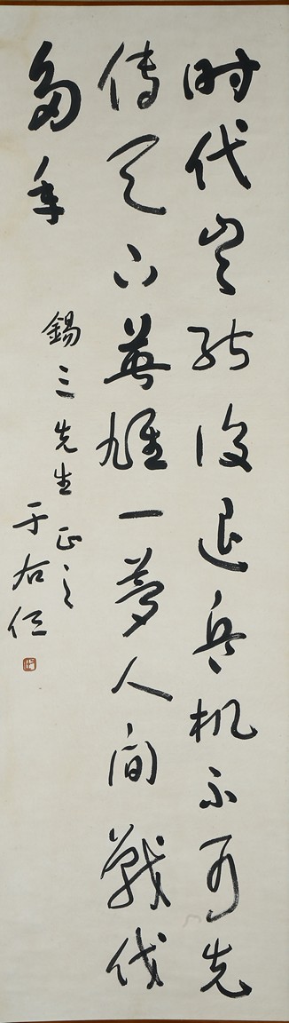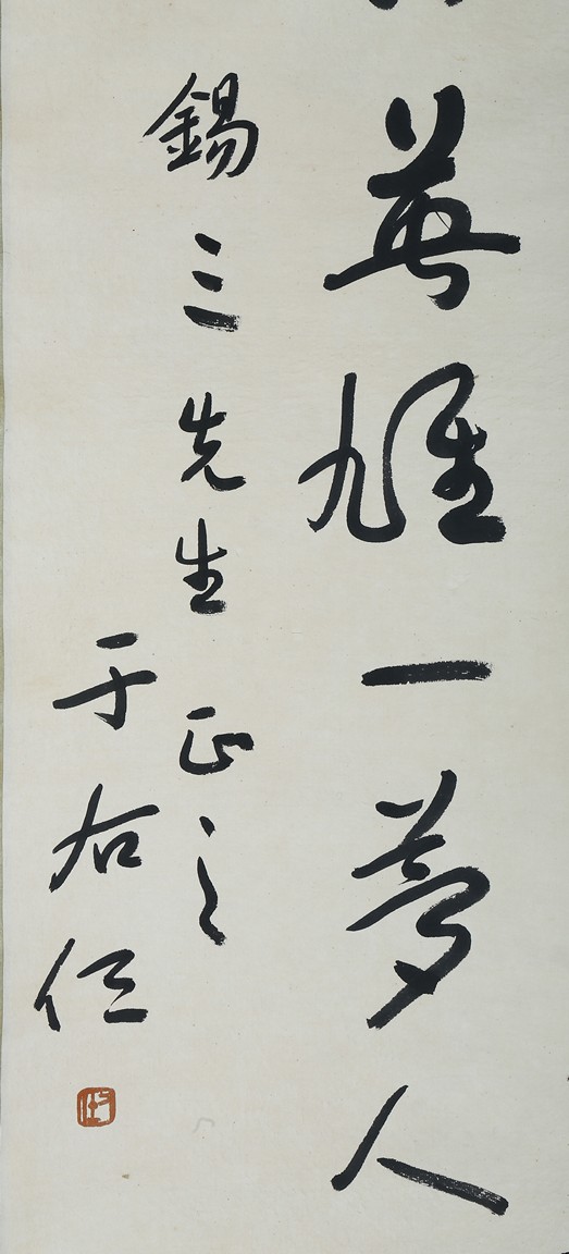 Ink on paper. Cursive script calligraphy. Hanging scroll. Signed Yu Youren and dedicated to Mr. Xi San, with one seal of the artist.
