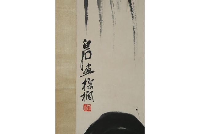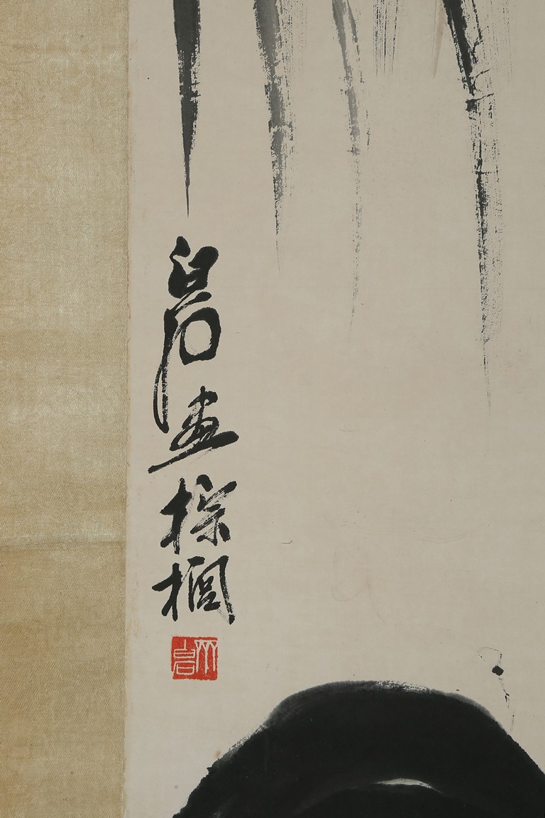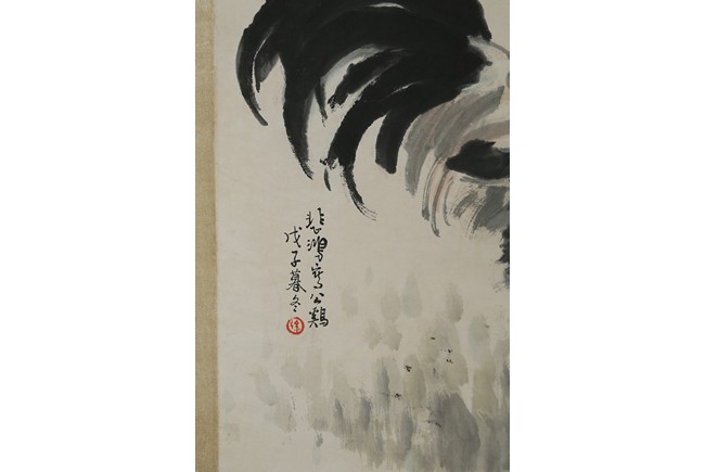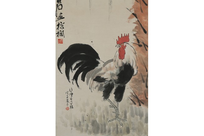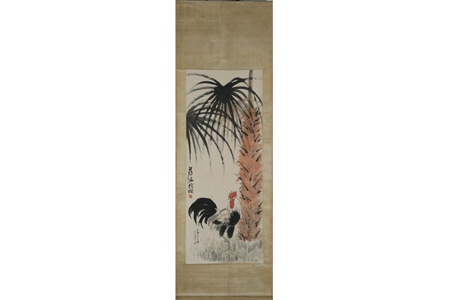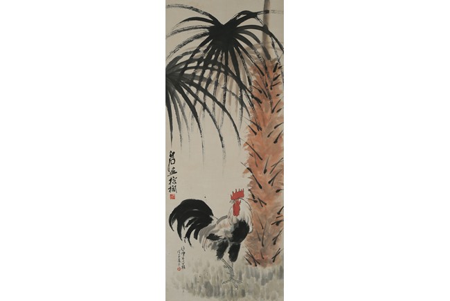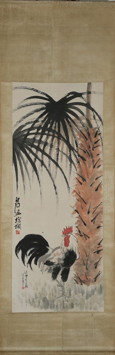 Color and ink on paper. Palm tree and rooster. Hanging scroll. Inscribed and signed Baishi and Beihong, each with one seal of the artist.
