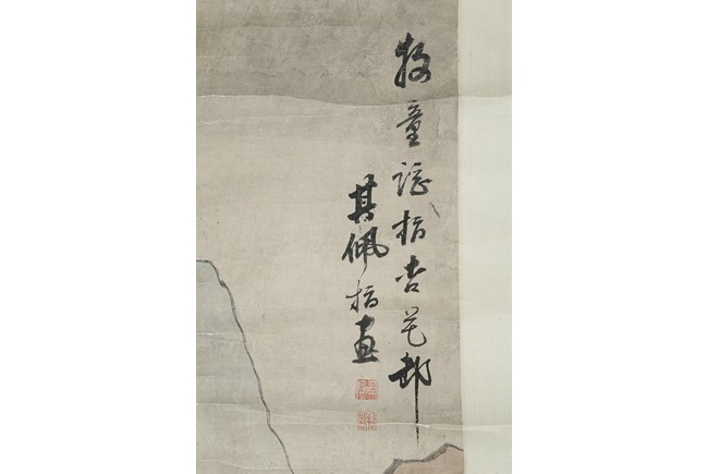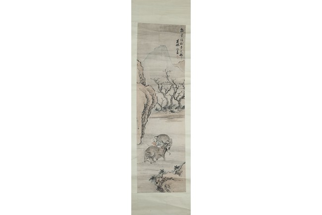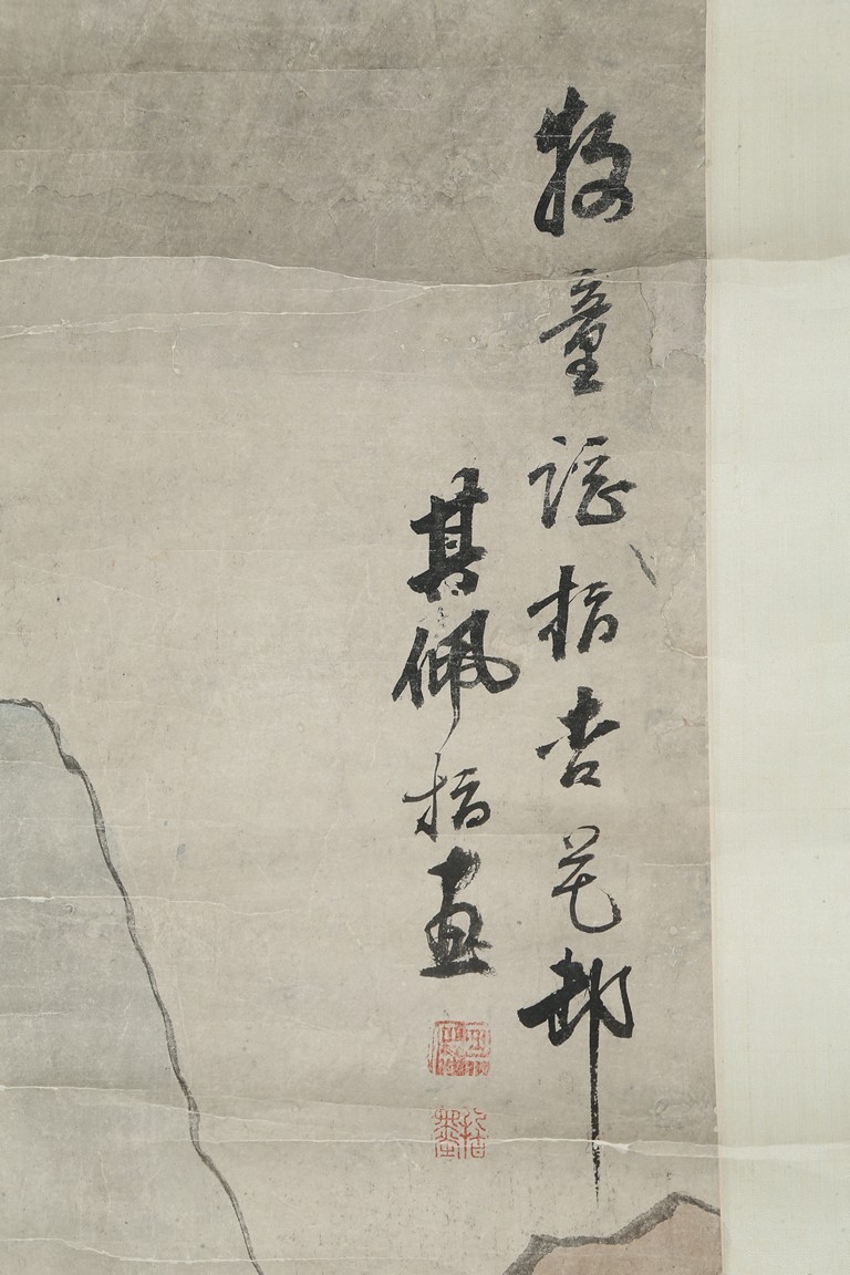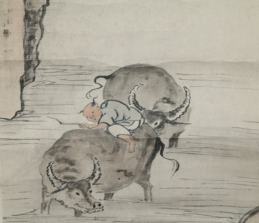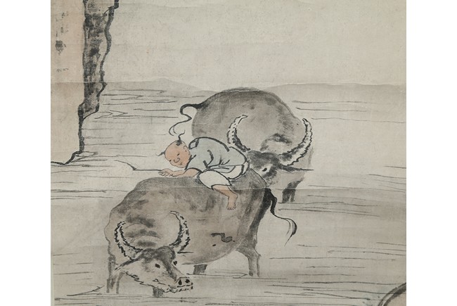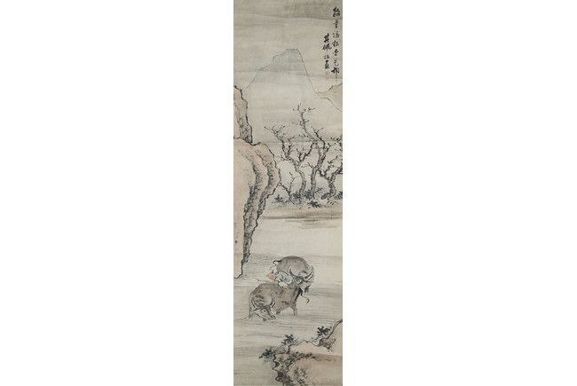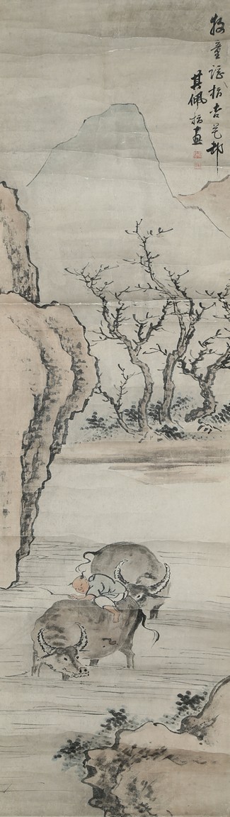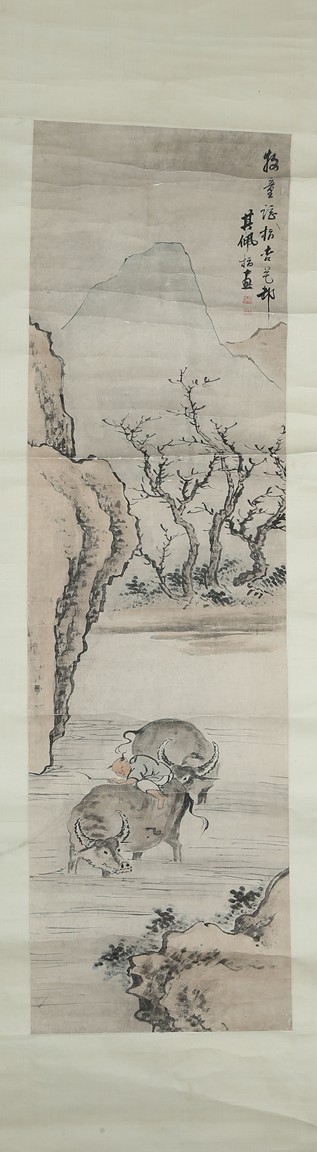 Color and ink on paper. Boy and Buffalo. Hanging scroll. Inscribed and signed Qi Pei, with two seals of the artist.