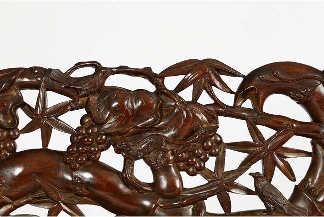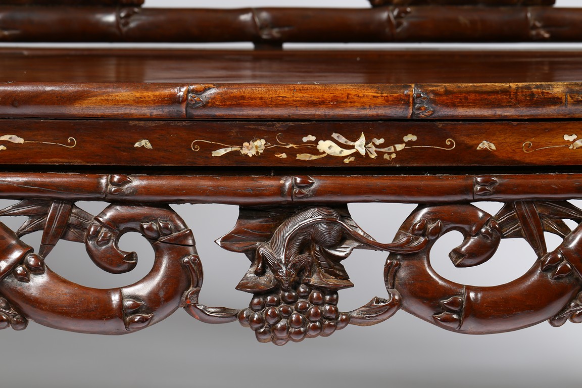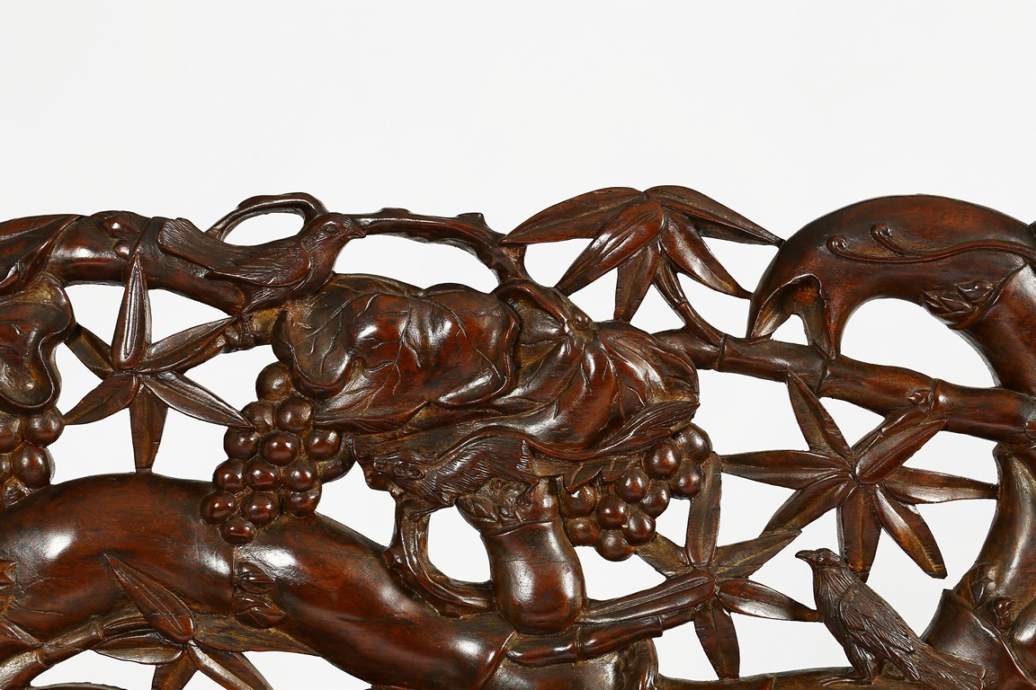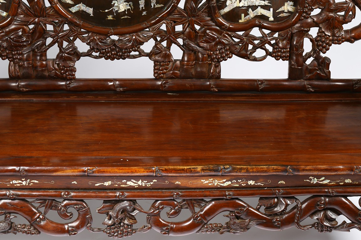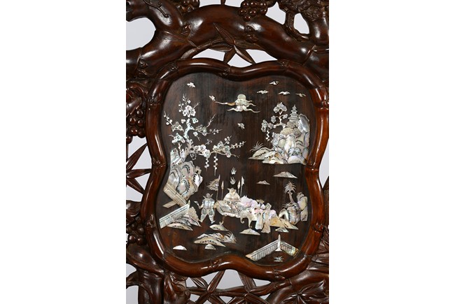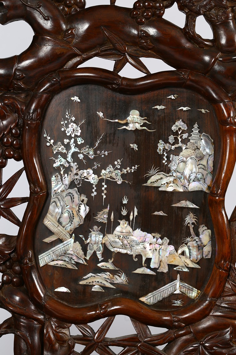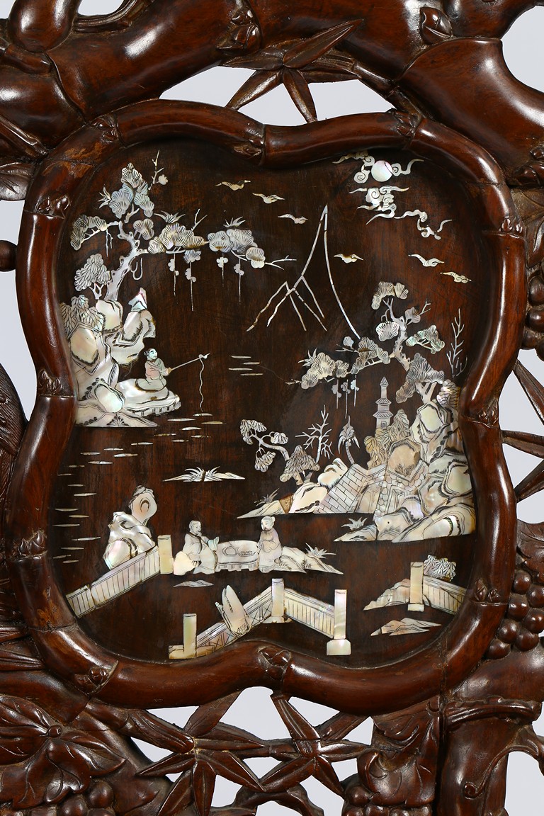 The finely carved and reticulated backrest inset with three panels inlaid with mother of pearl to depict landscape scenes, the arms decorated with openwork design, the hardwood seat above an reticulated apron, all supported on four cabriole legs. Republic period.