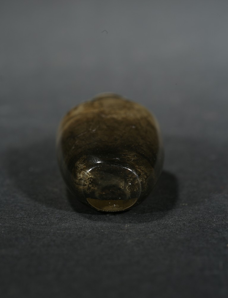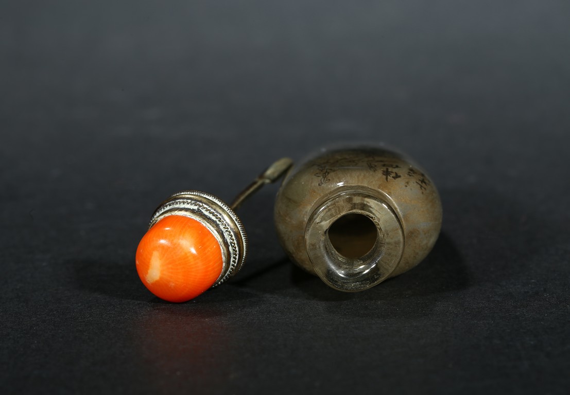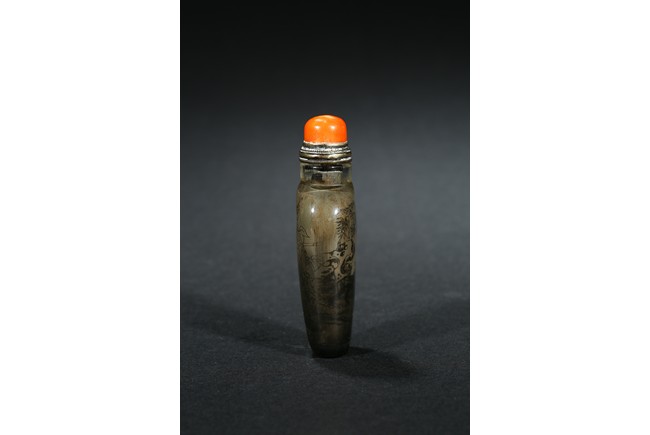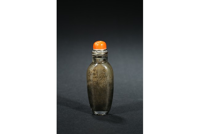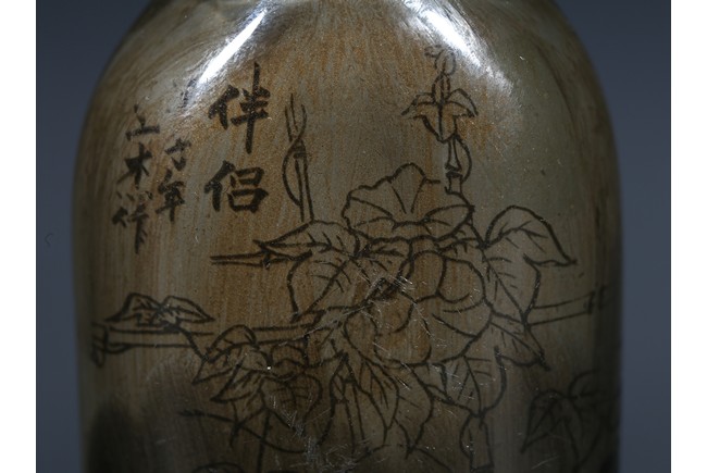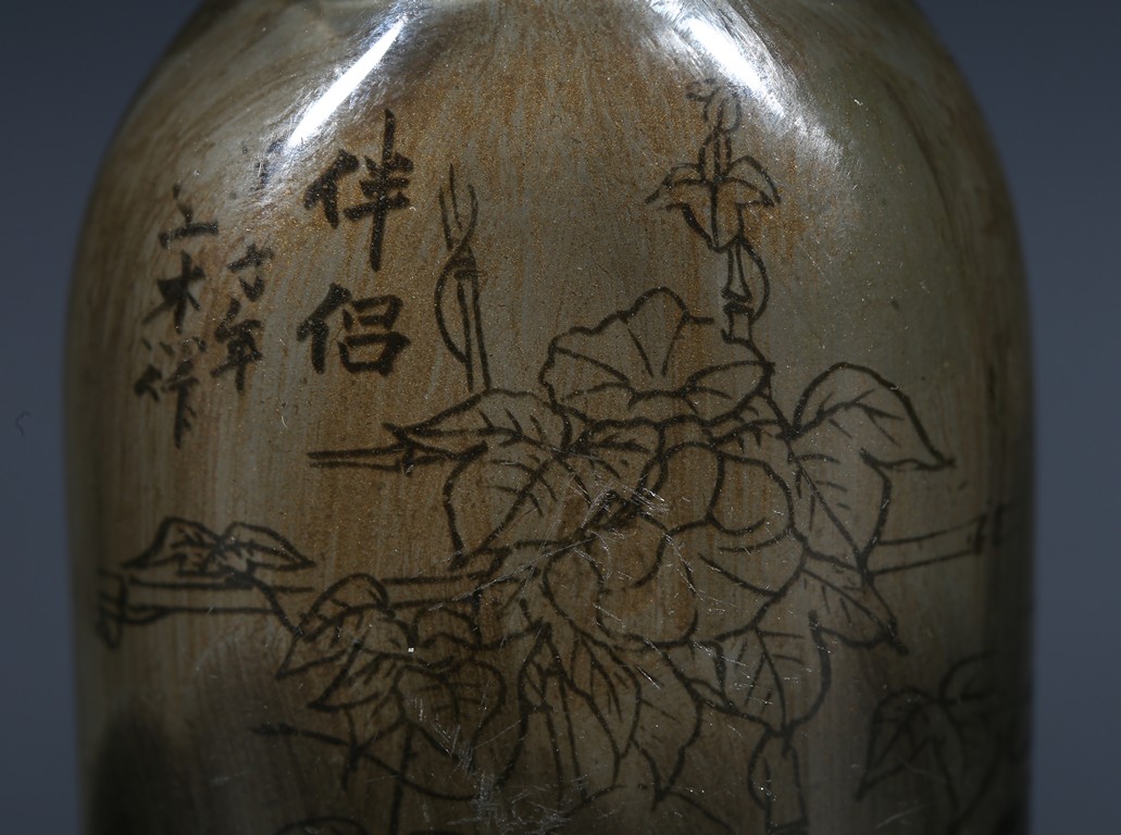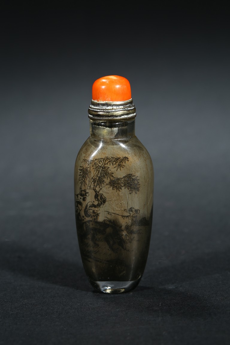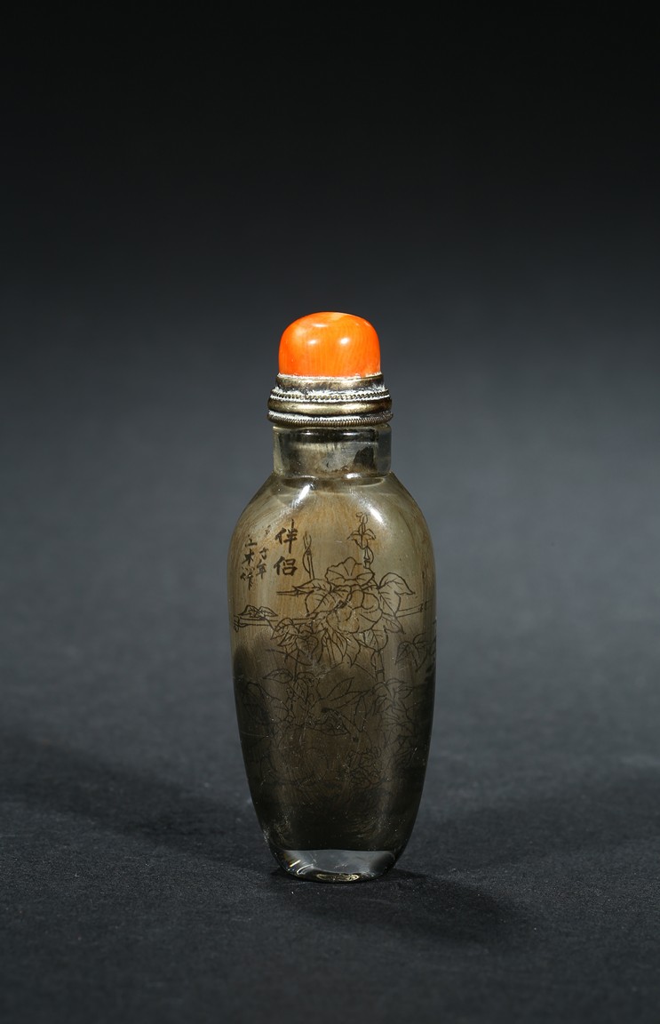The slender snuff bottle painted to the interior with garden scenery and flowers. Qing Dynasty period.