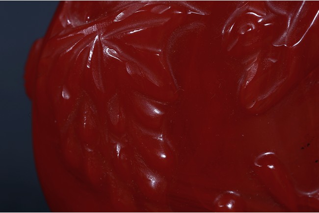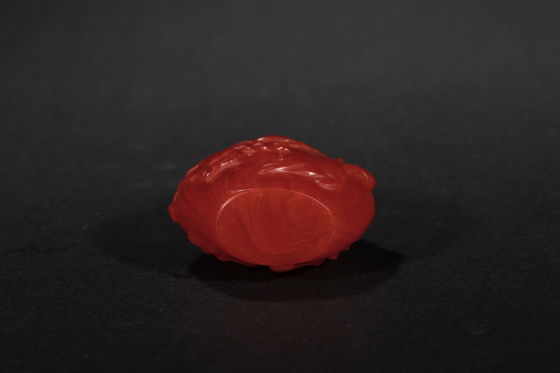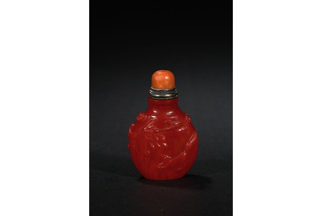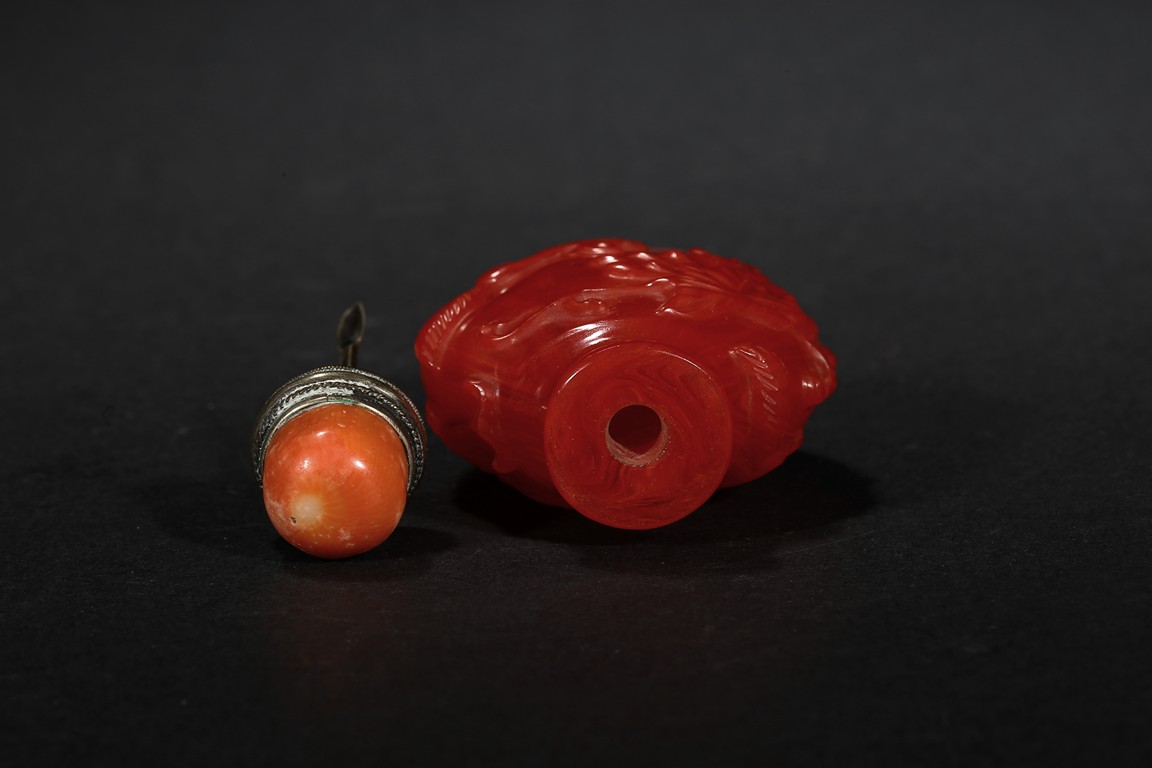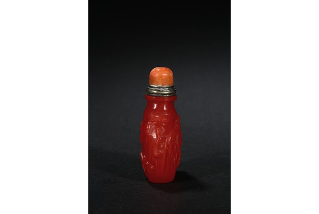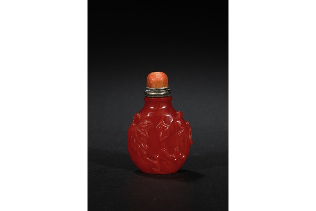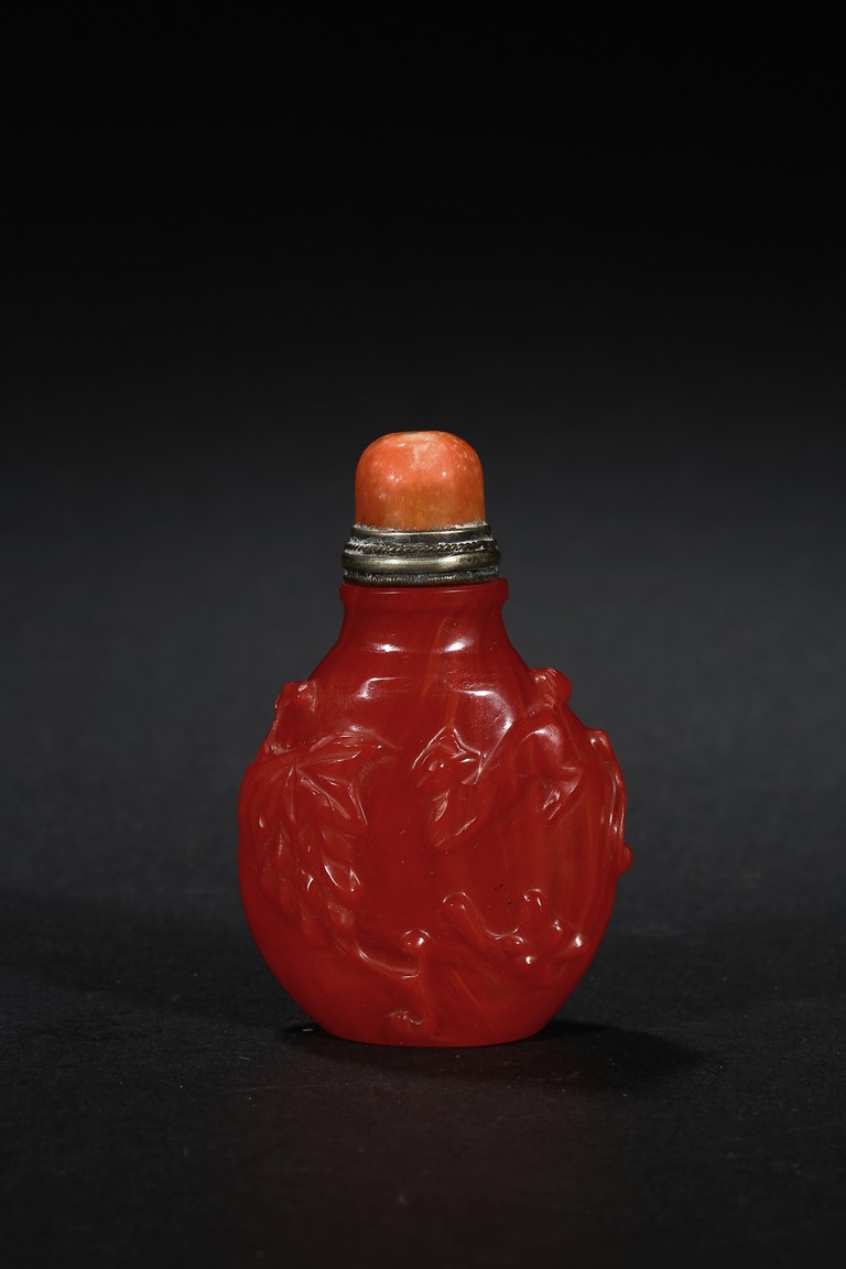 The snuff bottle moulded with squirrell and leafy branch, the glass is of opaque red tone. Qing Dynasty period.