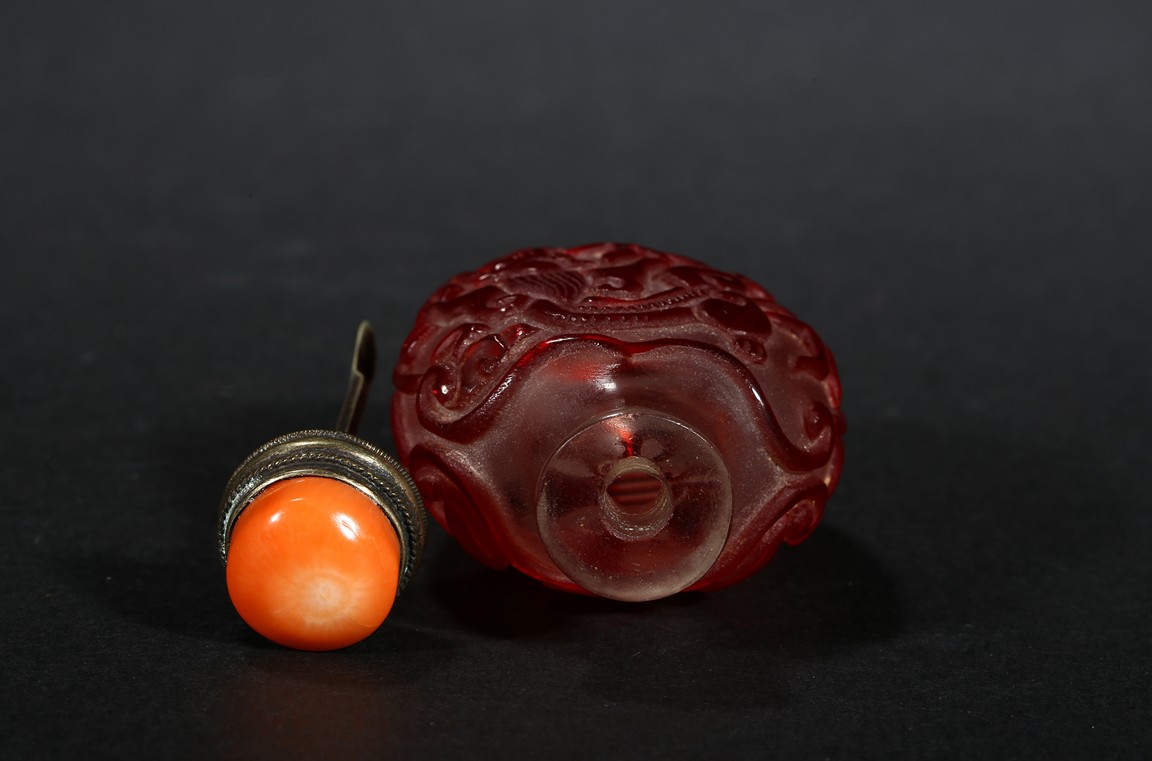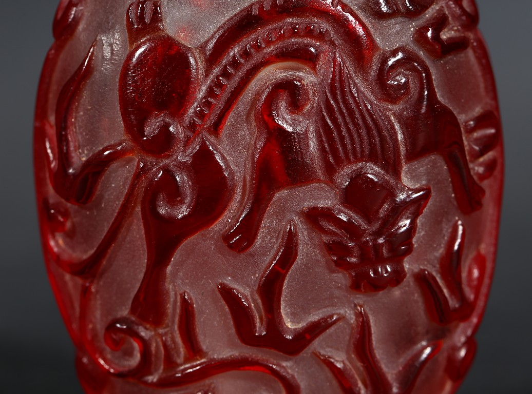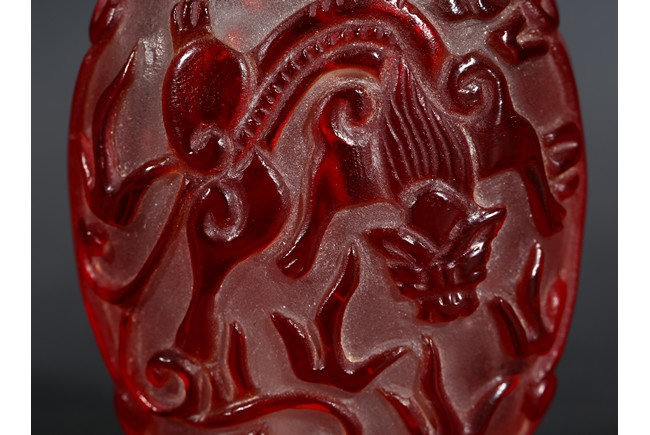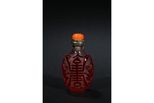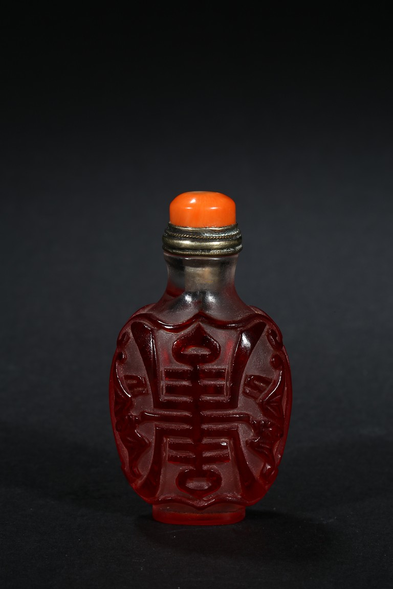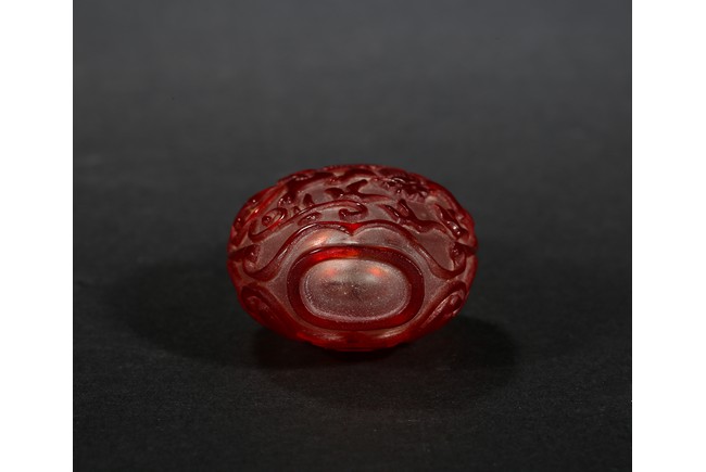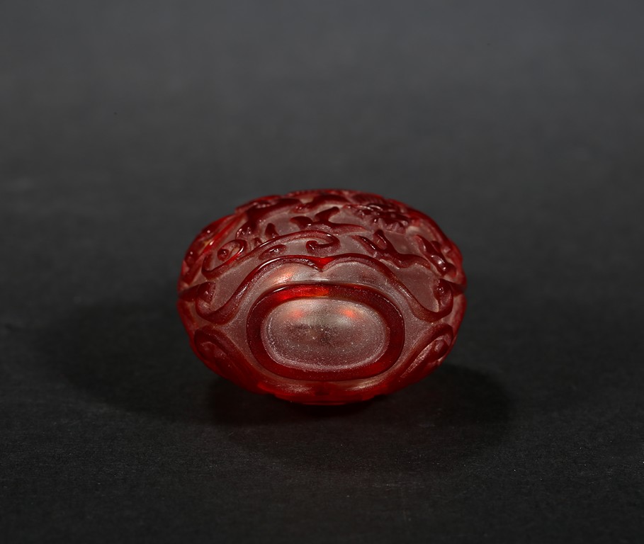 of flattened form, each face overlaid and carved through the red glass depicting a pair of bat confronting a shou character, reserved on translucent glass. Qing Dynasty period.