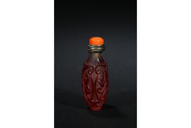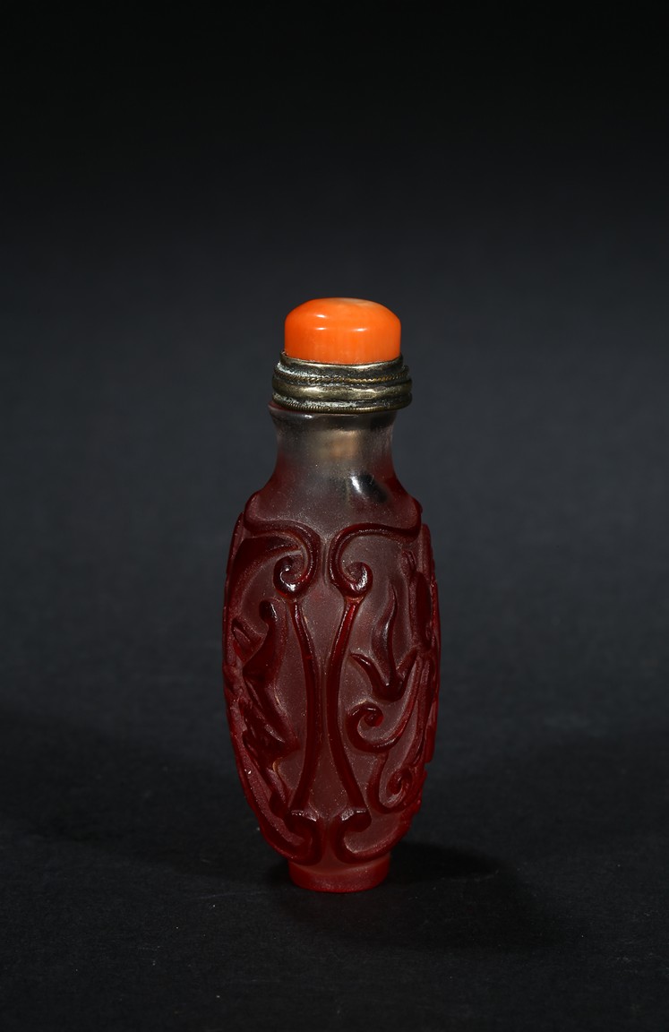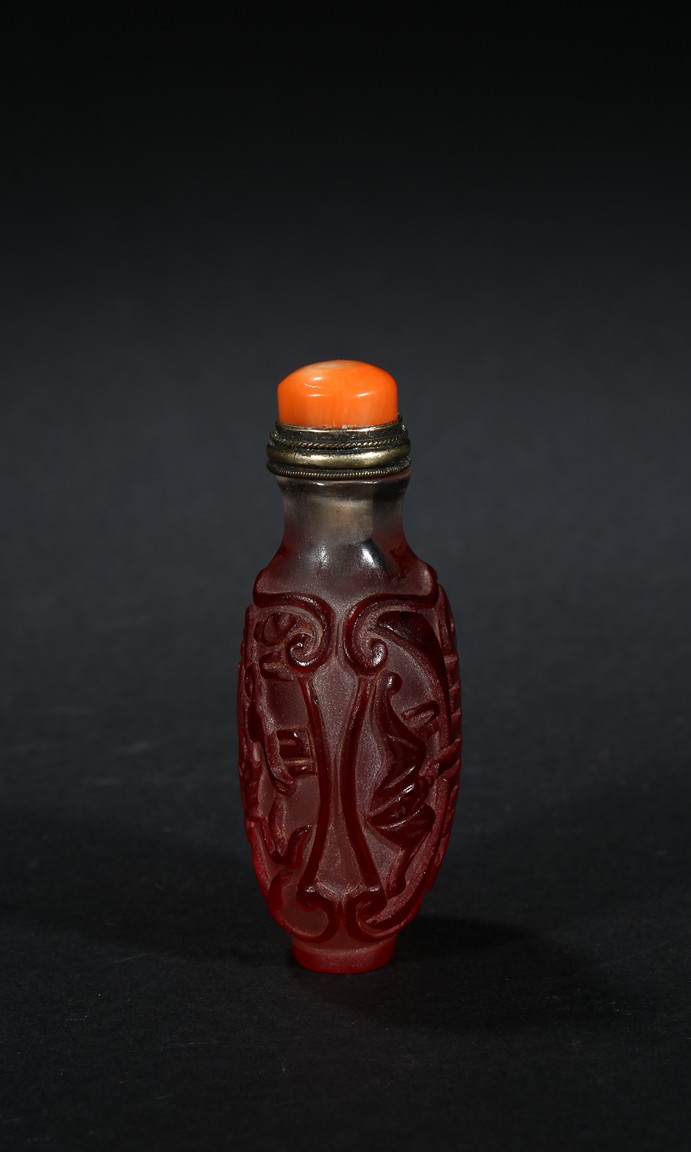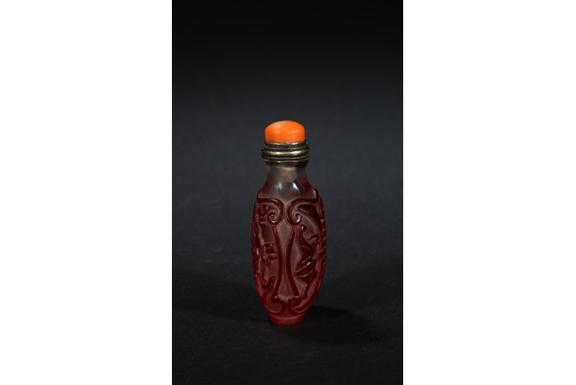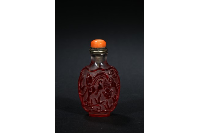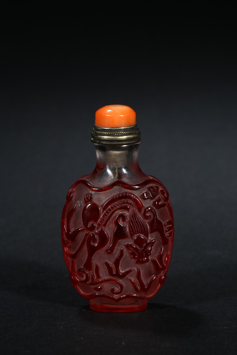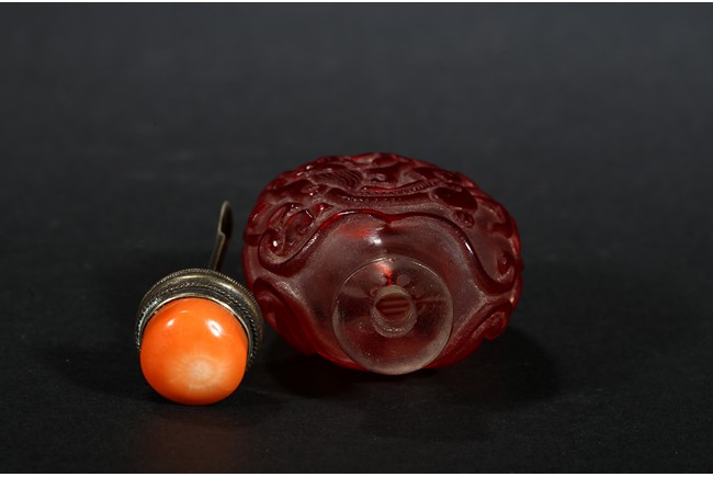 of flattened form, each face overlaid and carved through the red glass depicting a pair of bat confronting a shou character, reserved on translucent glass. Qing Dynasty period.
