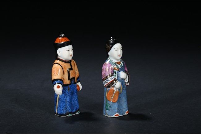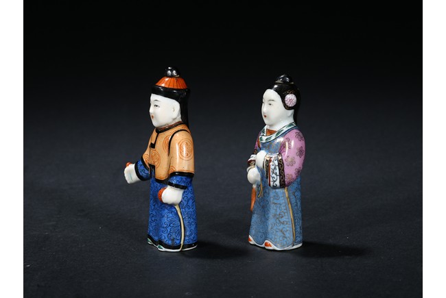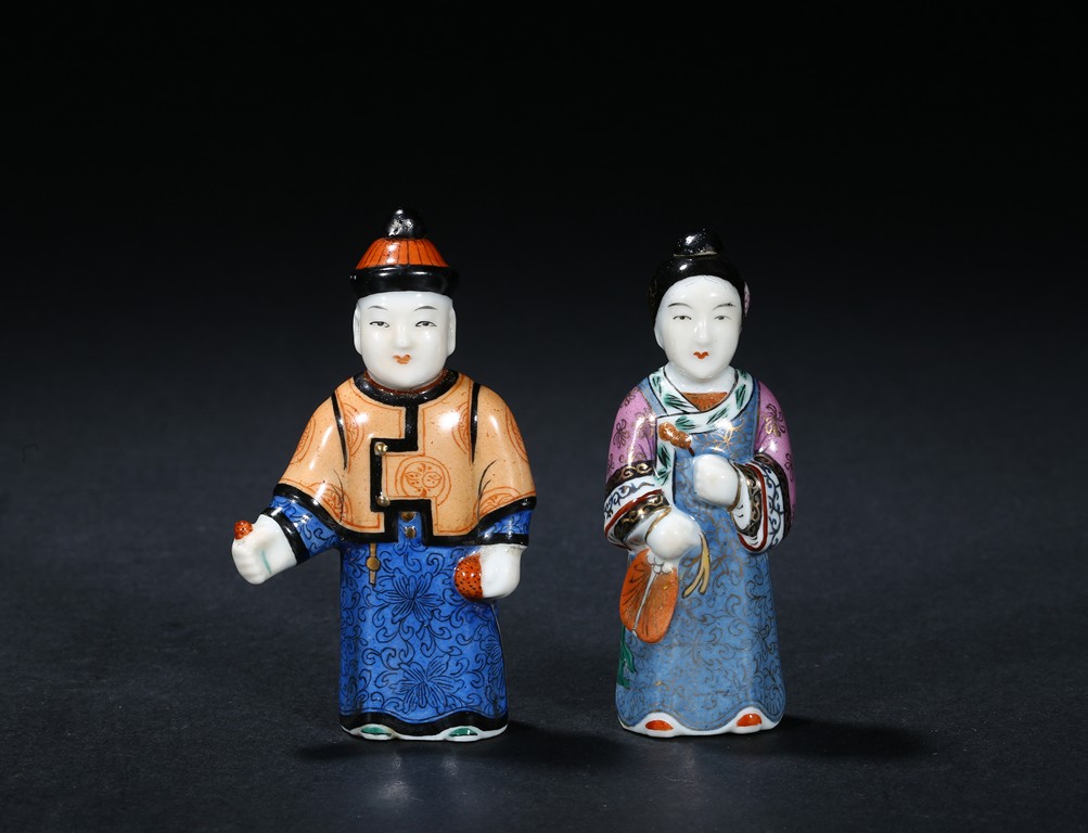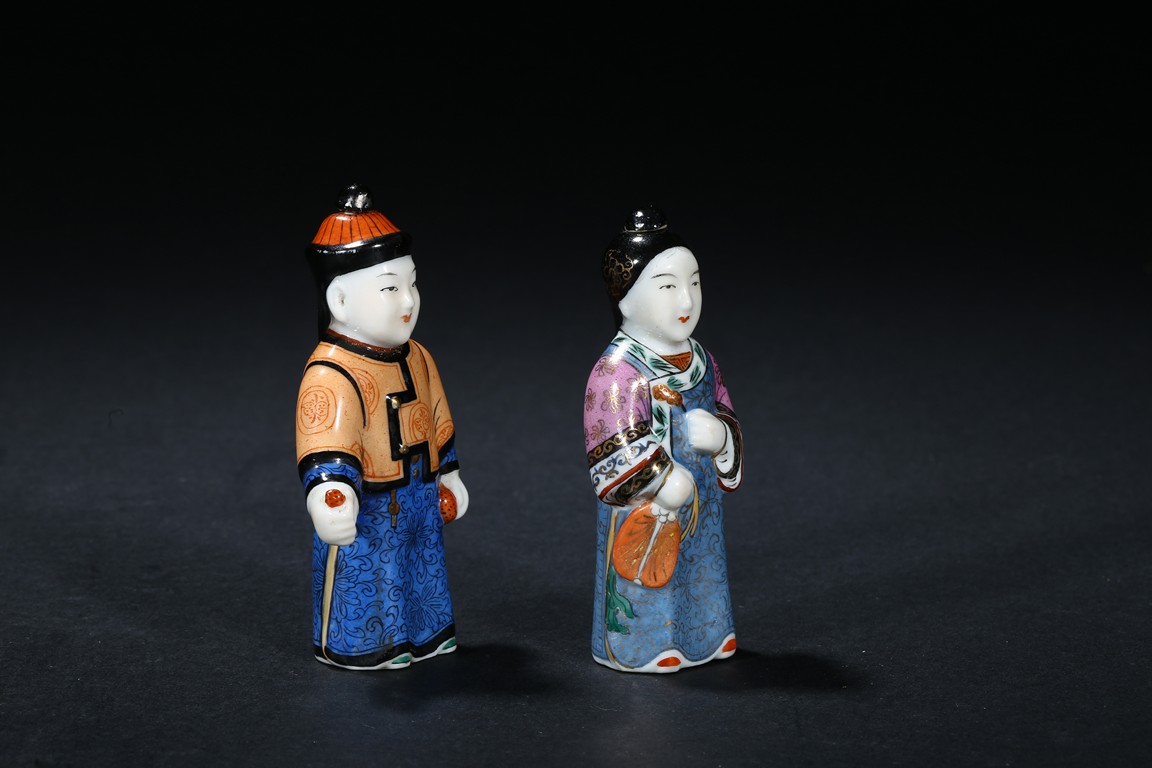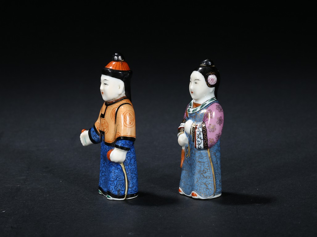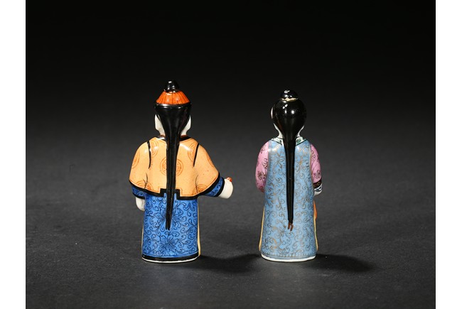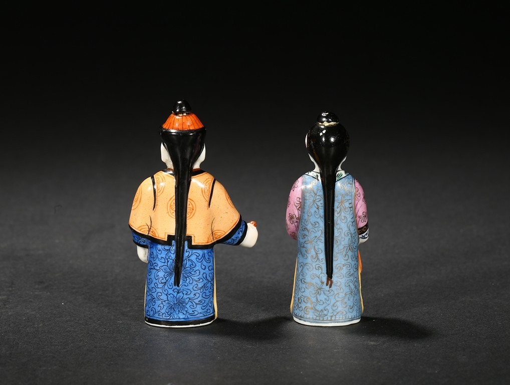 Modelled in the form of a male and female figure, the hat and hair knot as stoppers.