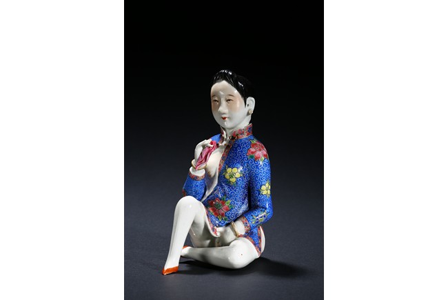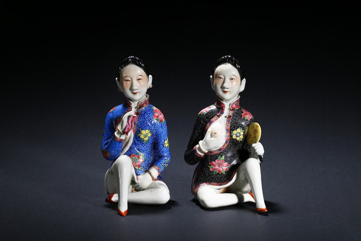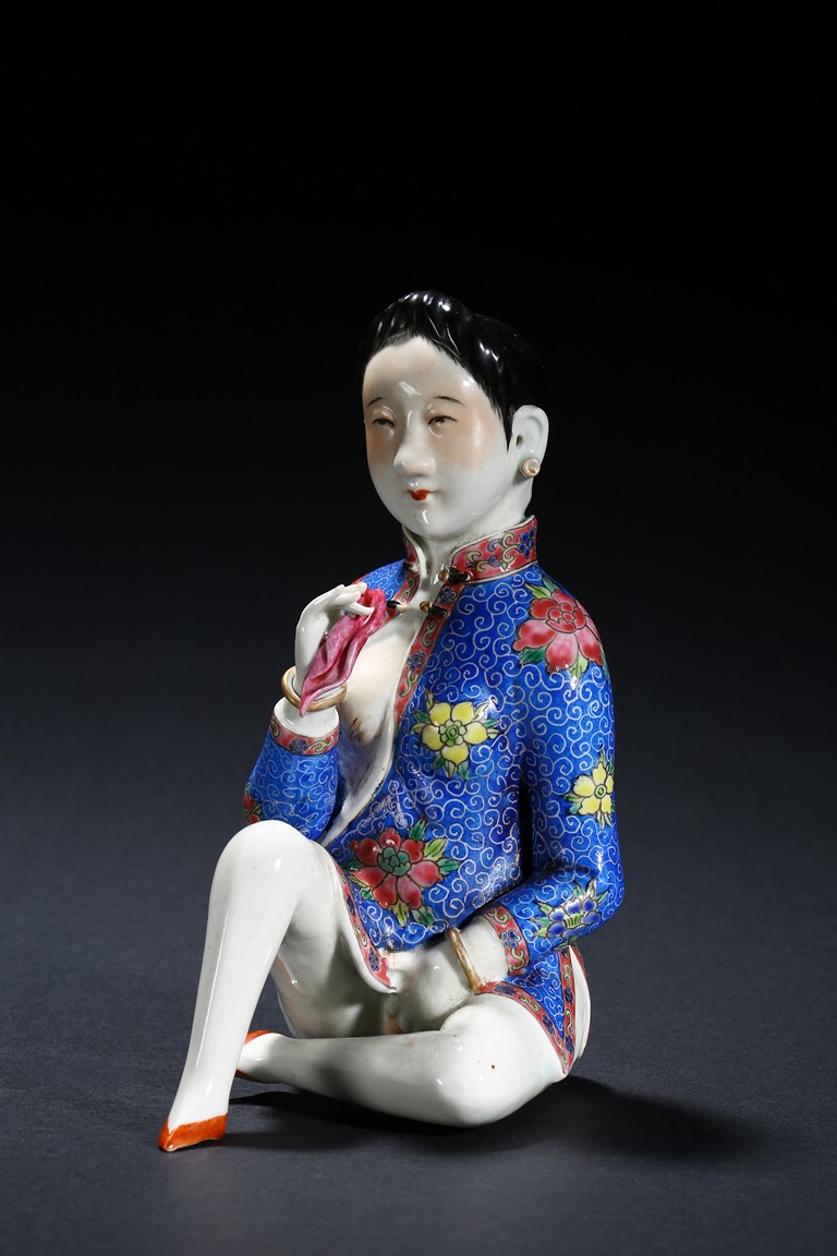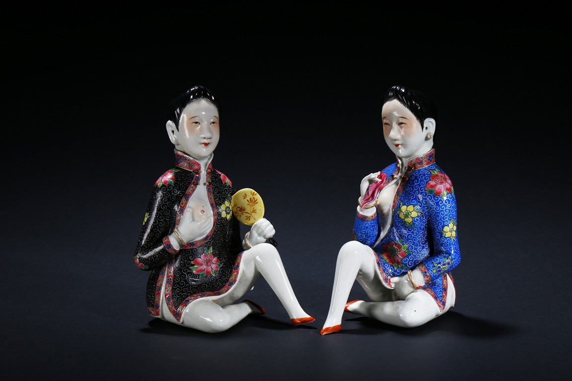 Each lady figure is nearly identical, all wearing qipao robe decorated with floral design, seated with one knee raised, in different erotic posture. Late Qing Dynasty period.