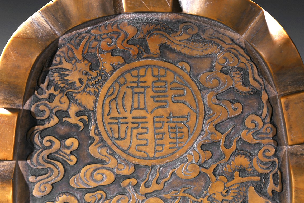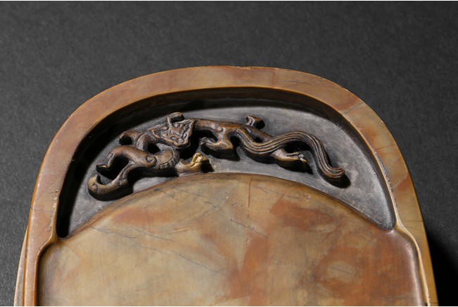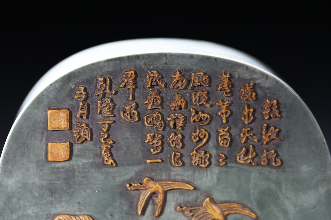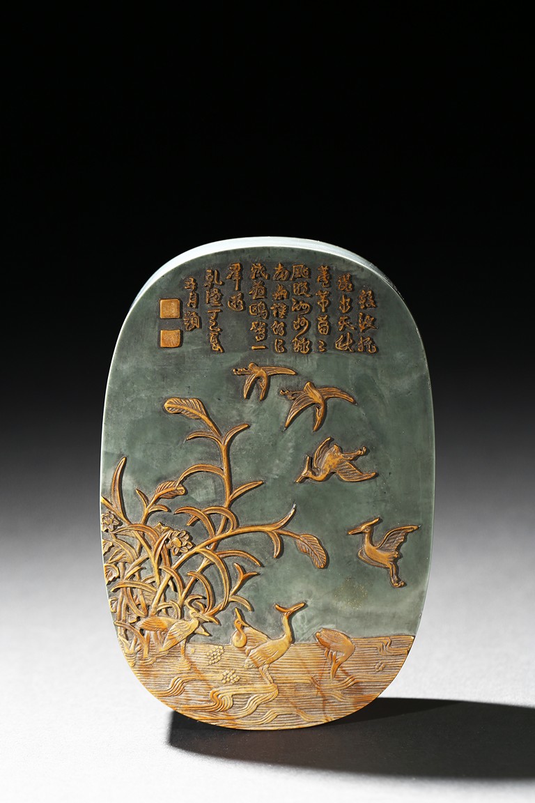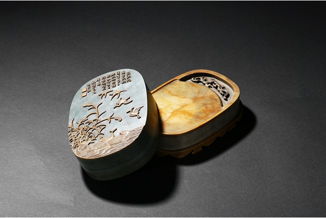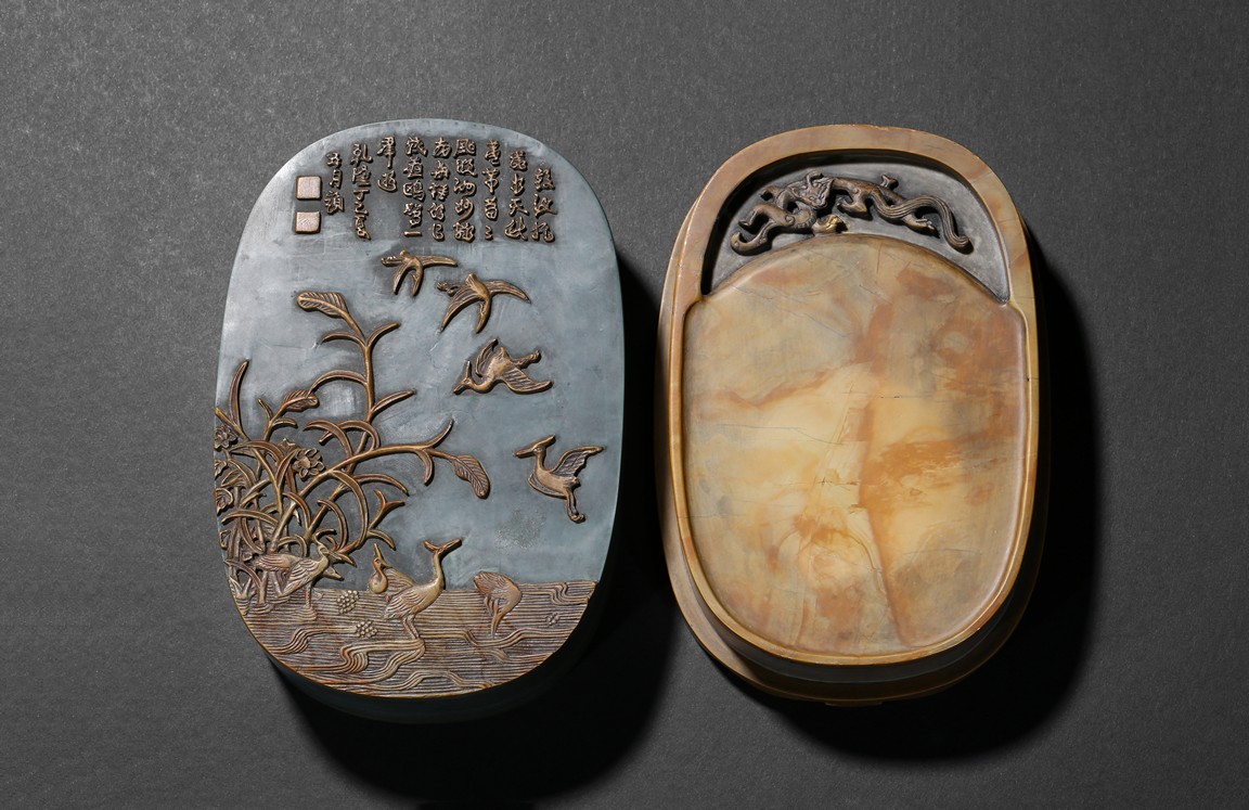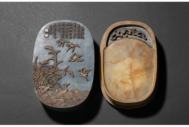 Of oval shape, the smooth grinding face carved in relief with sinuous chilong inside the recessed inkwell, the reverse vertically incised with two square seal marks surrounded by dragon chasing flaming pearl within auspicious clouds, the cover inscribed with running script poem above the scene of cranes and orchids, the stone of a mottled yellow and russet tone. Qing Dynasty period.