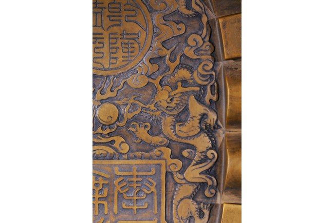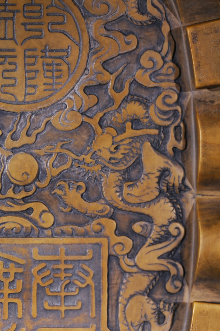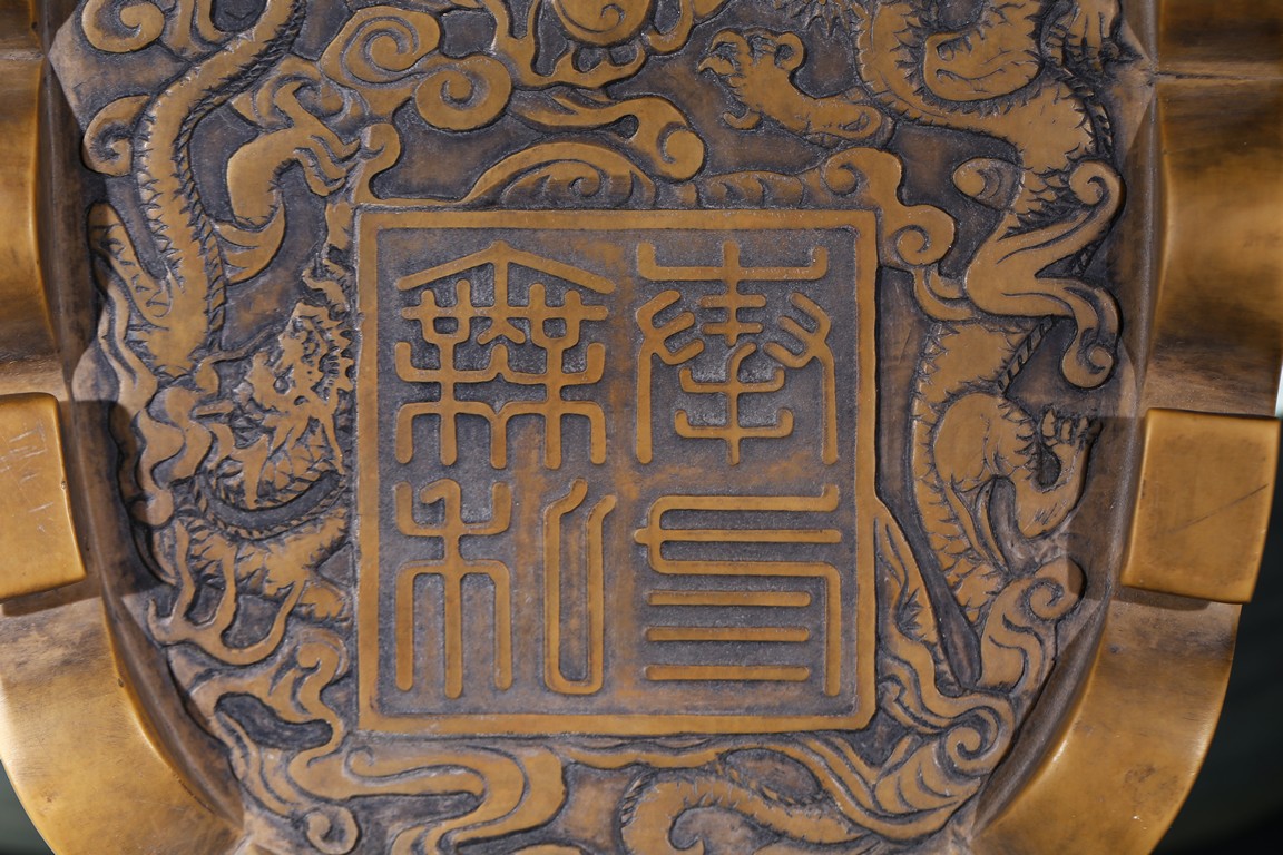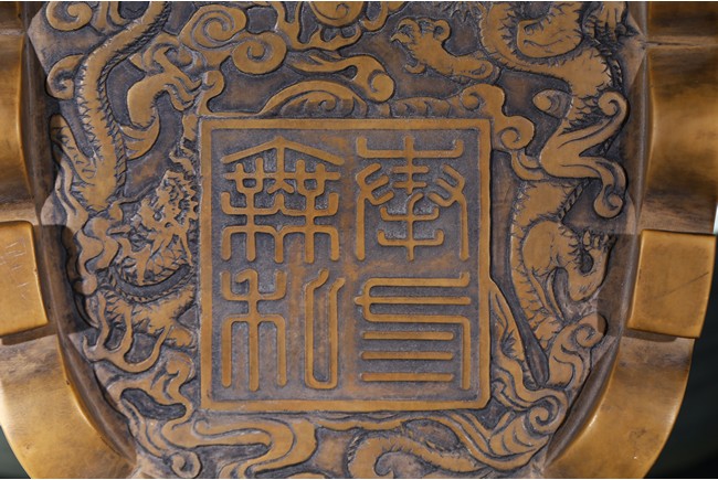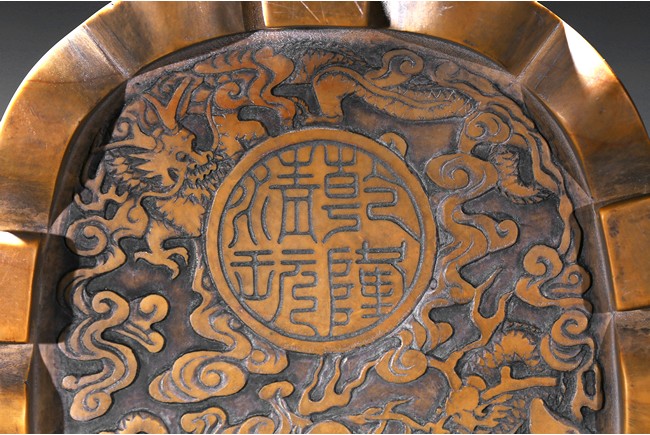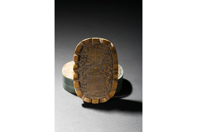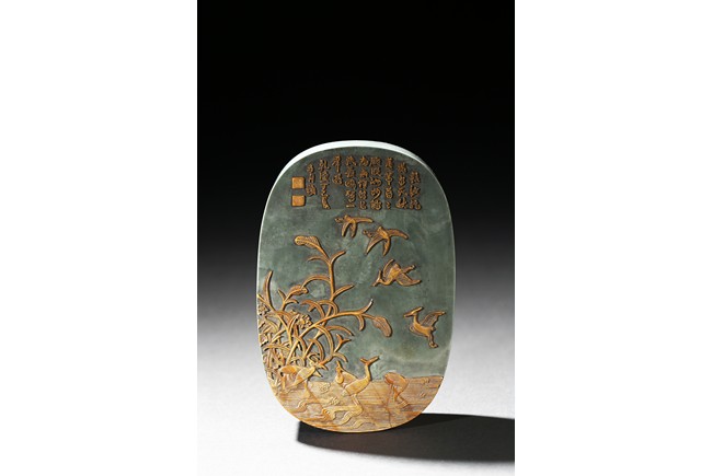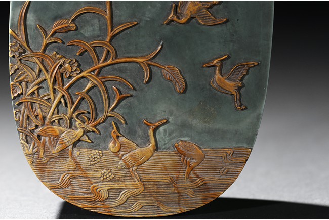 Of oval shape, the smooth grinding face carved in relief with sinuous chilong inside the recessed inkwell, the reverse vertically incised with two square seal marks surrounded by dragon chasing flaming pearl within auspicious clouds, the cover inscribed with running script poem above the scene of cranes and orchids, the stone of a mottled yellow and russet tone. Qing Dynasty period.