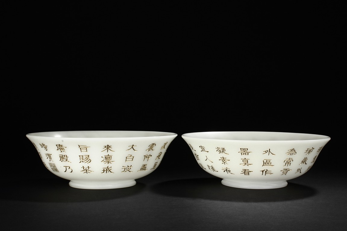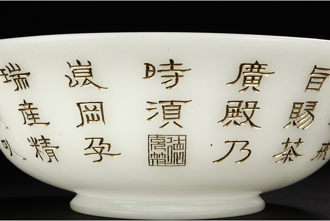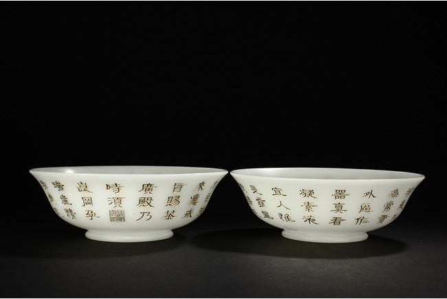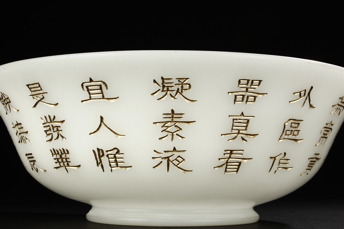 The shallow bowls curves elegantly, supported by splayed ring foot, the body gilt with poetry calligraphy and artist mark, all on top of smooth white glass, and the bottom bears four character QIANLONG' mark. Qing Dynasty Period.