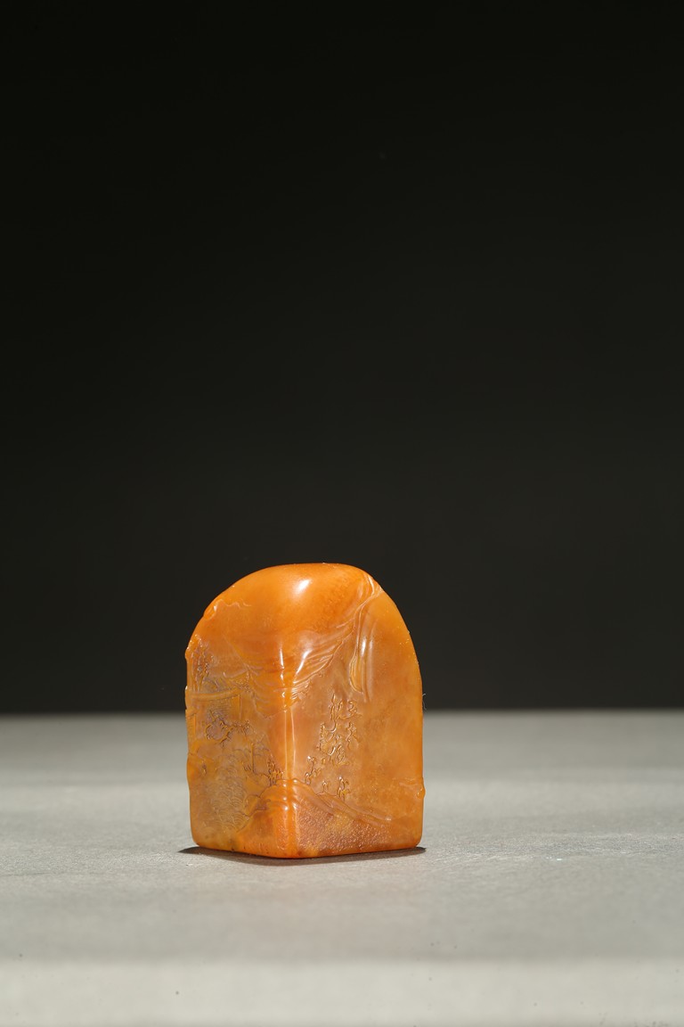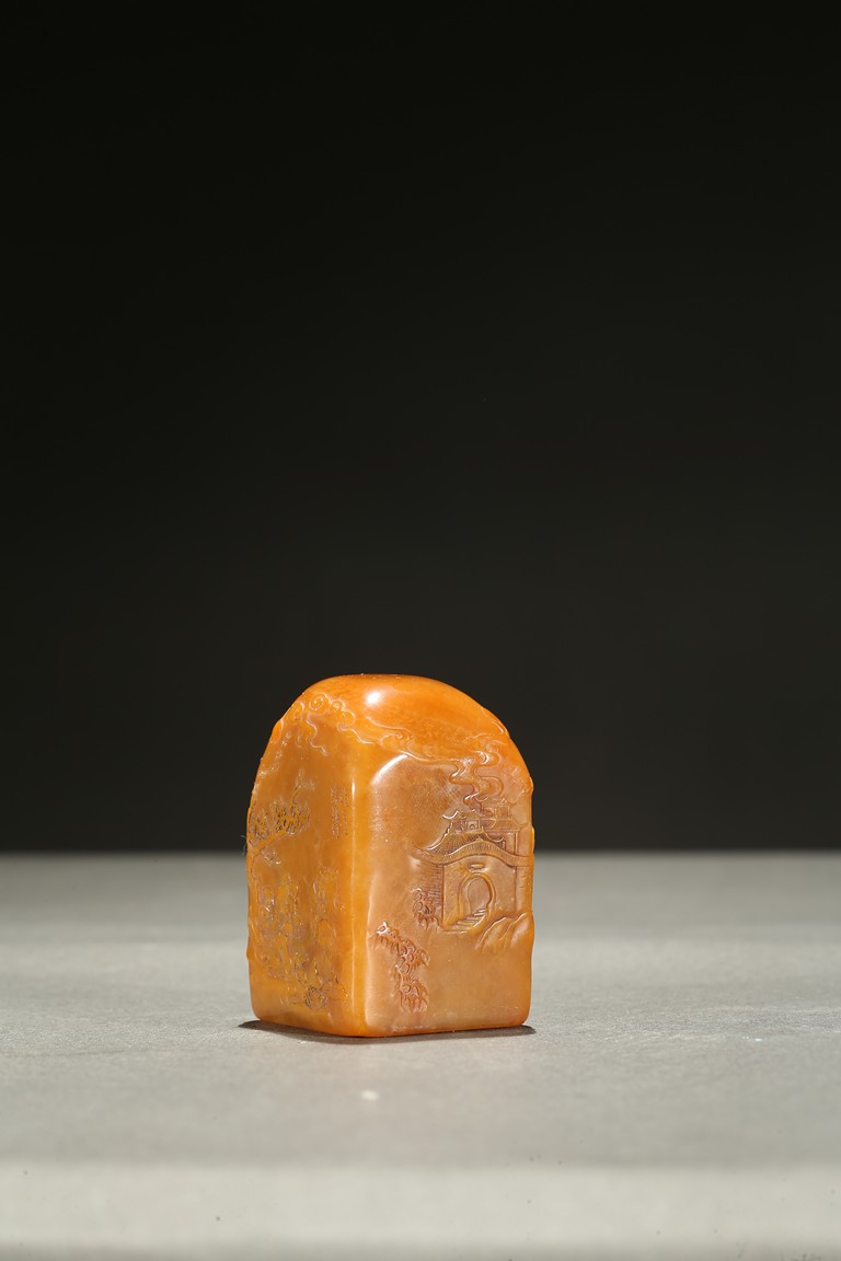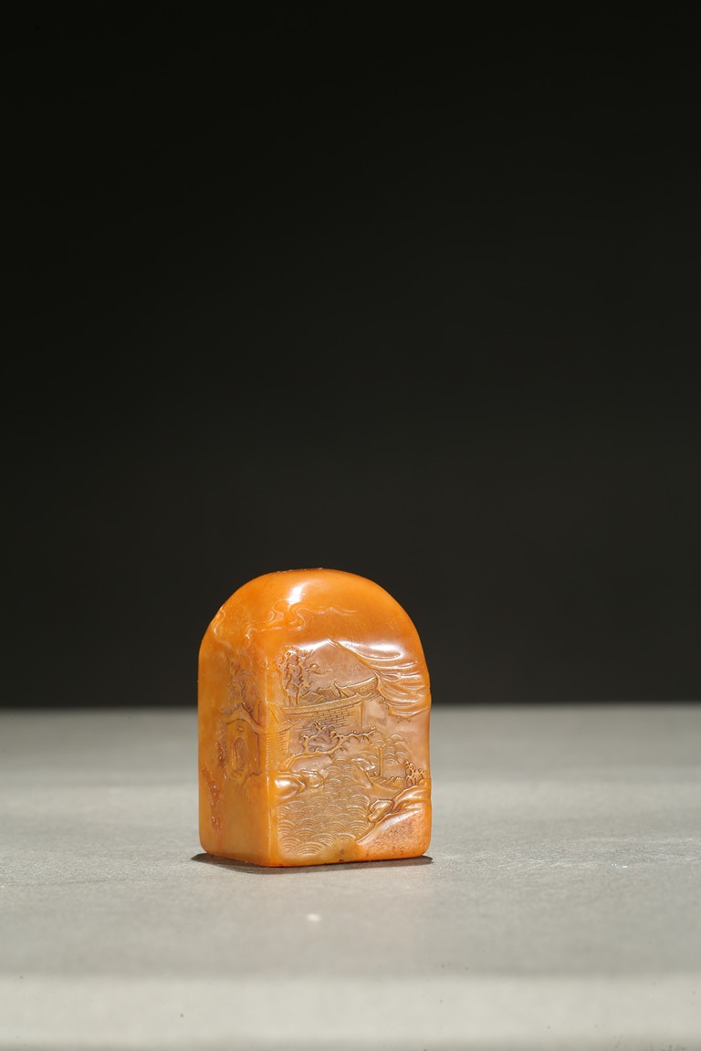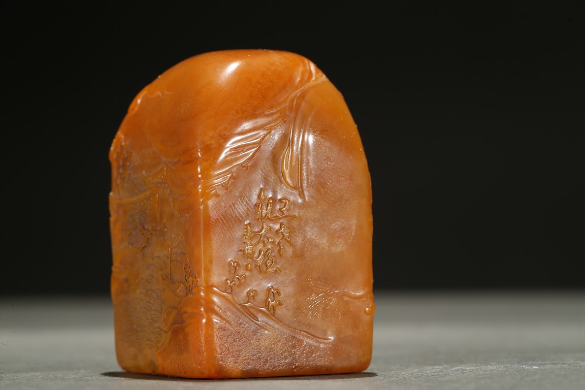 The seal carved on each side depicting a continuous scene of immortals conversing under a large tree and boat and houses on riverbank, with inscriptions, the seal surface carved. Qing Dynasty period.