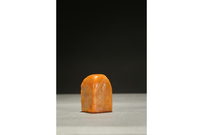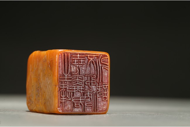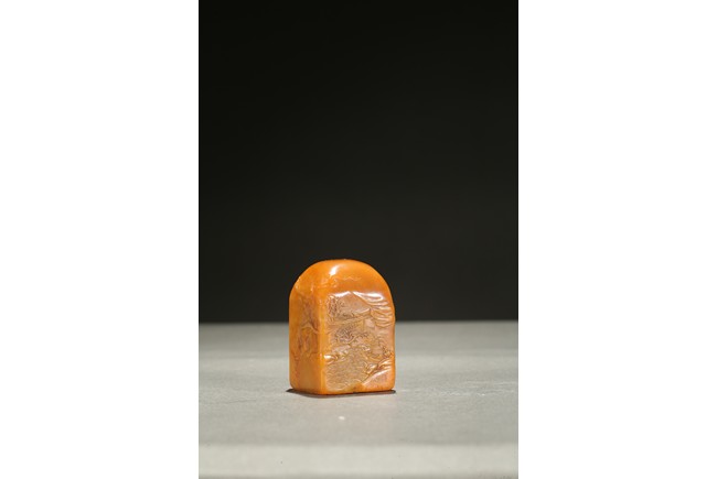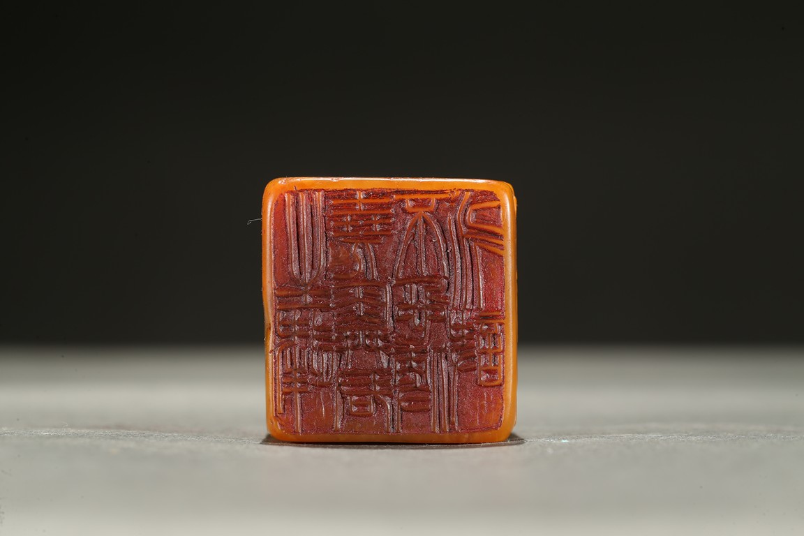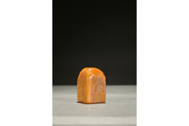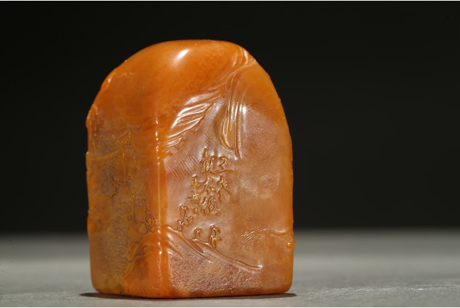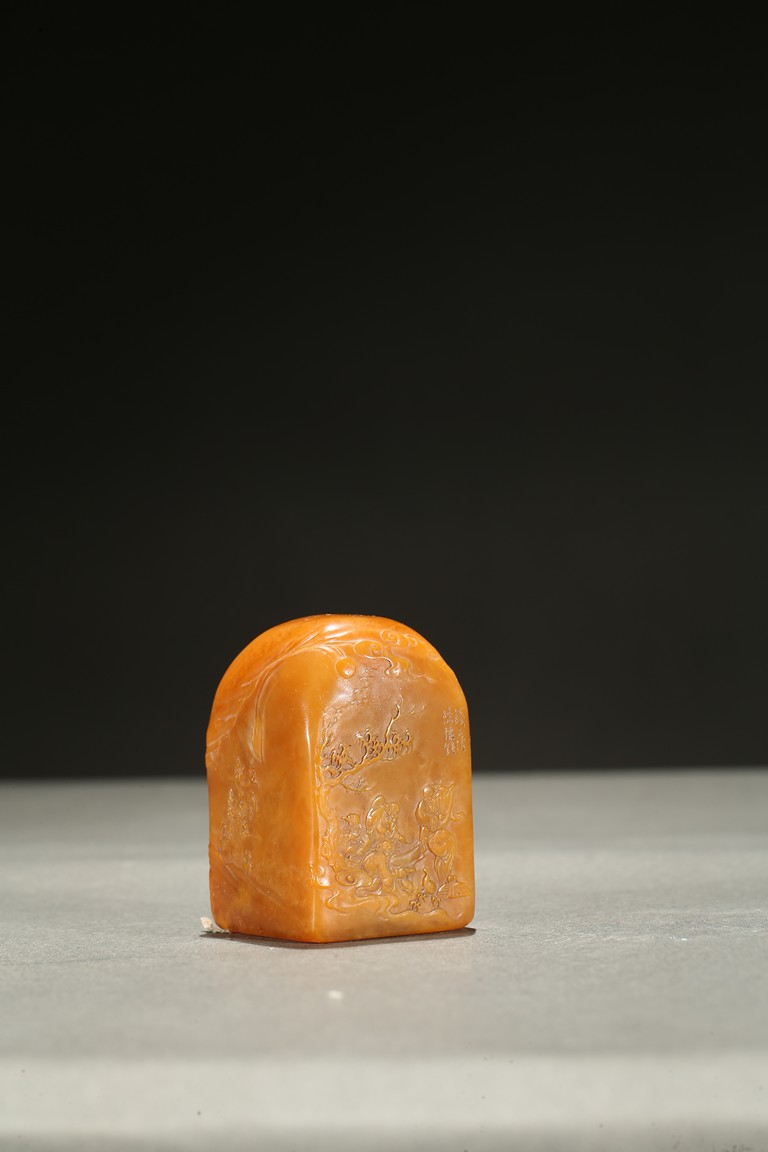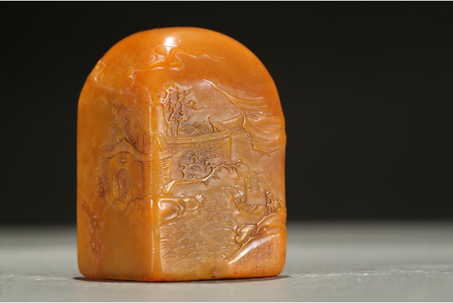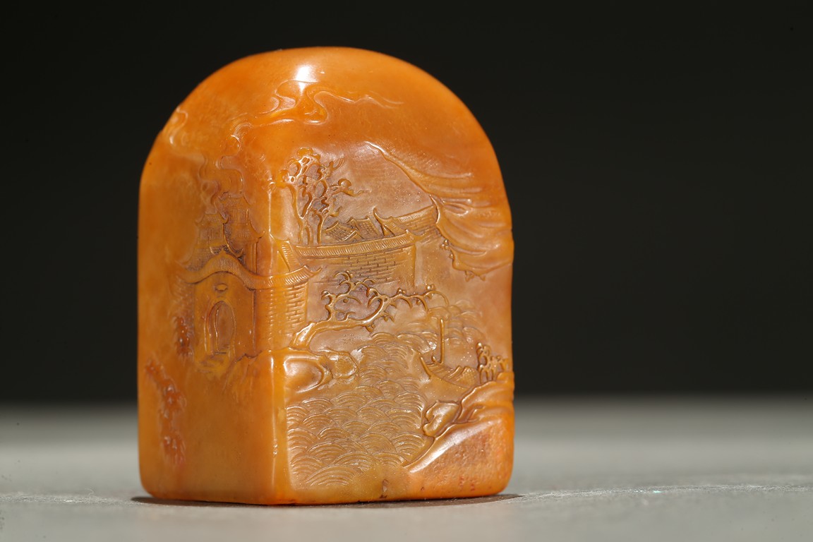 The seal carved on each side depicting a continuous scene of immortals conversing under a large tree and boat and houses on riverbank, with inscriptions, the seal surface carved. Qing Dynasty period.
