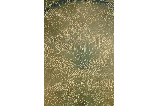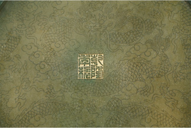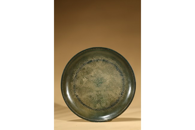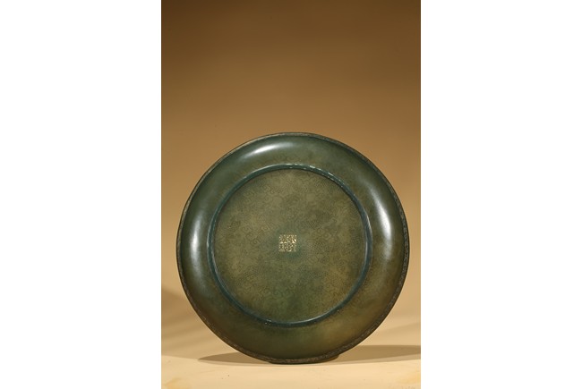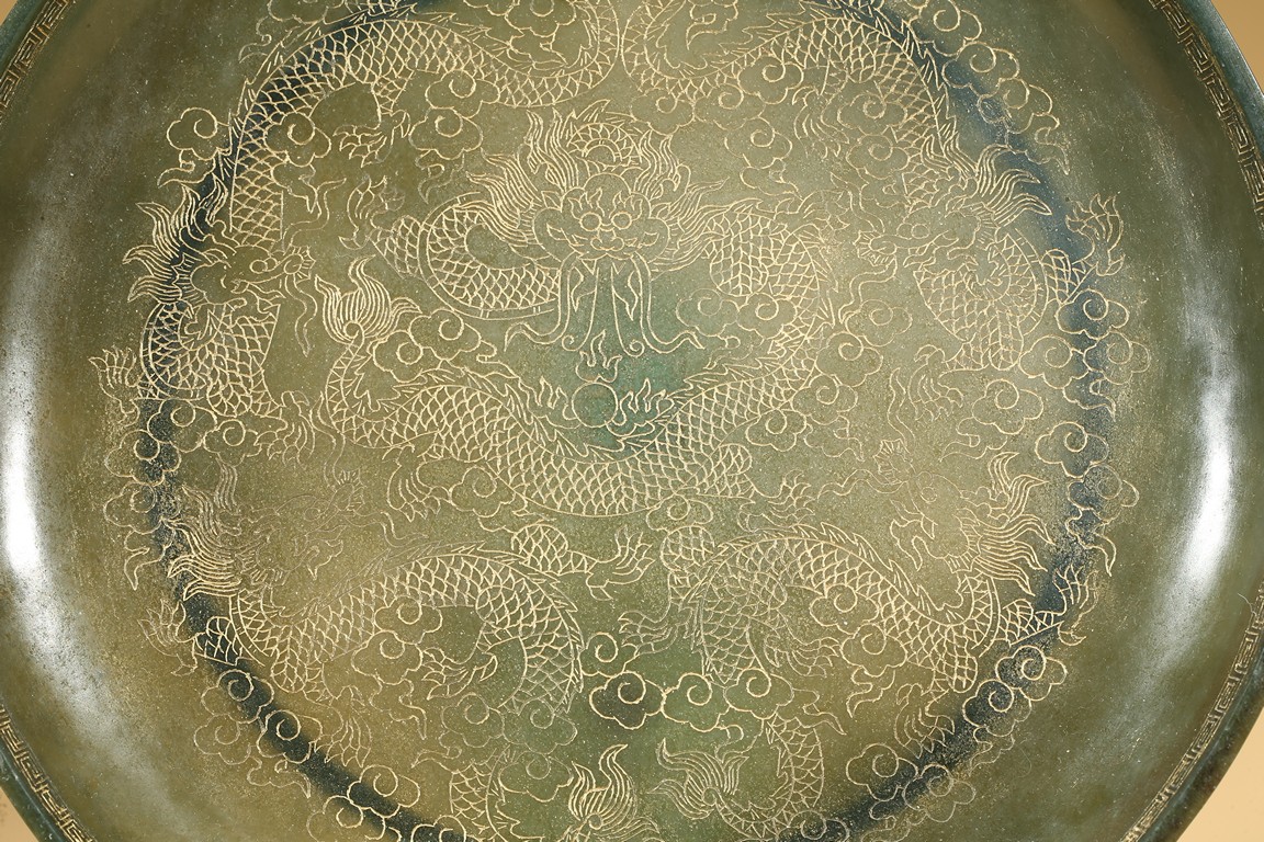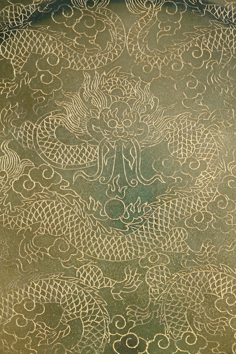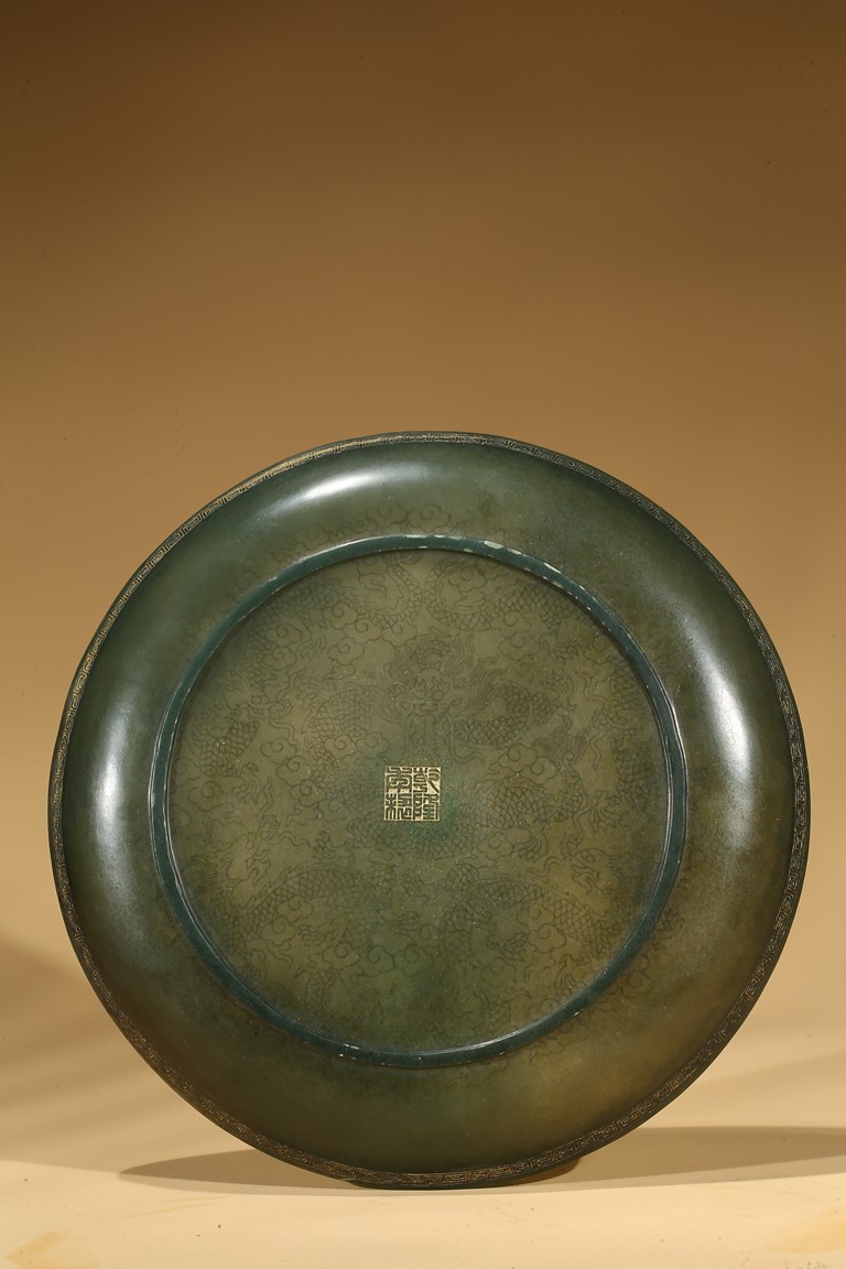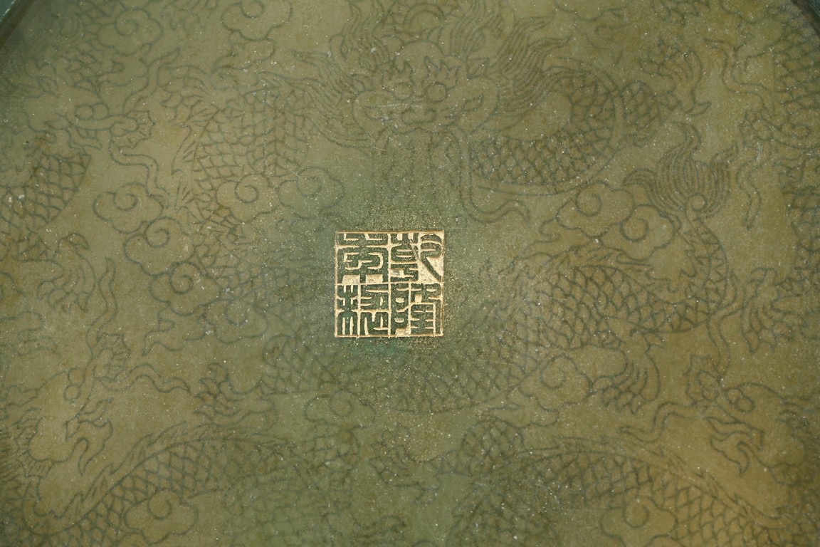 The shallow circular dish with flared rim, the interior delicately incised and picked out in gold with a large dragon motif, the base with a mark, the stone is of attractively translucent green tone.