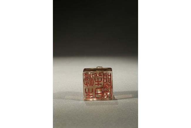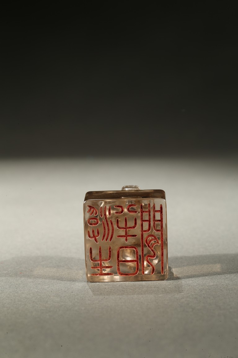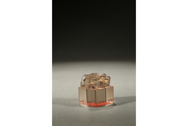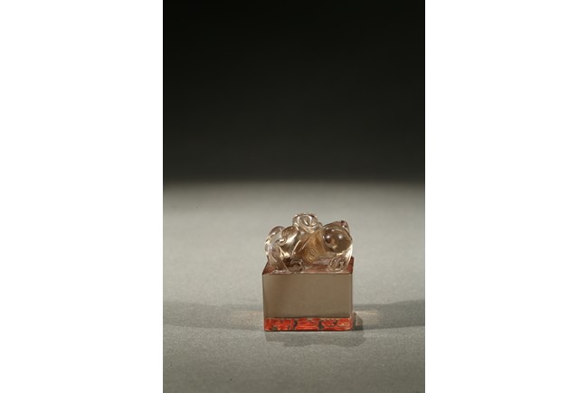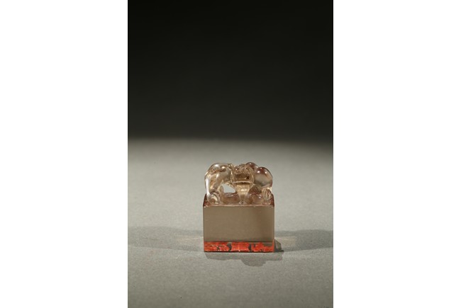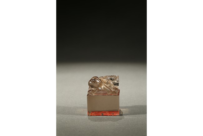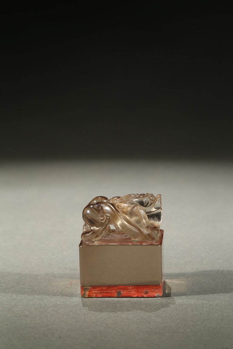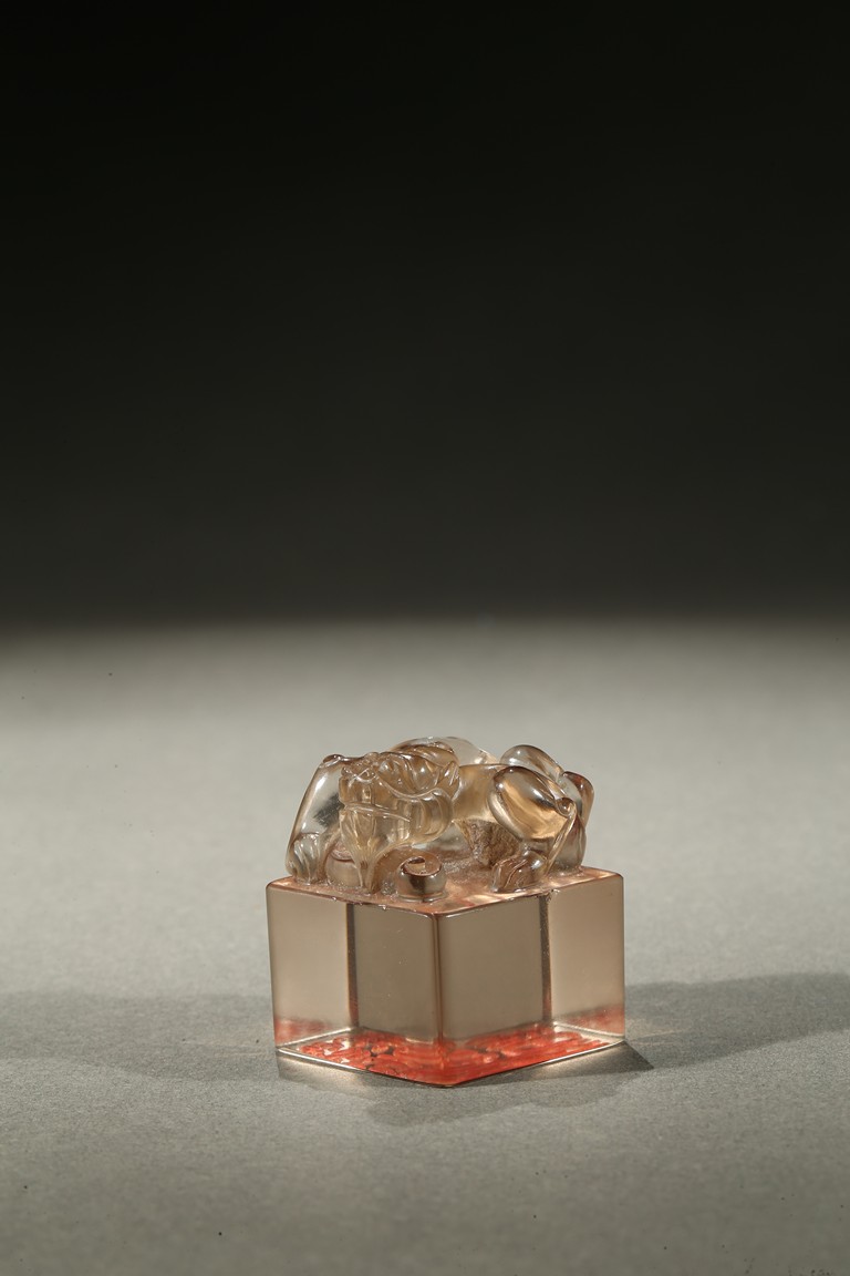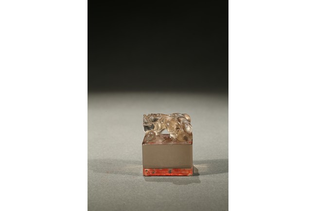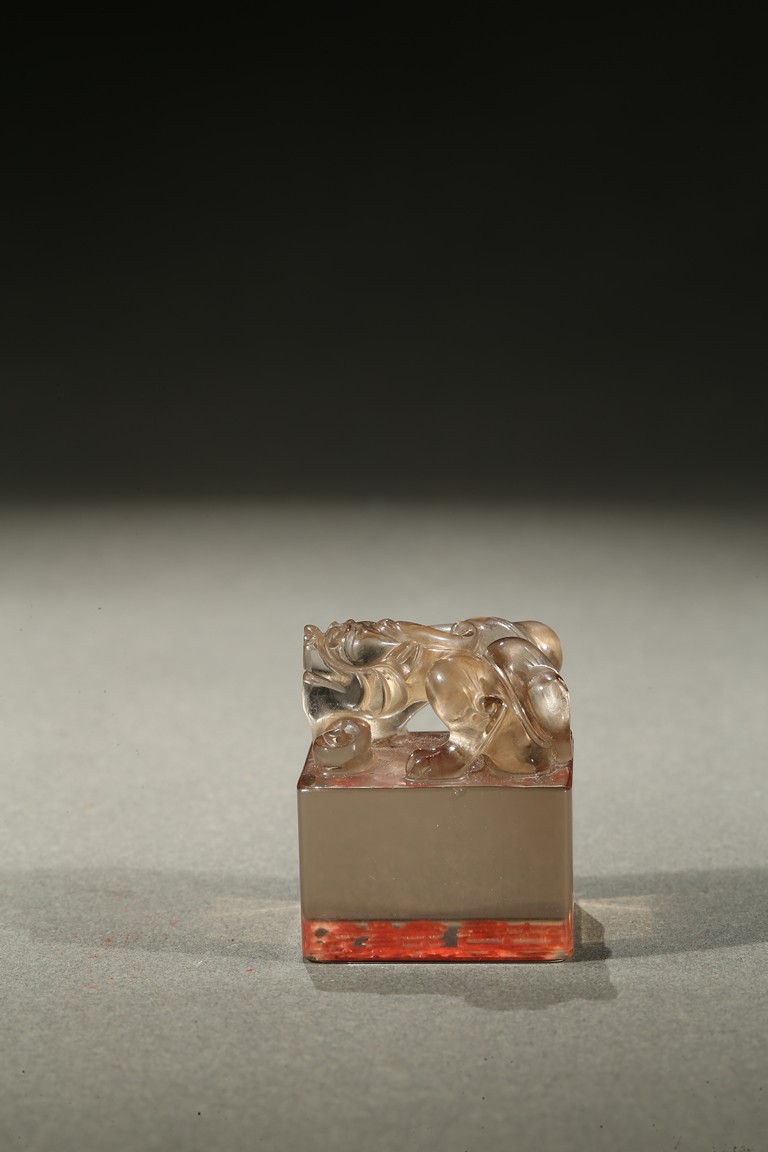 Of square section, the top surmounted with a seated mythical beast, seal surface carved with six characters. Qing Dynasty period.