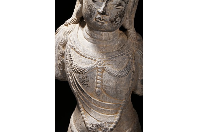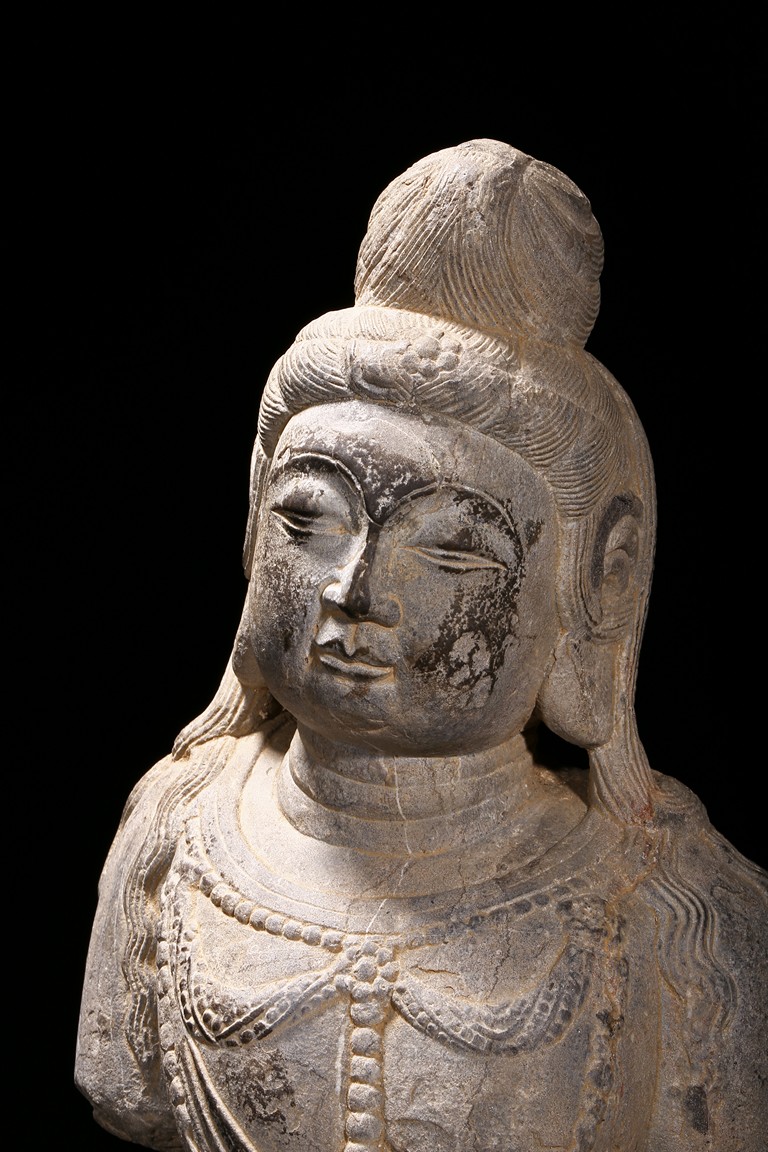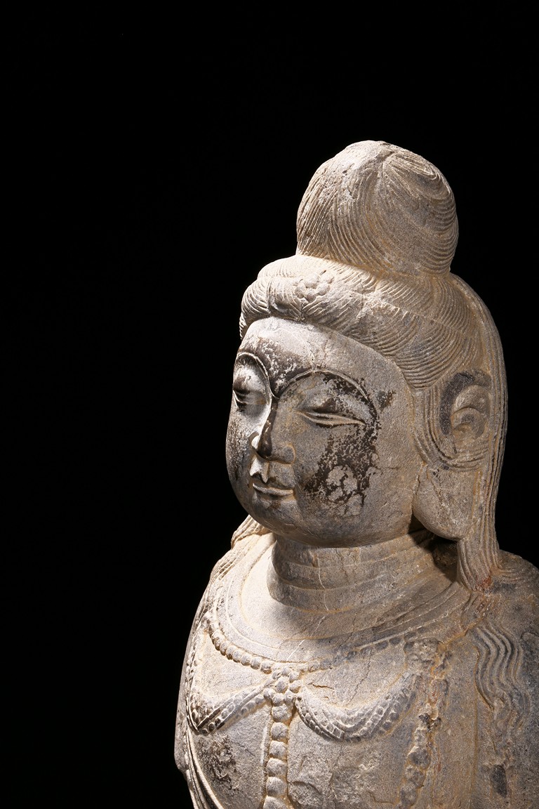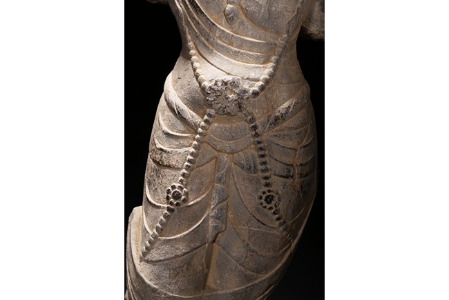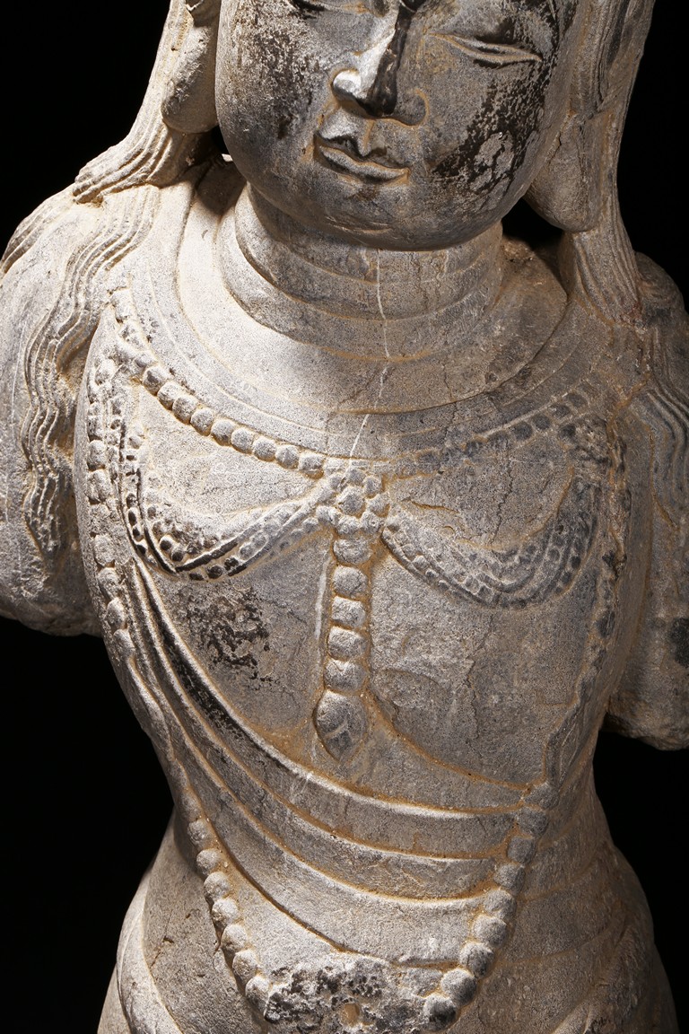 The bodhisattva is dressed in a dhoti with a knotted sash falling to the knees, a pleated shawl draped around the shoulders, falling over arms and sides, the folds gathering at the feet, adorned with bejewelled necklaces, face with a serene countenance below a high topknot.