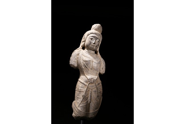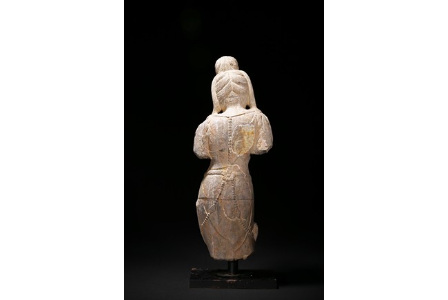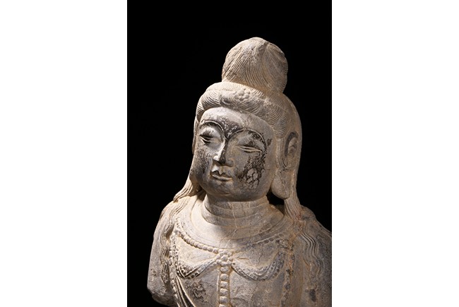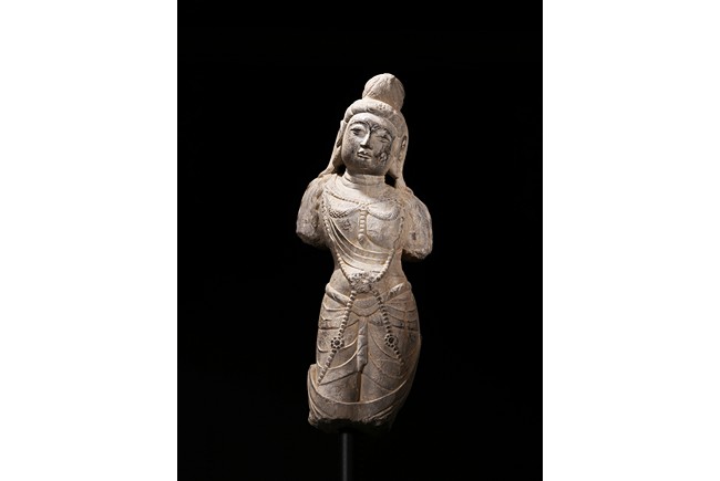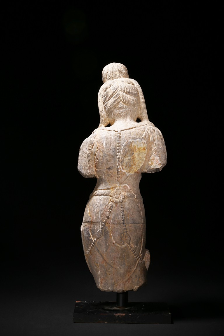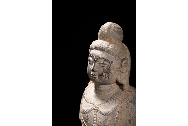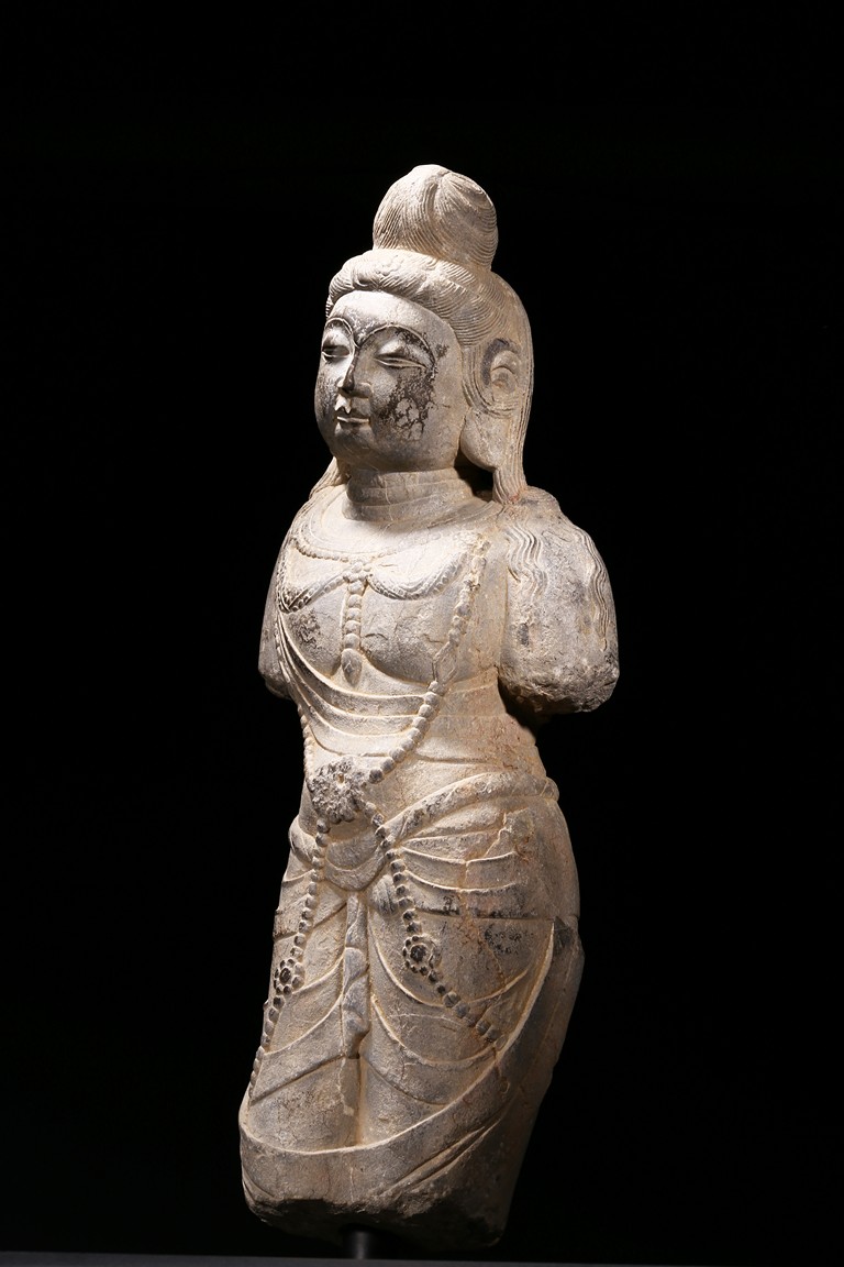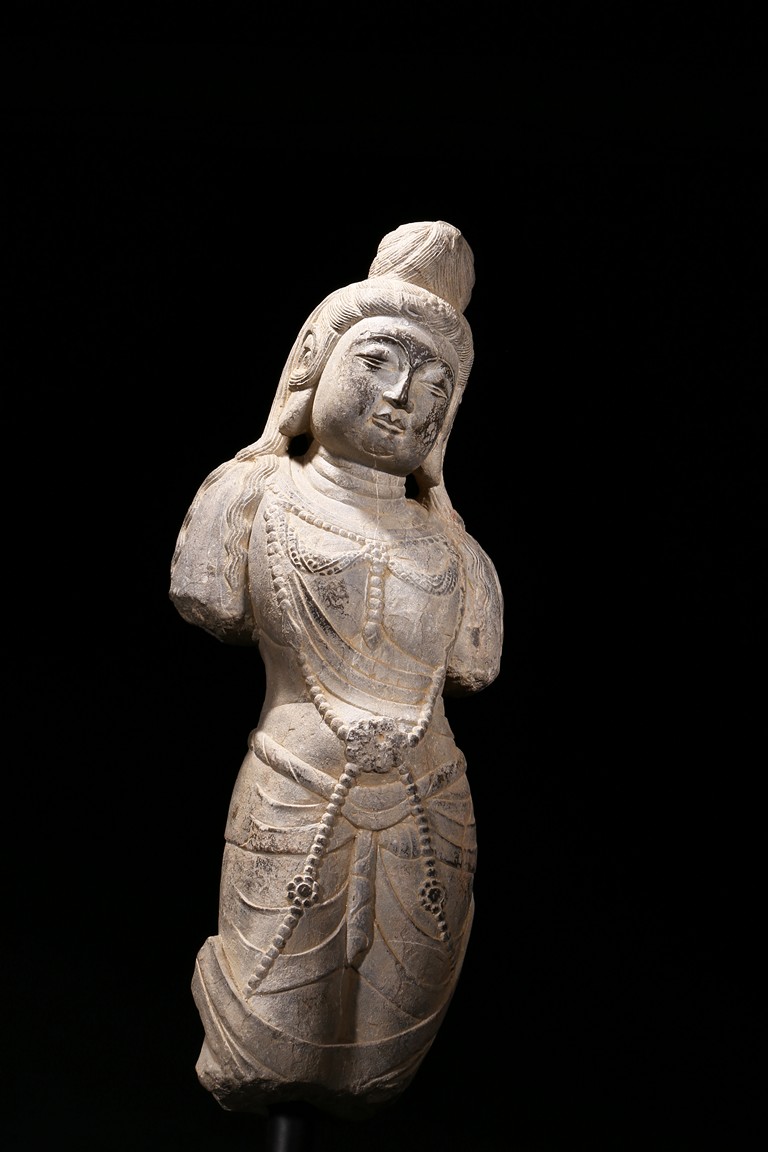 The bodhisattva is dressed in a dhoti with a knotted sash falling to the knees, a pleated shawl draped around the shoulders, falling over arms and sides, the folds gathering at the feet, adorned with bejewelled necklaces, face with a serene countenance below a high topknot.