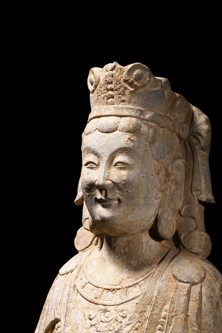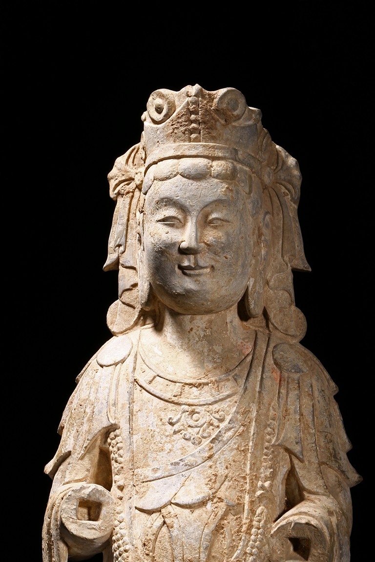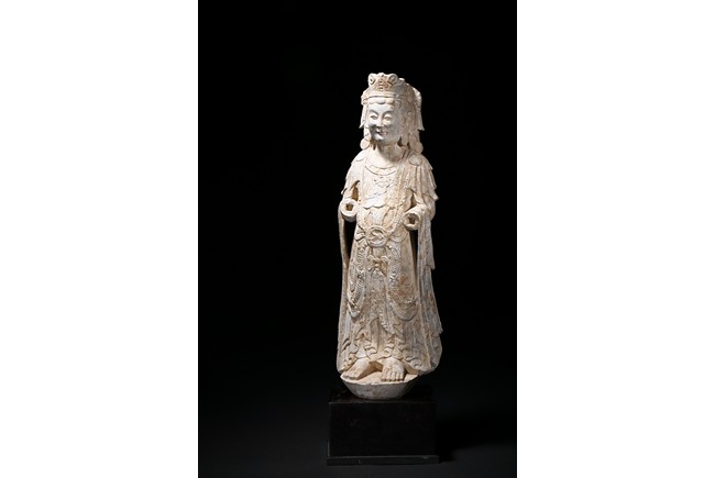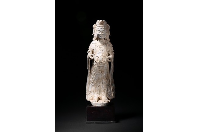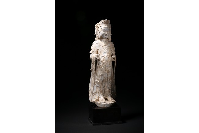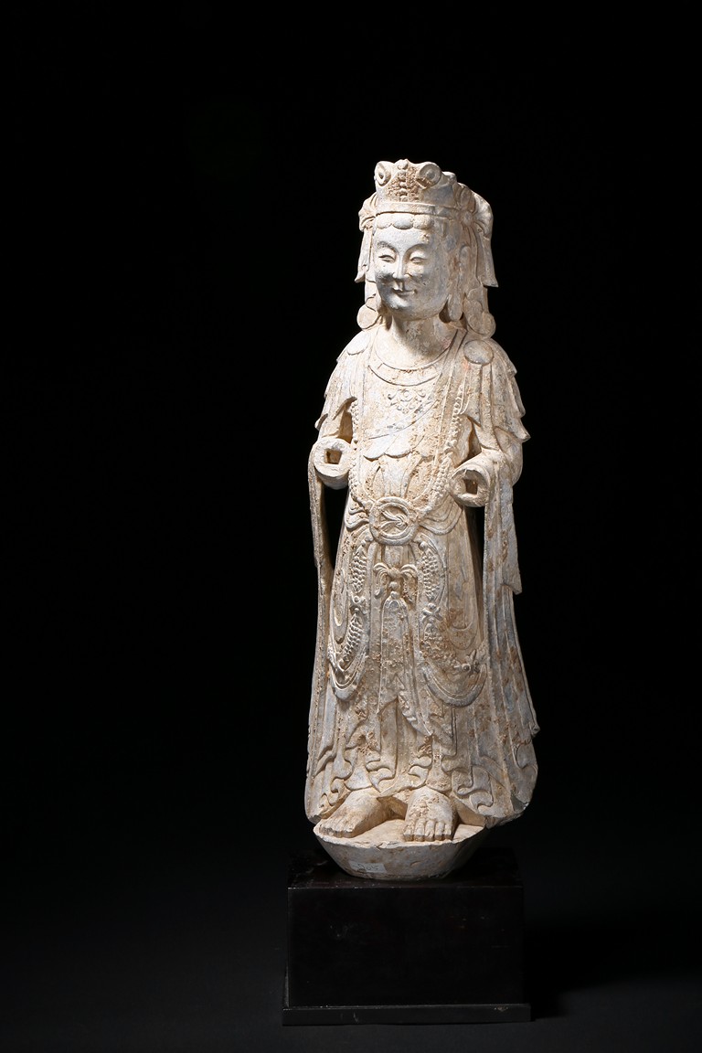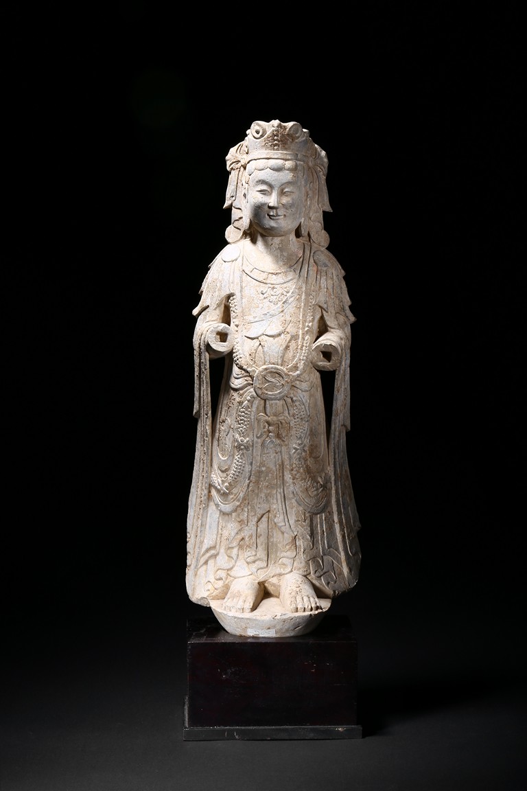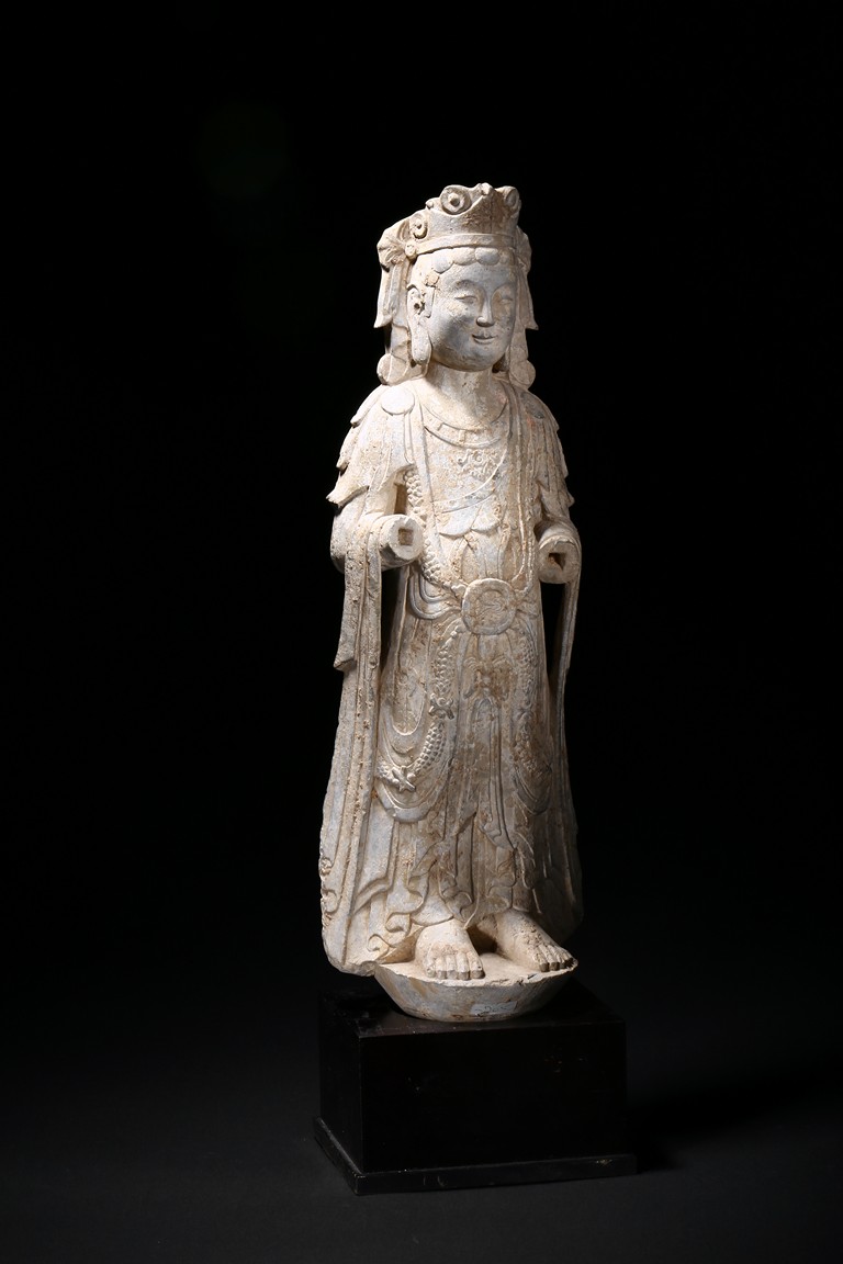 Depicted standing on a circular stand, the bodhisattva with outstretched hands(no lost) over which drape the billowing sleeves of his monastic robes covering both shoulders and feet, the face with benevolent expression, all supported on a wood plinth.