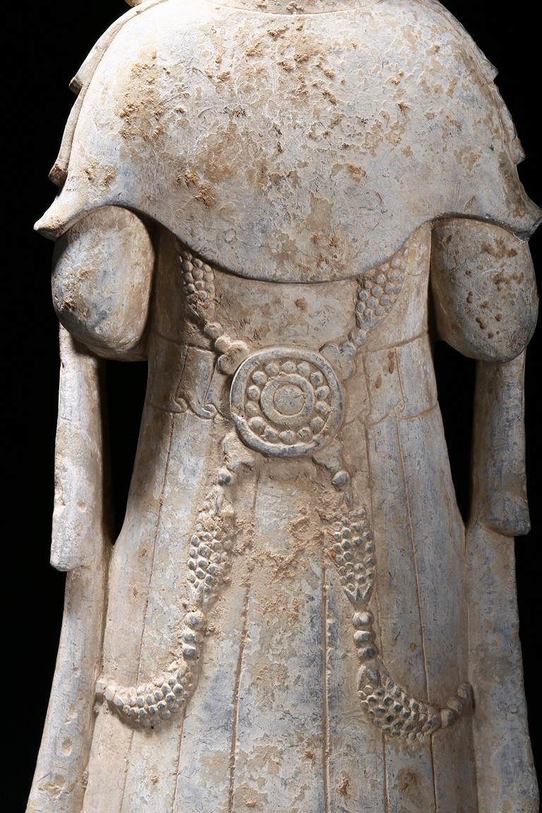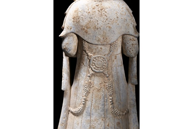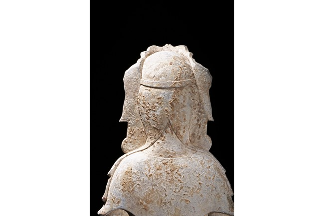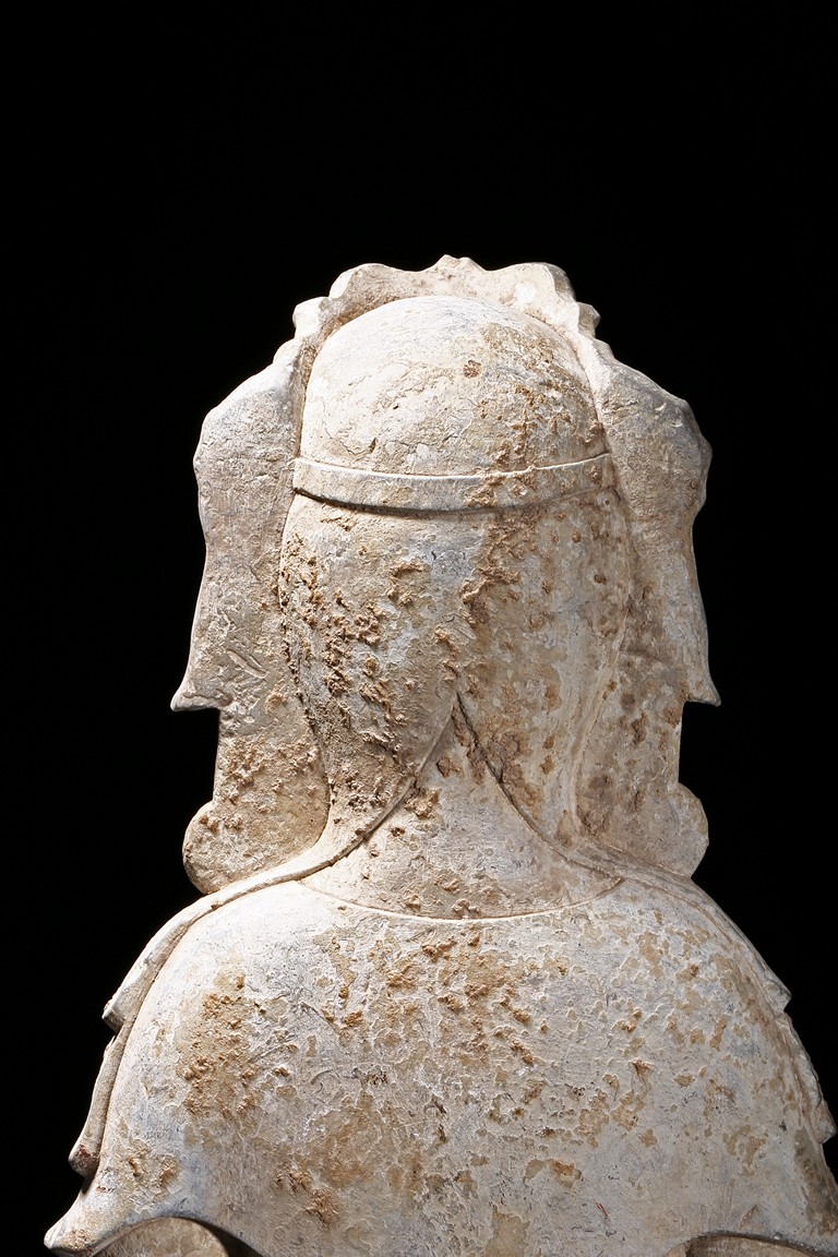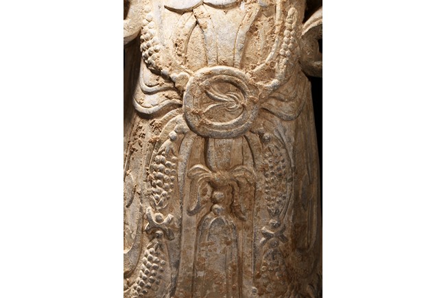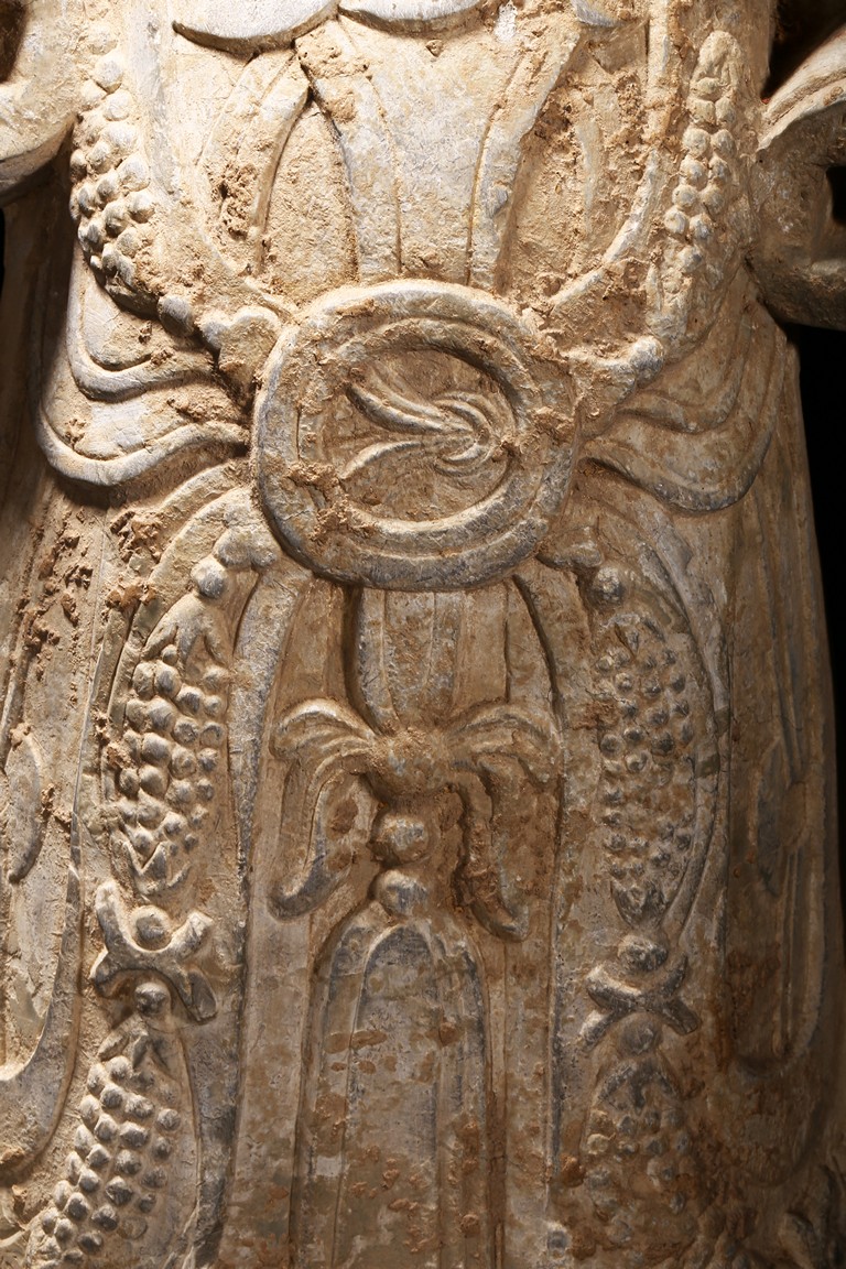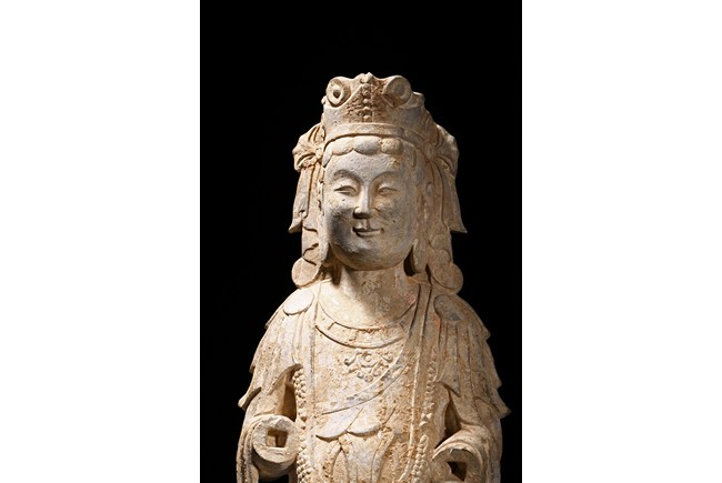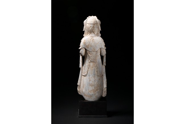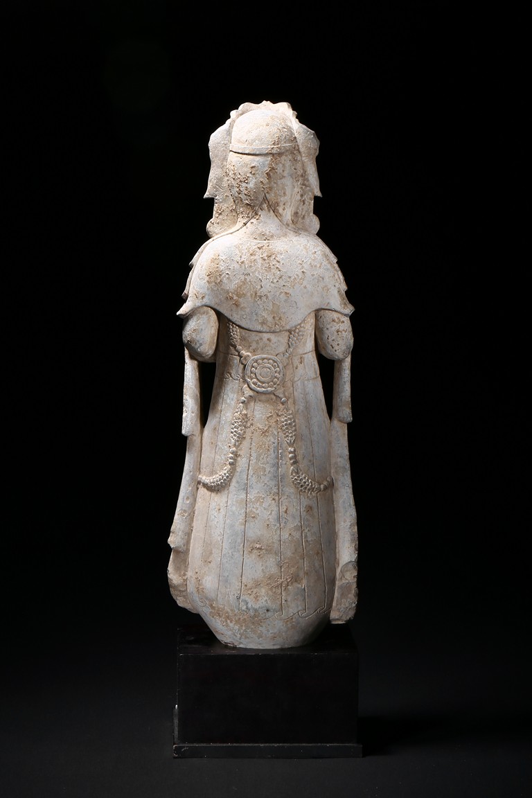 Depicted standing on a circular stand, the bodhisattva with outstretched hands(no lost) over which drape the billowing sleeves of his monastic robes covering both shoulders and feet, the face with benevolent expression, all supported on a wood plinth.