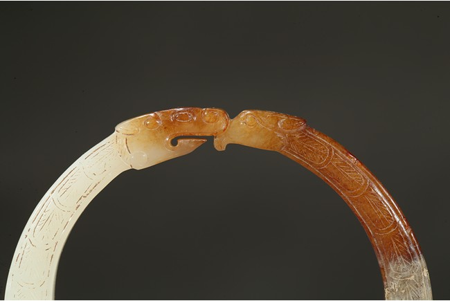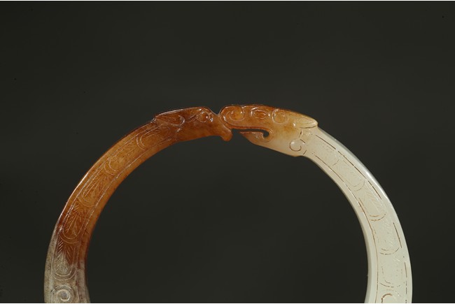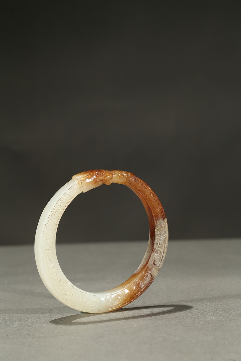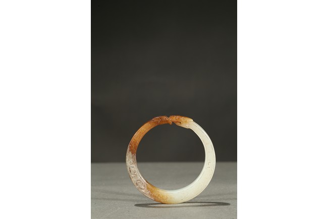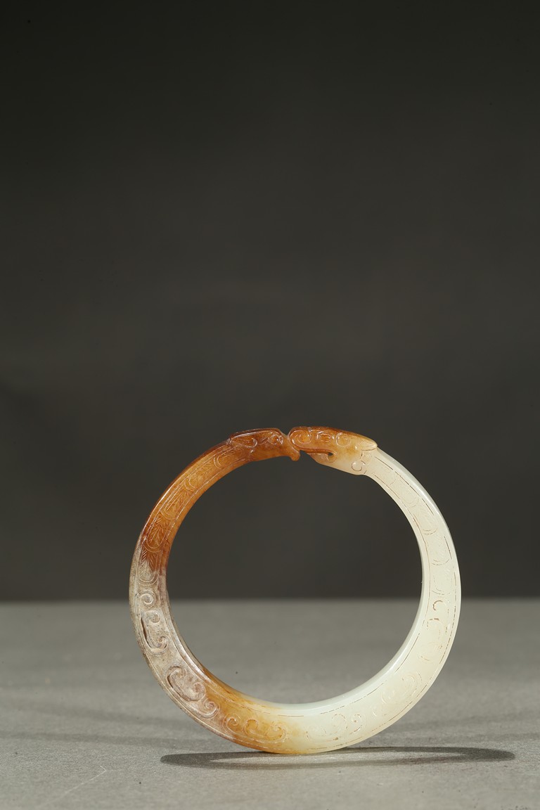 Carved as a stylized dragon forming a circular bangle with head biting the tail.