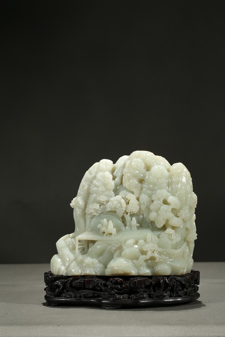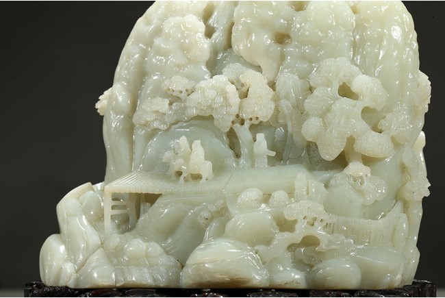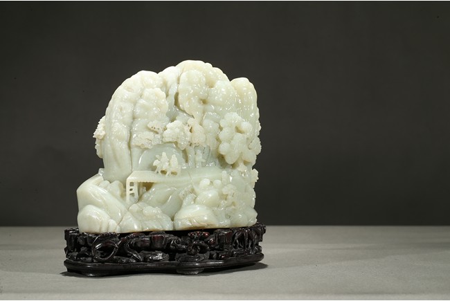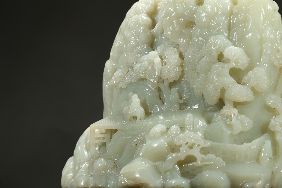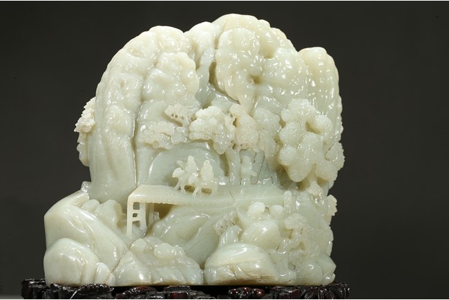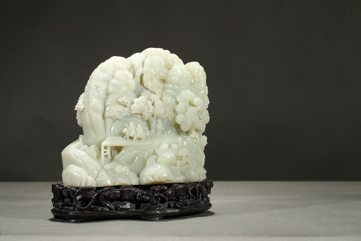 The mountain boulder carved in varying depth of two scholar's on donkeys accompanied by his attendant on dock by the river stream in a deep mountain setting, the reverse carved with three houses on a cliff. The stone is of translucent green white tone.