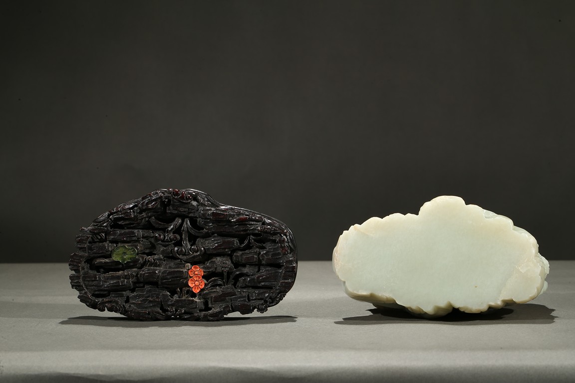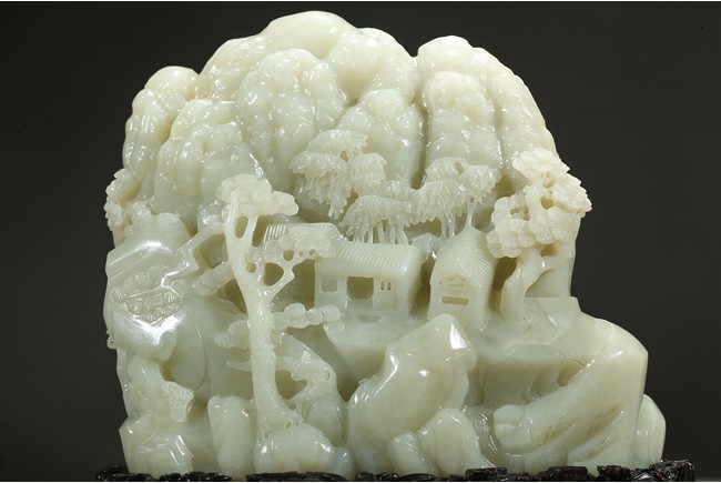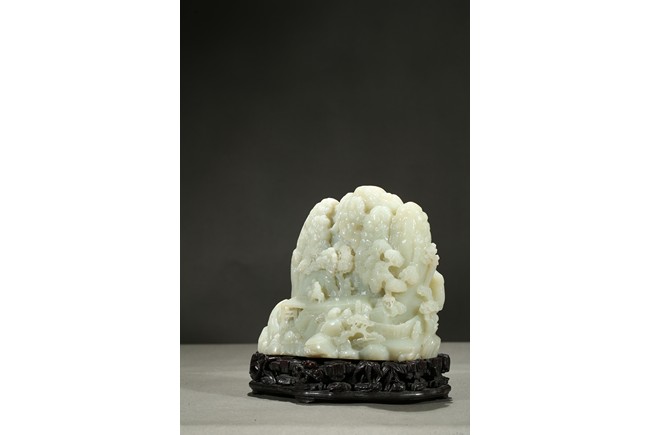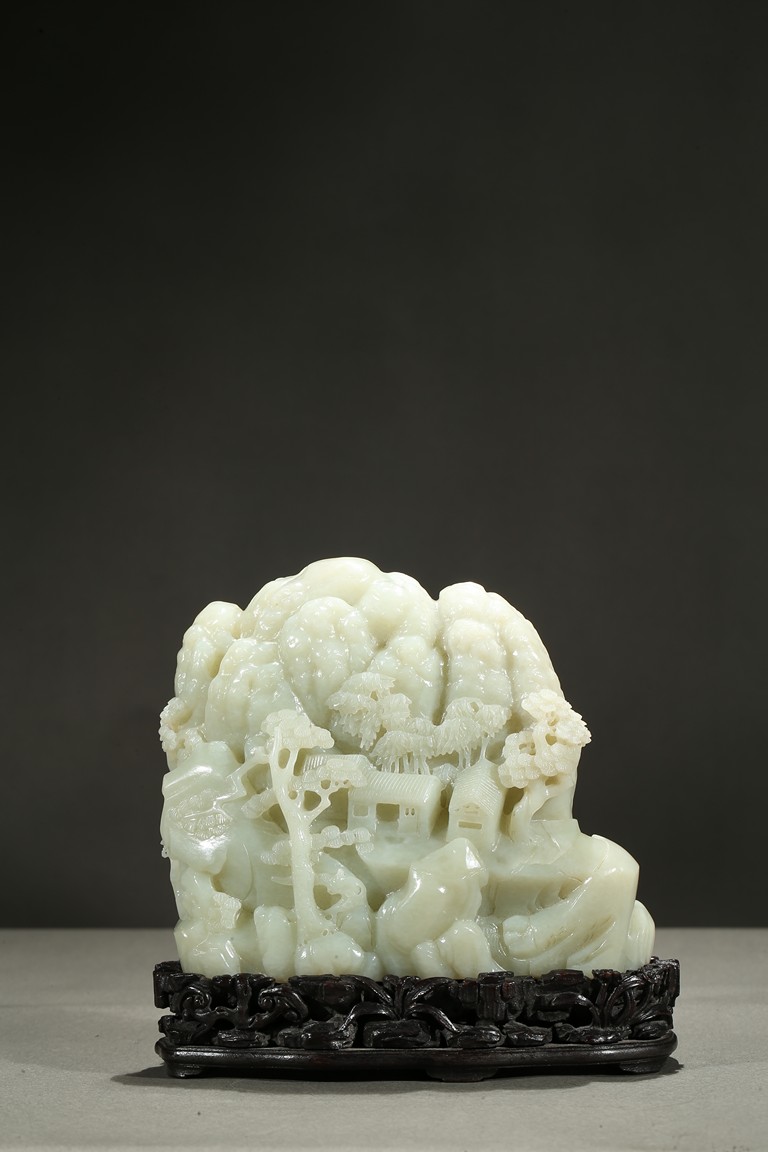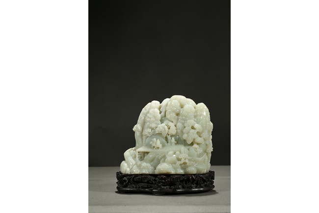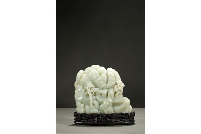 The mountain boulder carved in varying depth of two scholar's on donkeys accompanied by his attendant on dock by the river stream in a deep mountain setting, the reverse carved with three houses on a cliff. The stone is of translucent green white tone.