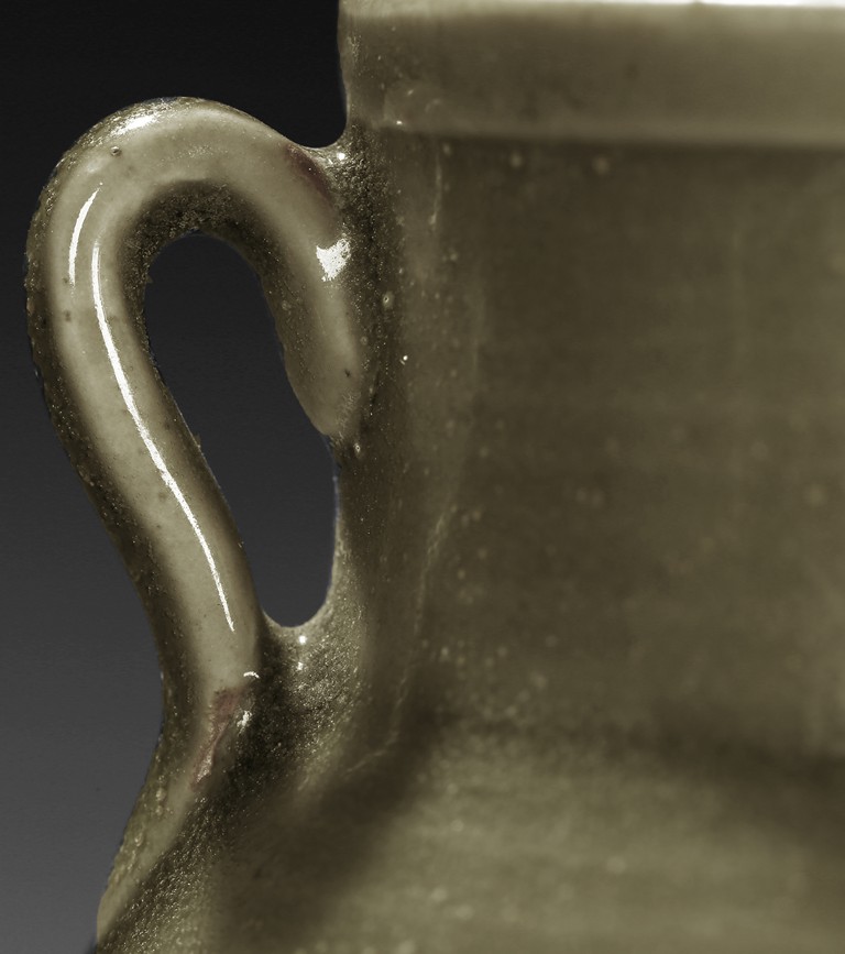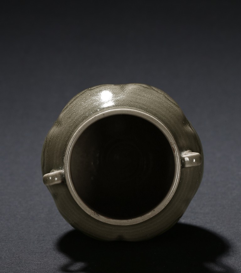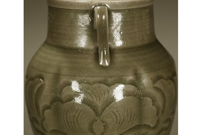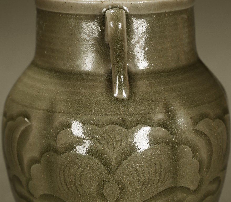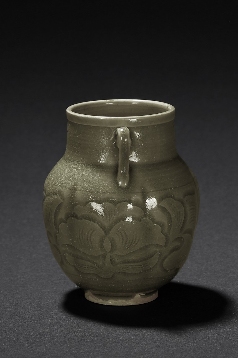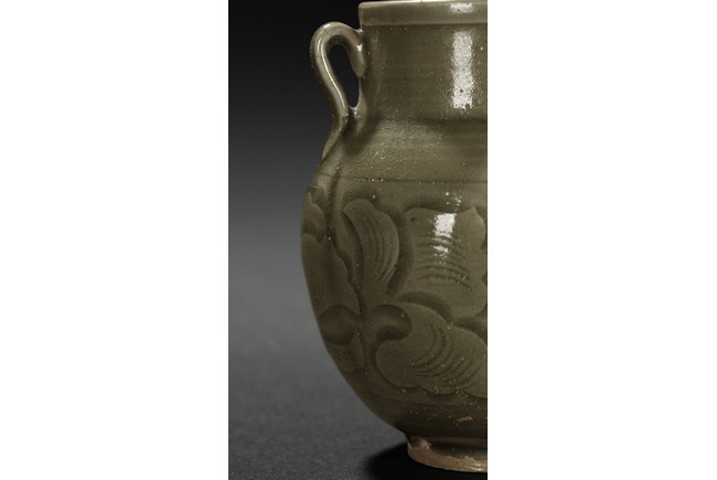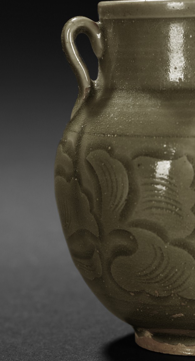 A YAOZHOU CELADON CARVED JAR 耀州窯青釉雙耳小罐