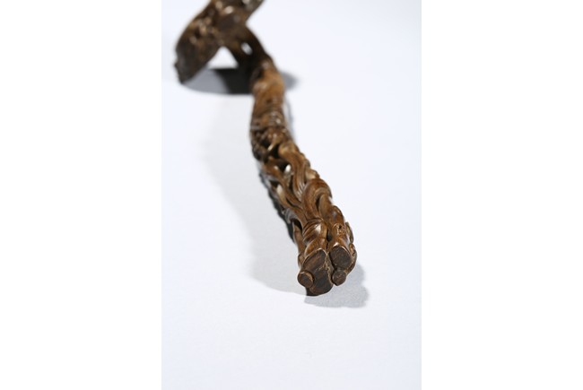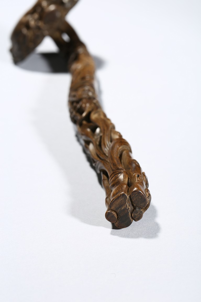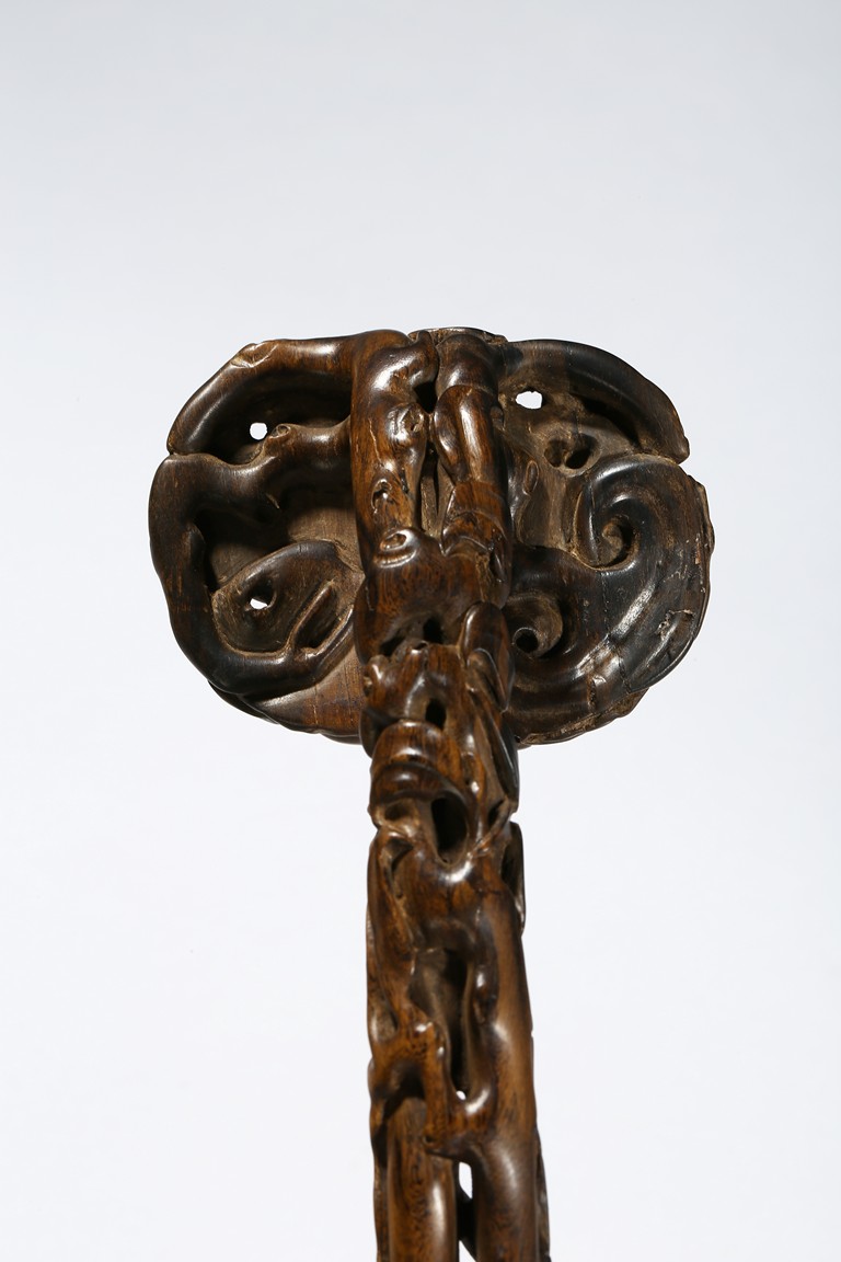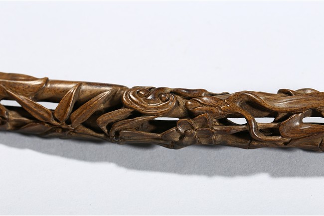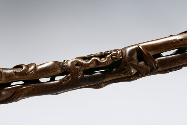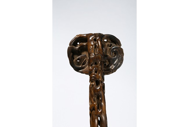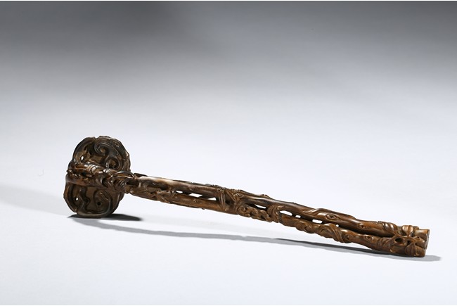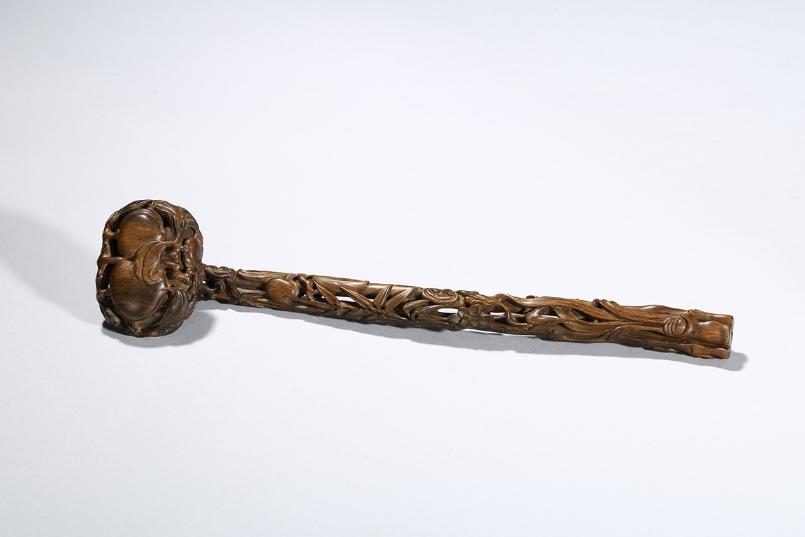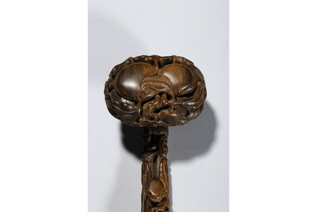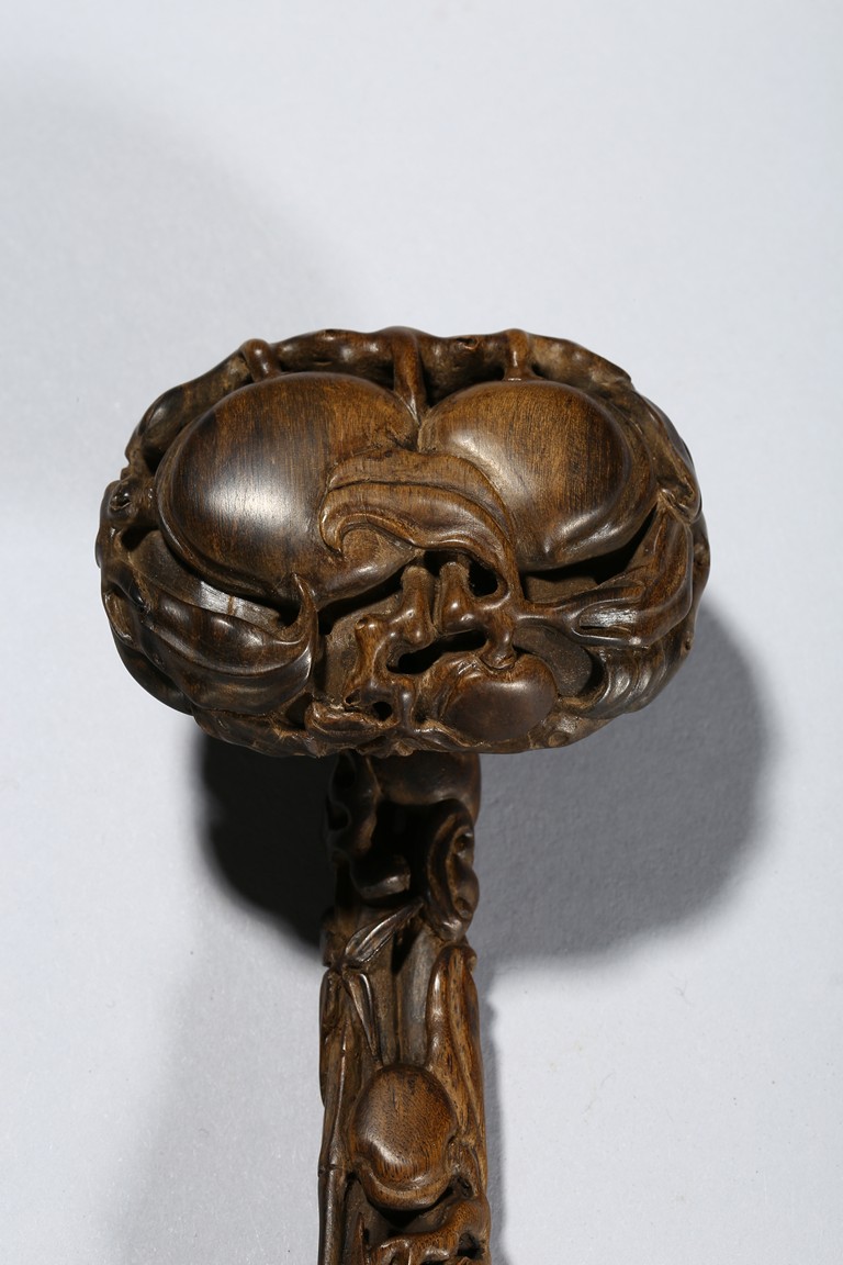 The ruyi scepter head carved in the form of leafy double peach, with bamboo and lingzhi branches forming the straight shaft. Qing Dynasty period.