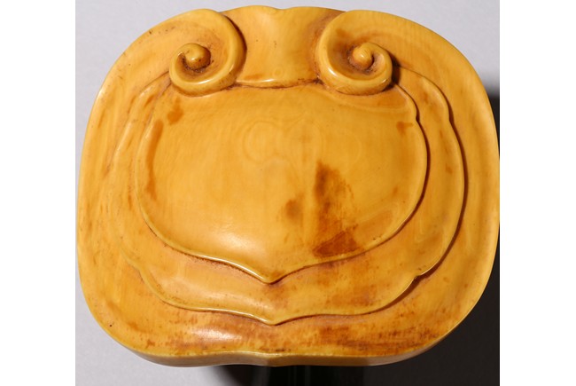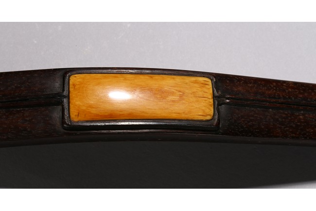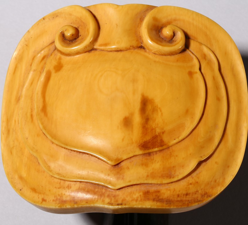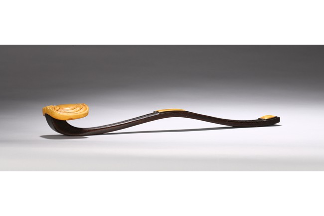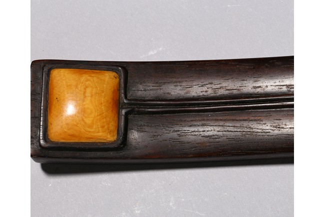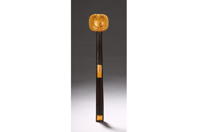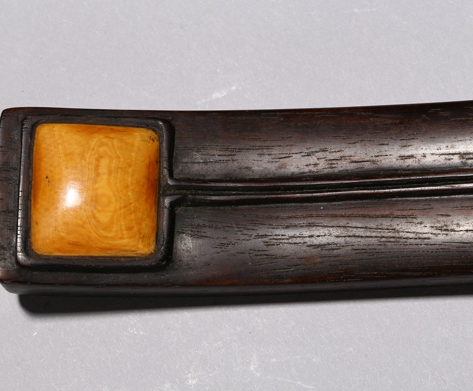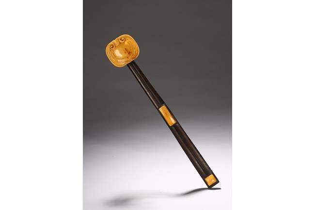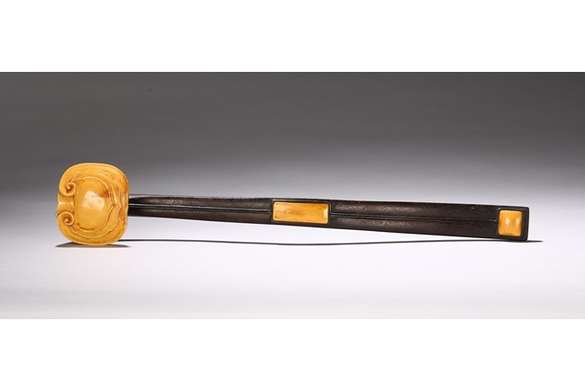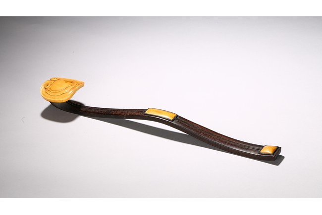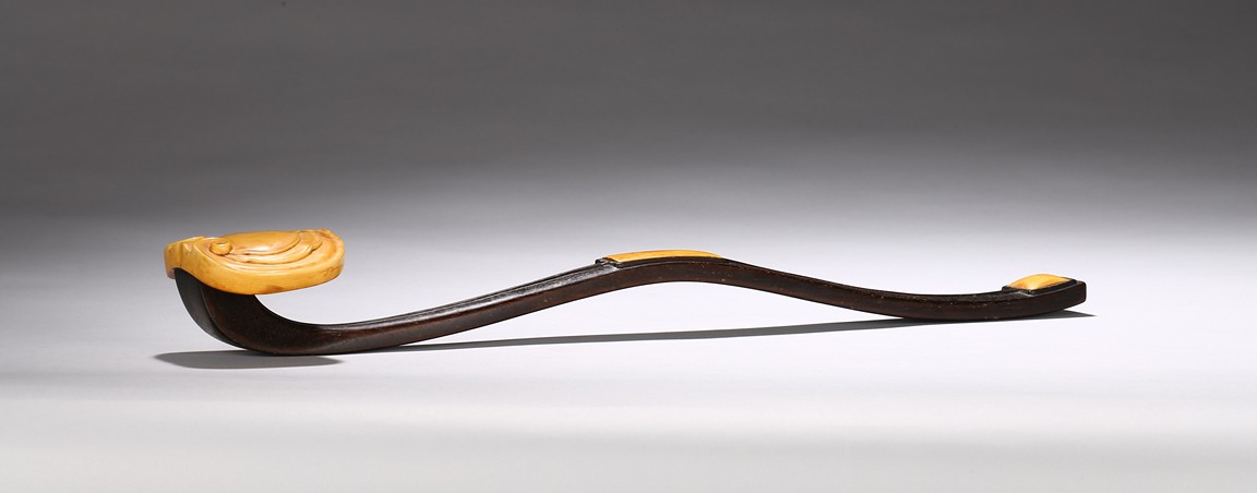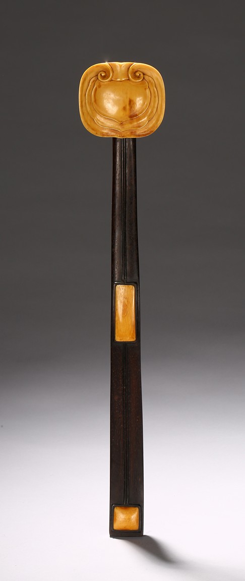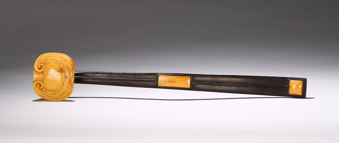 The rounded square shape ruyi head carved in the form of lingzhi head, the shaft and end inlaid with bone. Early Qing Dynasty period.