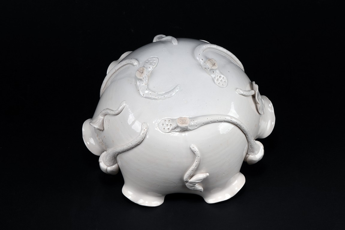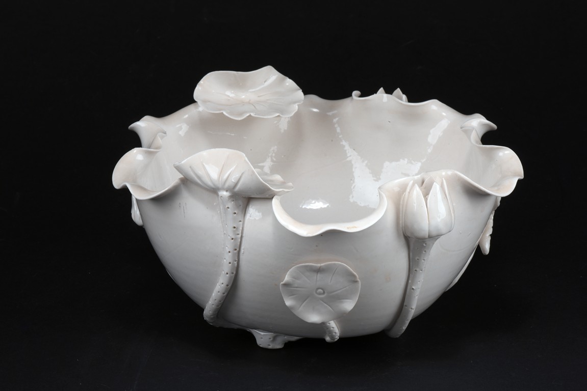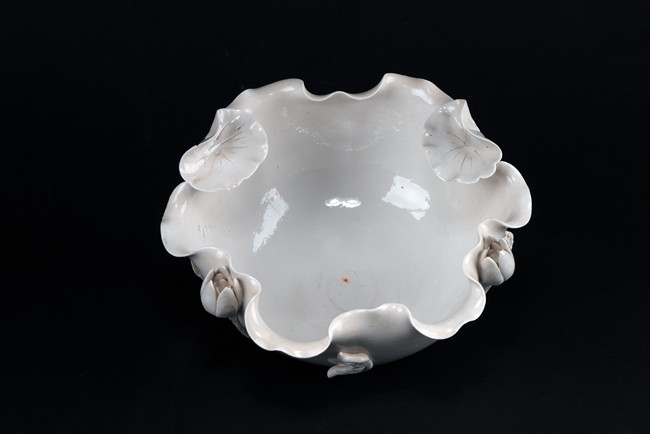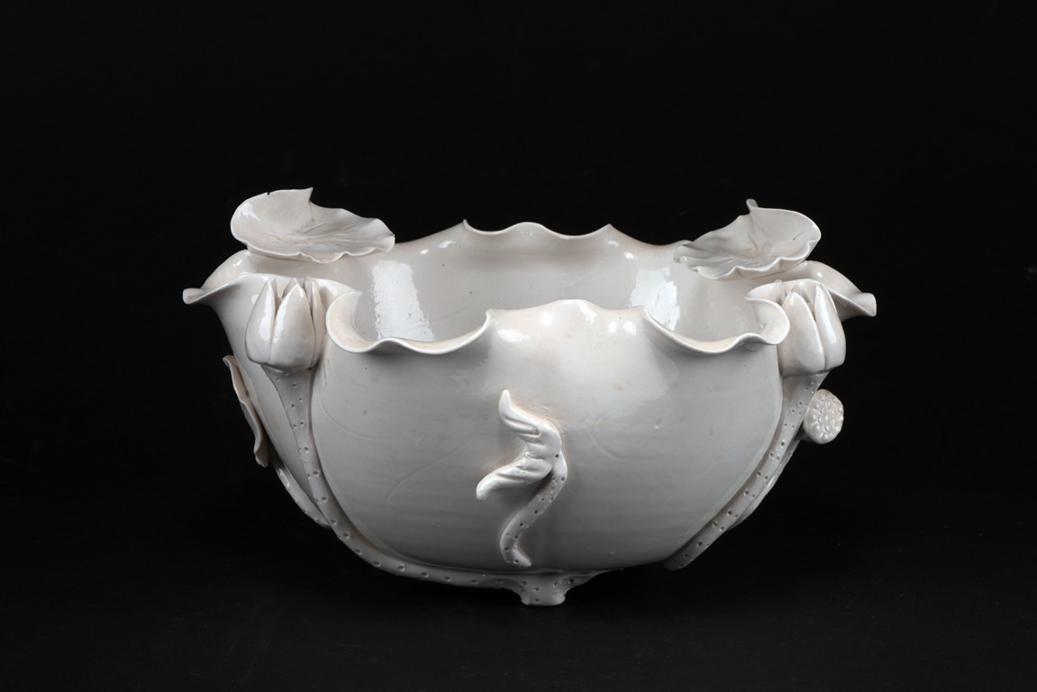 Modelled in the form of lotus leaf with irregular mouth rim, the body is moulded with lotus buds and leaves in relief. Accompanied with a fitted hardwood stand. Qing Dynasty period.