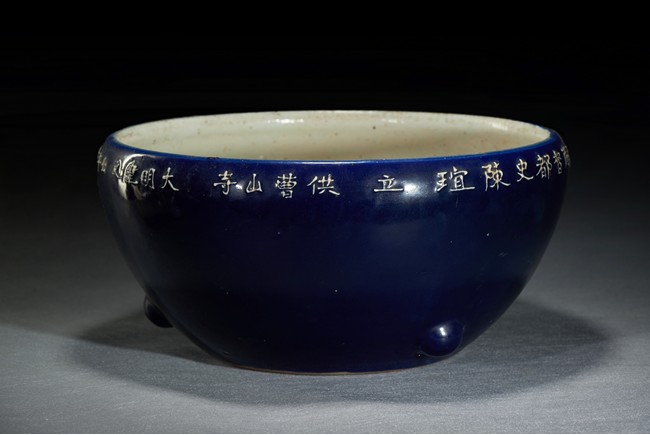 With rounded sides, the jar is finely covered in rich blue glazed to the exterior, moulded around the rim with inscription describing the date it was made and name and rank of the commissioner, with three raised knobs above base.Ming Dynasty period.