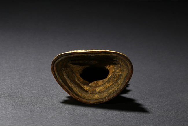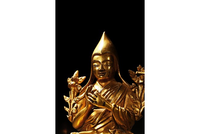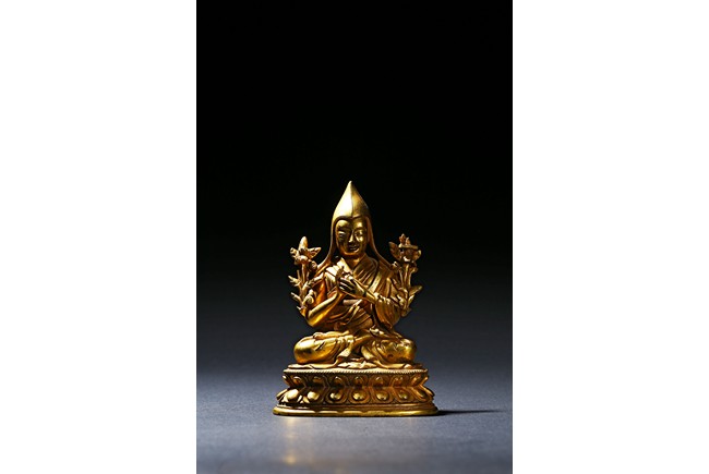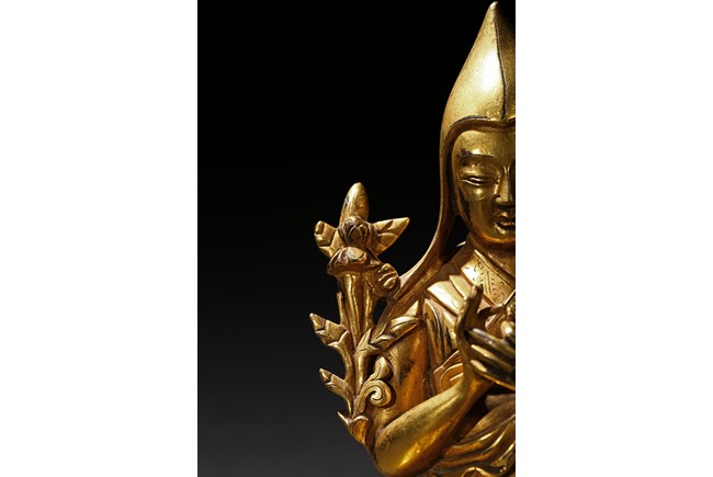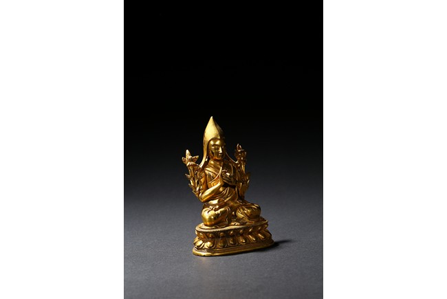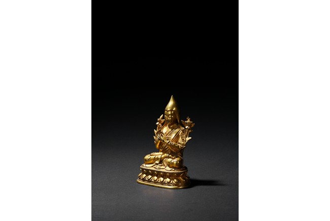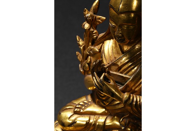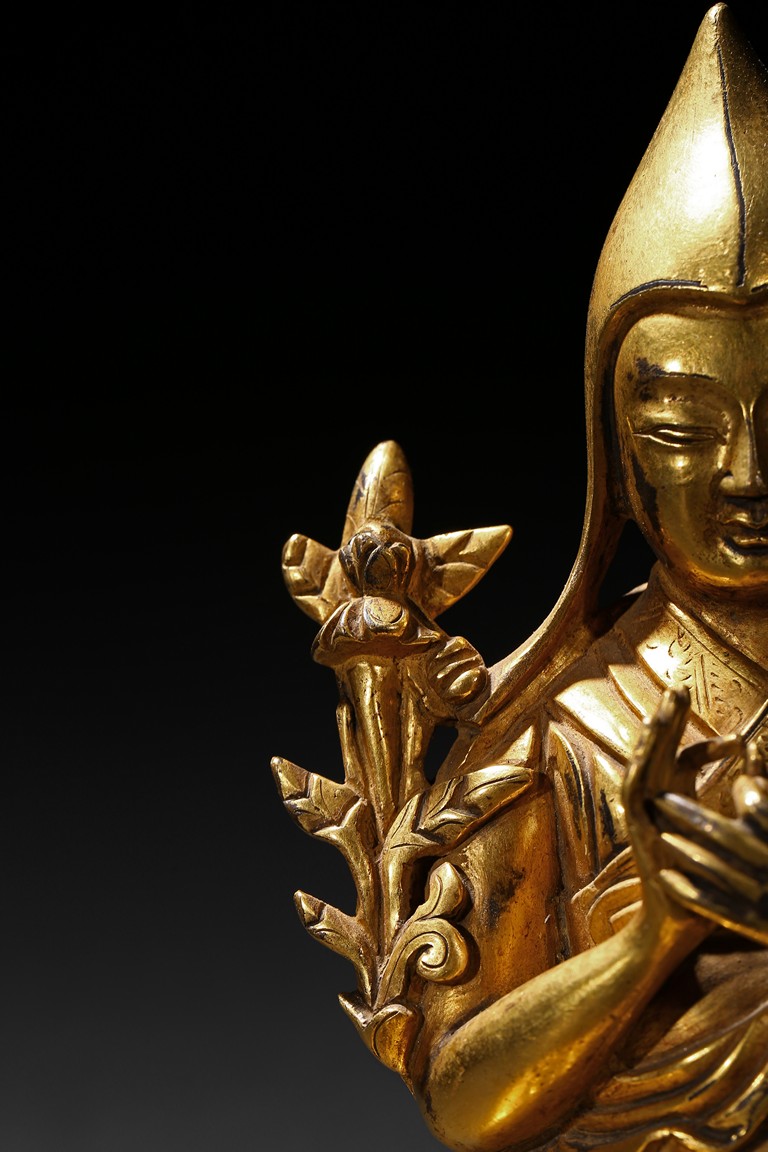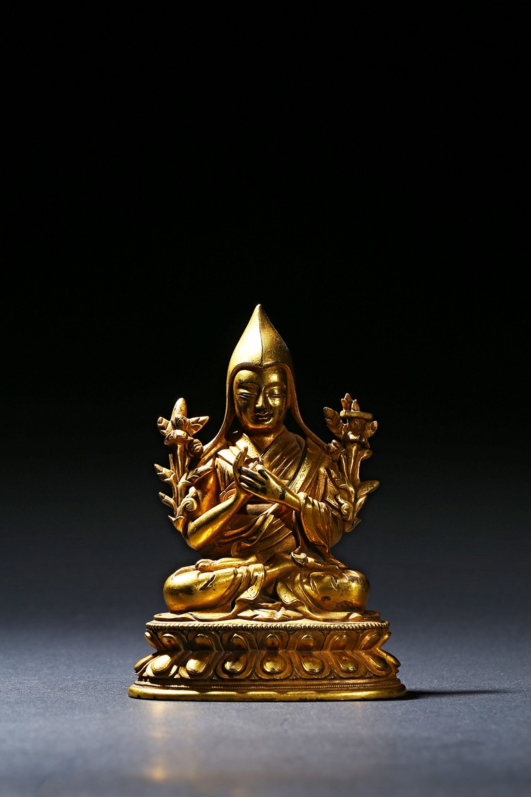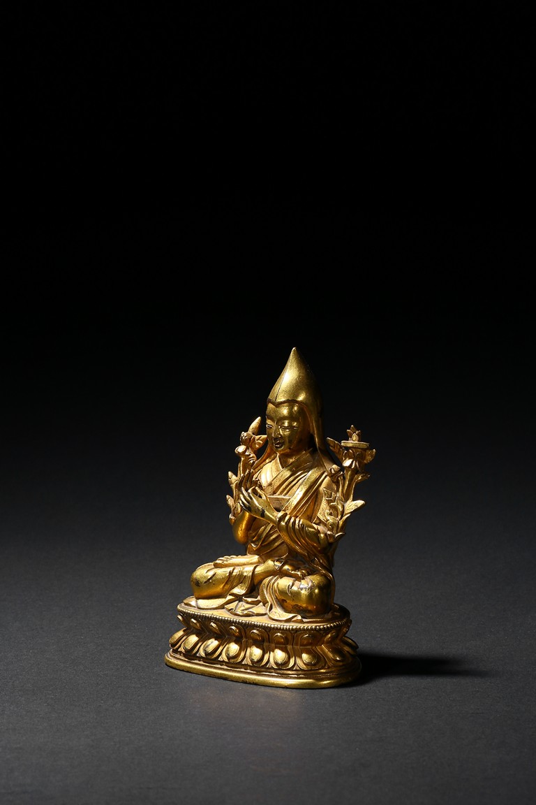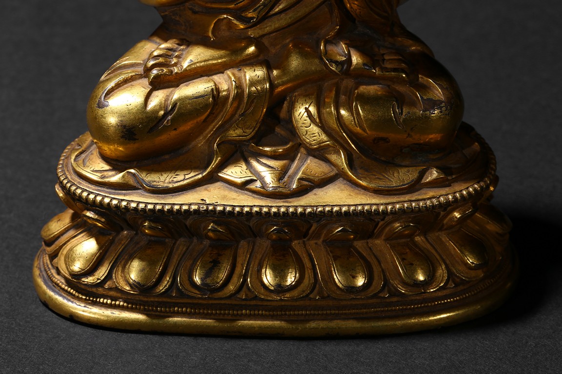 Seated in dhyanasana over a double-lotus base with his hands in dharmachakra mudra, wearing a vest with finely incised lapel under flowing robes, flanked on either side by a lotus, the face with petite features and large ears and wearing a pointed hat. Qing Dynasty period.