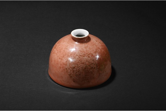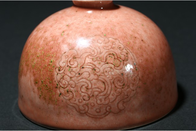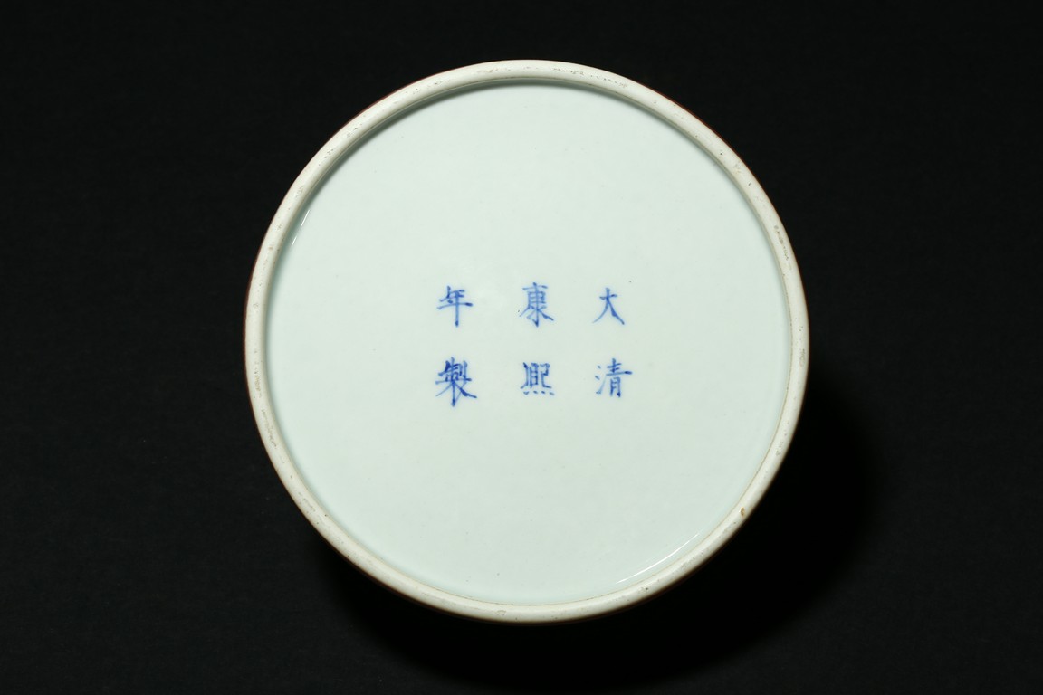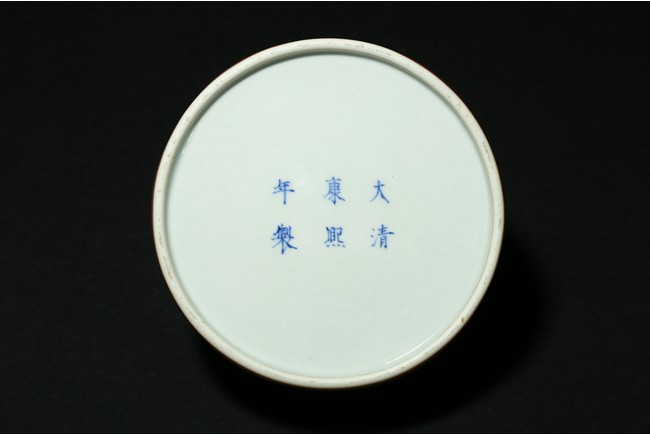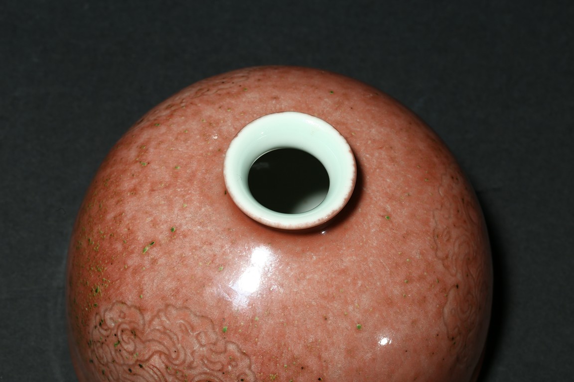 The rounded sides rise to a short, slightly flaring neck, and incised with three archaistic dragon roundels beneath a glazed of even, crushed strawberry tone suffused with mottled areas of copper-green. The rim, interior and base are coverd in a transparent glazed. Base with six character KANGXI mark. Qing Dynasty period.