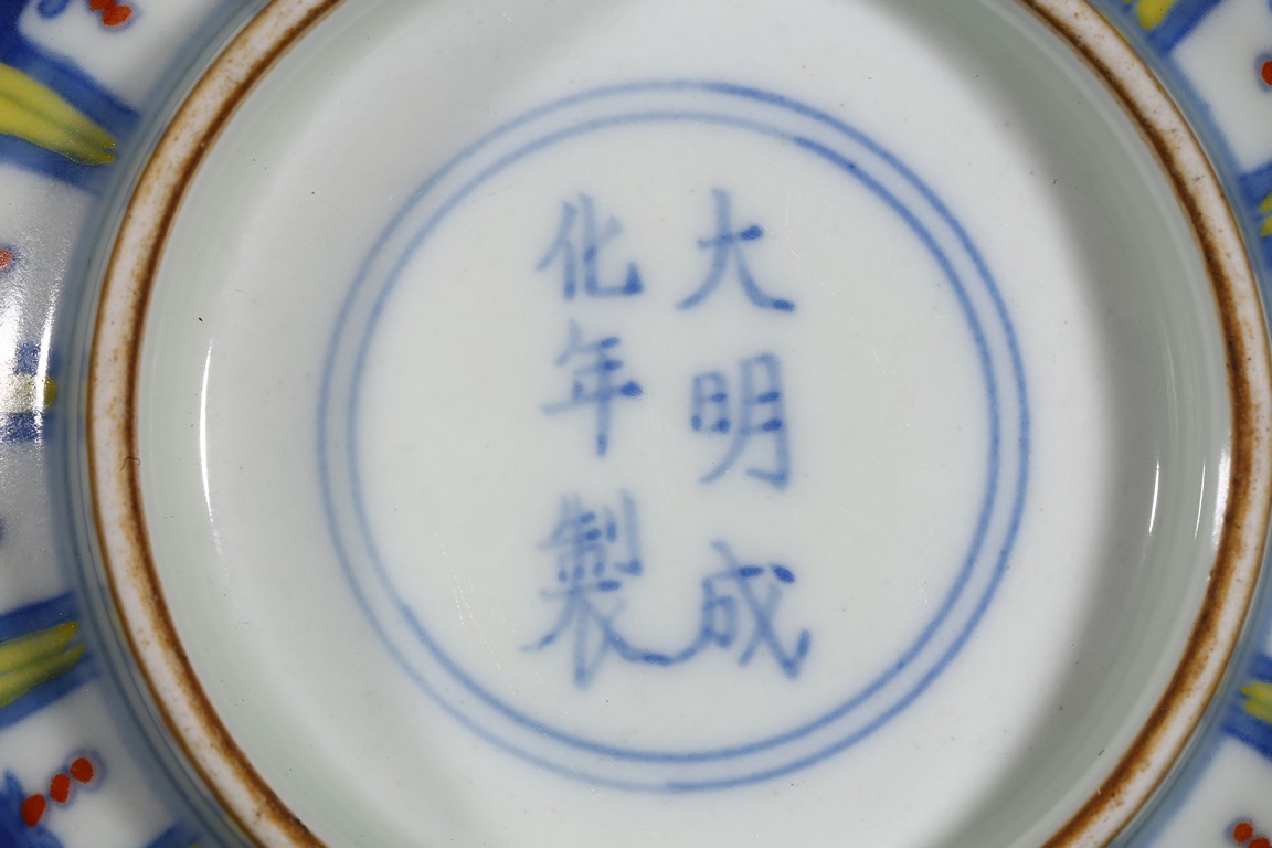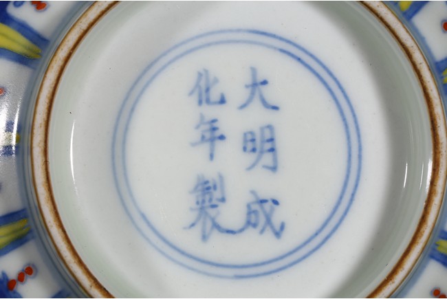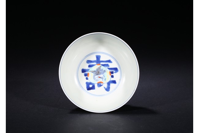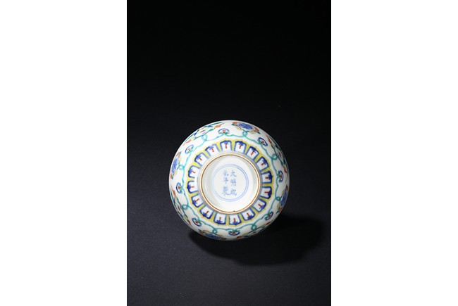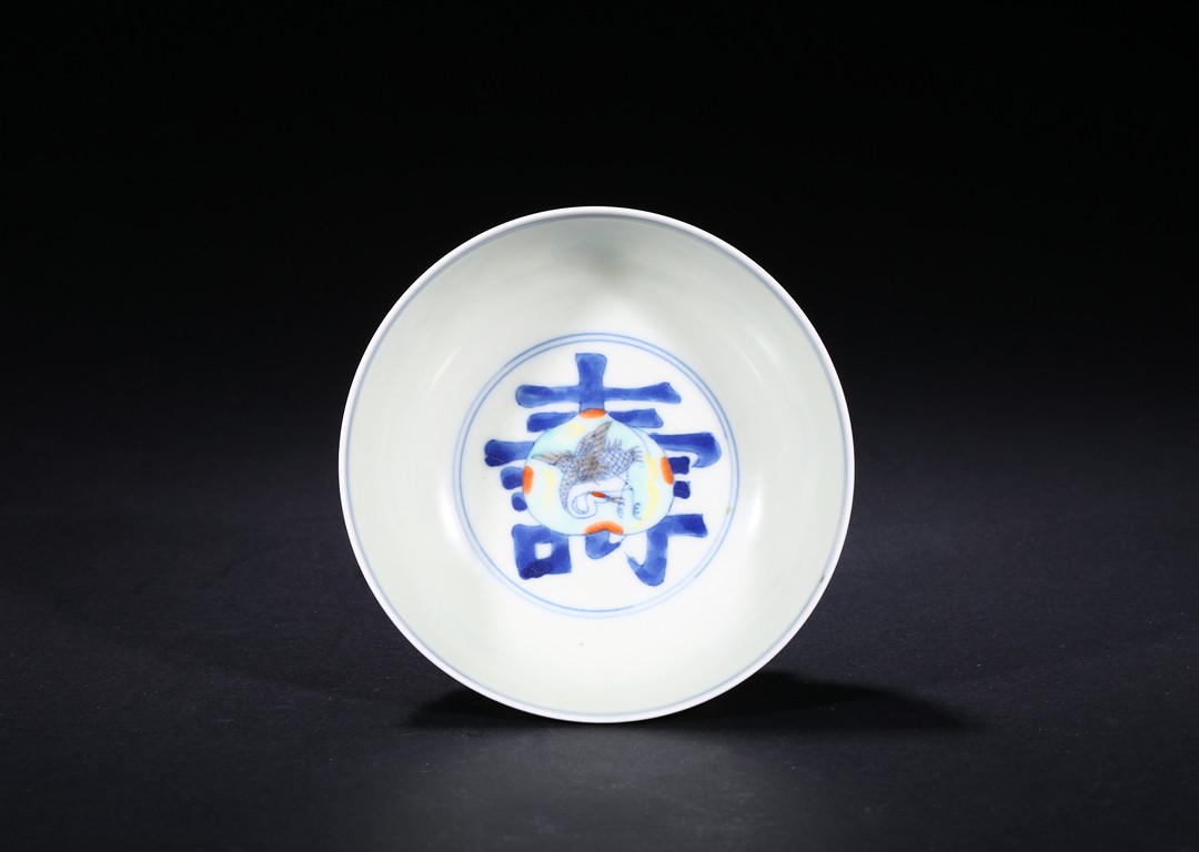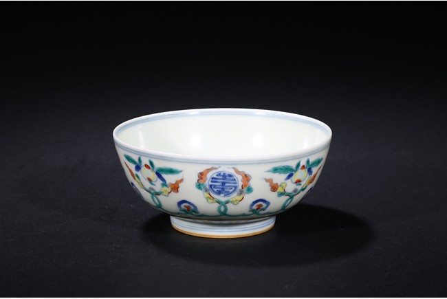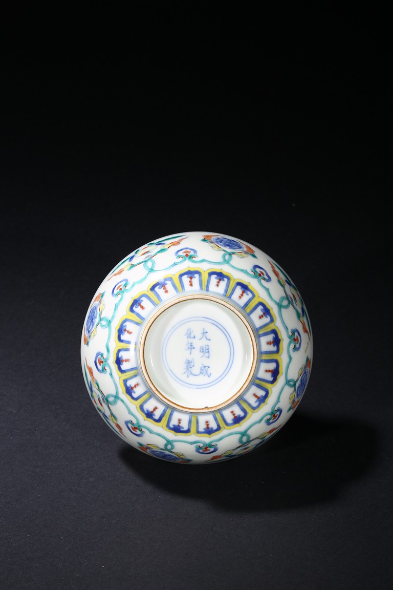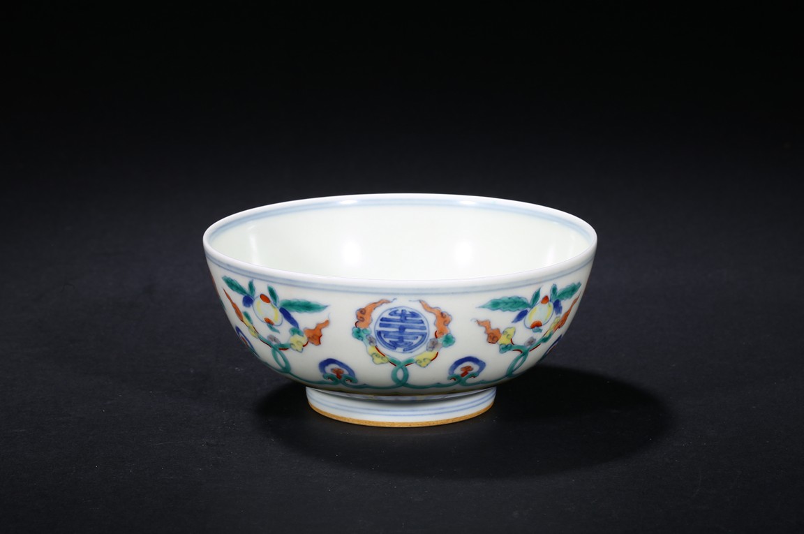 Chenghua-style. Decorated with peach sprigs scrolling and shou medallion, with double line rings around mouth, the base with apocryphal Chenghua mark. Republic period.
