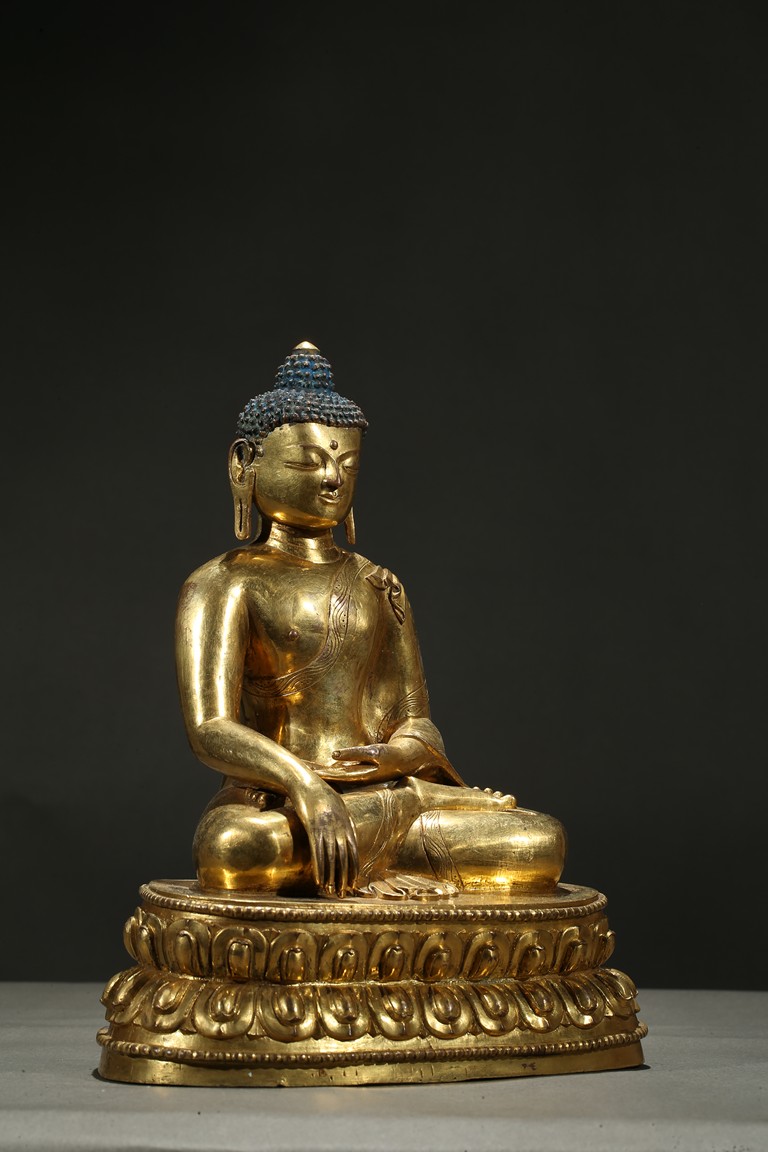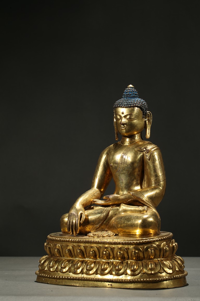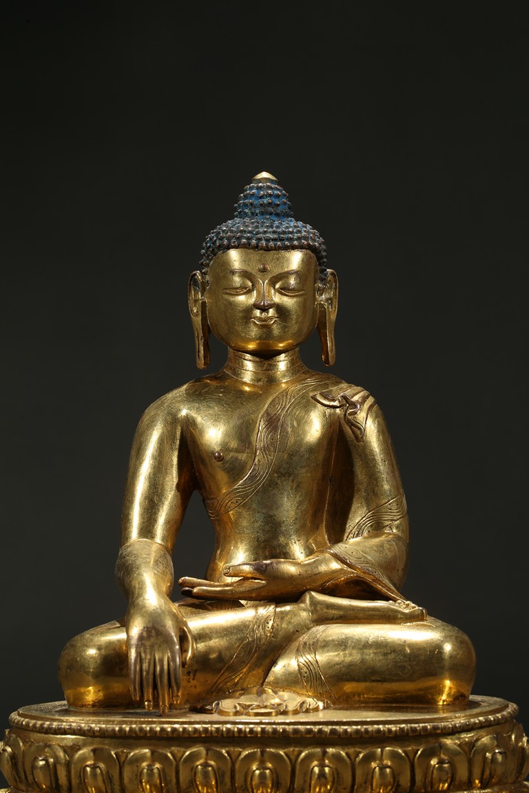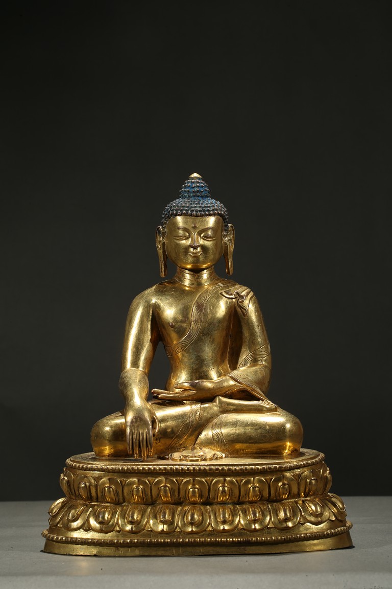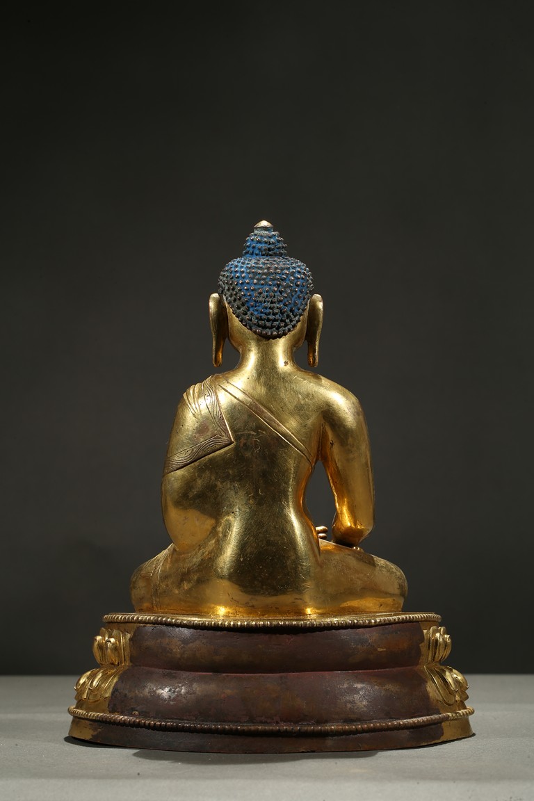 The figure seated in dhyanasana on a double lotus base behind a vajra, his right hand in bhumisparsa and his left in dhyana mudra, wearing a dhoti with a incised hem, the face with a serene expression with downcast eyes, framed by pendulous ear lobes and his hair tied in tight curls. Early Qing Dynasty period.