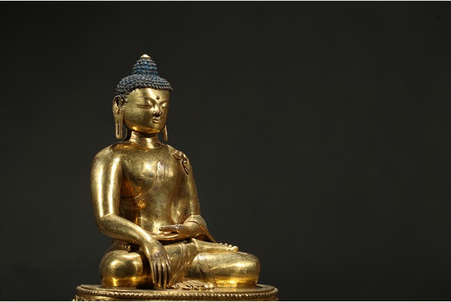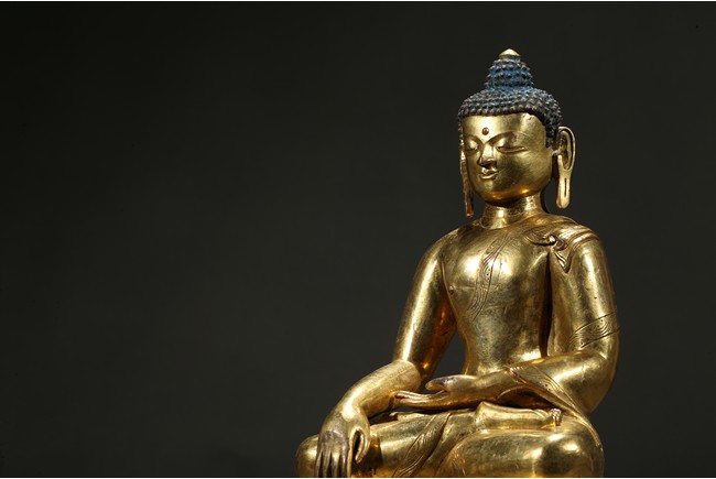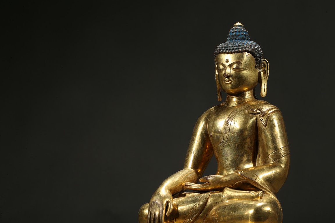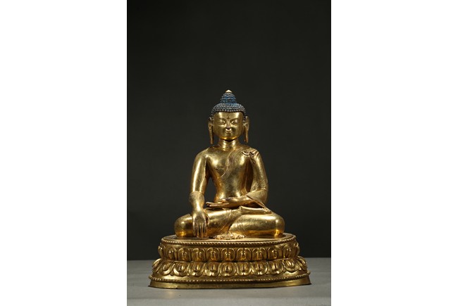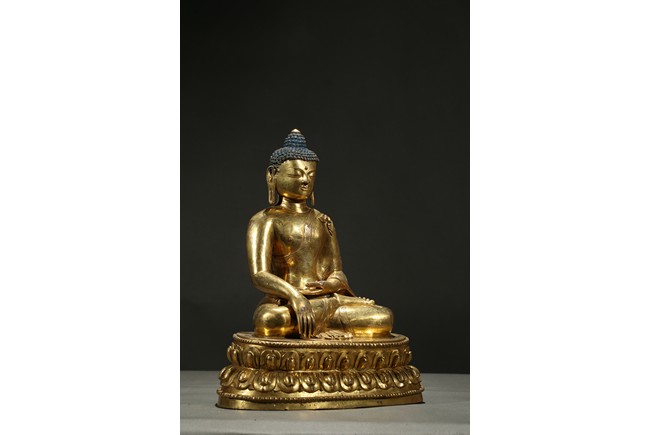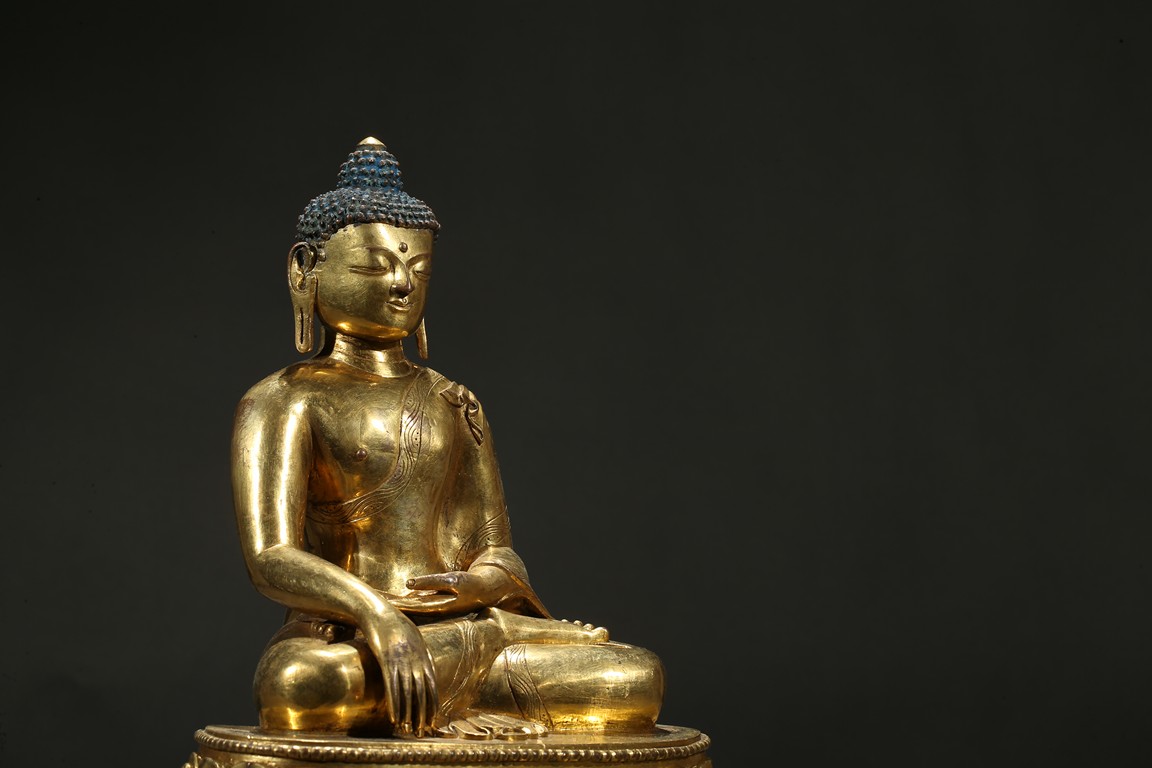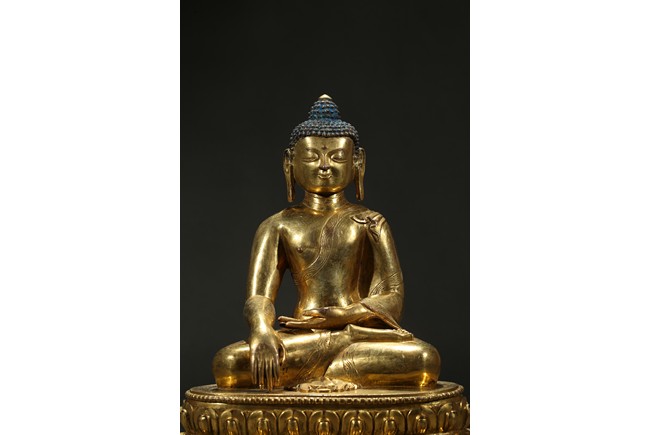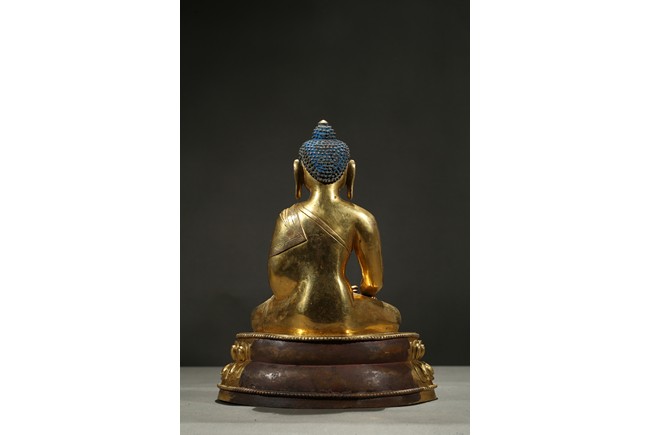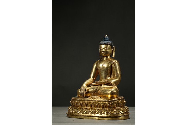 The figure seated in dhyanasana on a double lotus base behind a vajra, his right hand in bhumisparsa and his left in dhyana mudra, wearing a dhoti with a incised hem, the face with a serene expression with downcast eyes, framed by pendulous ear lobes and his hair tied in tight curls. Early Qing Dynasty period.