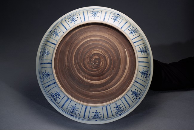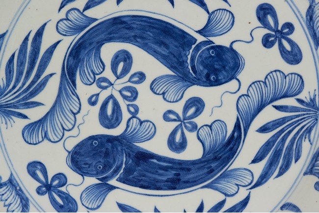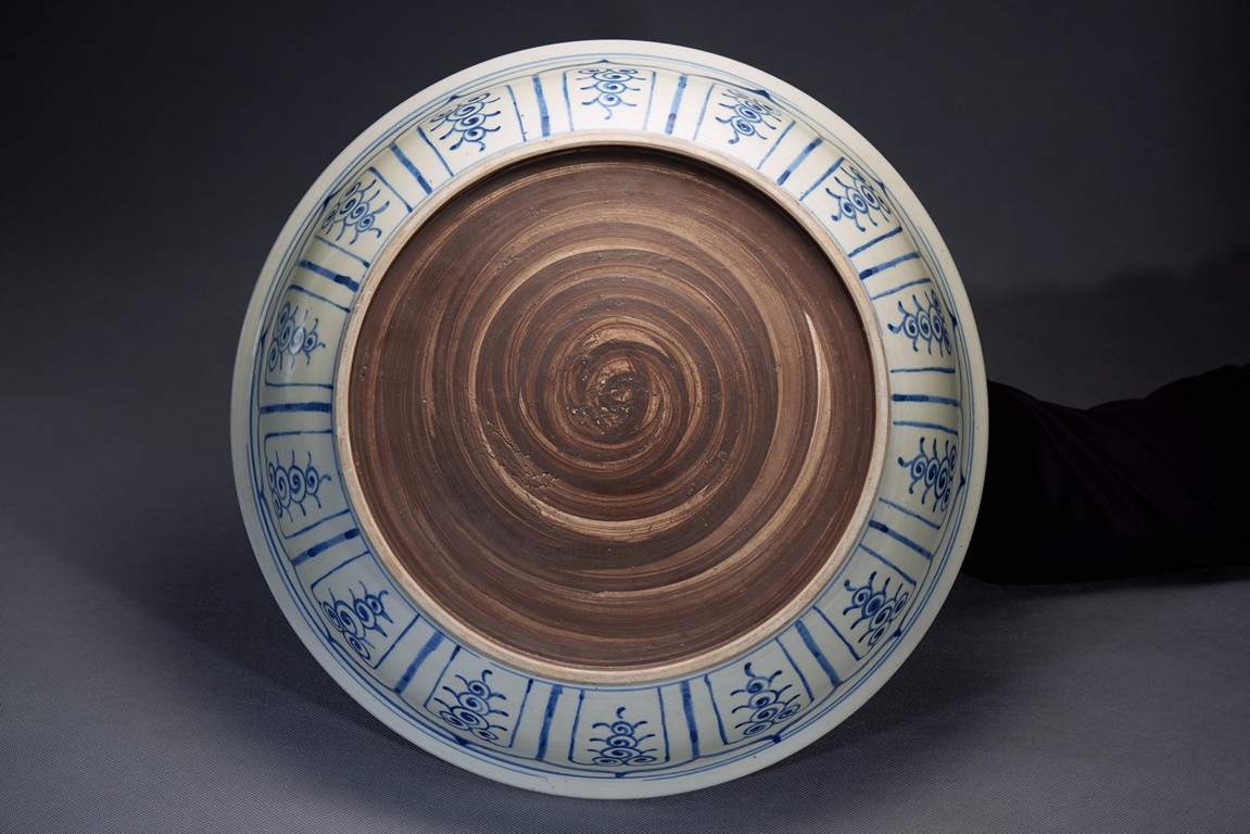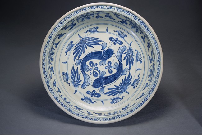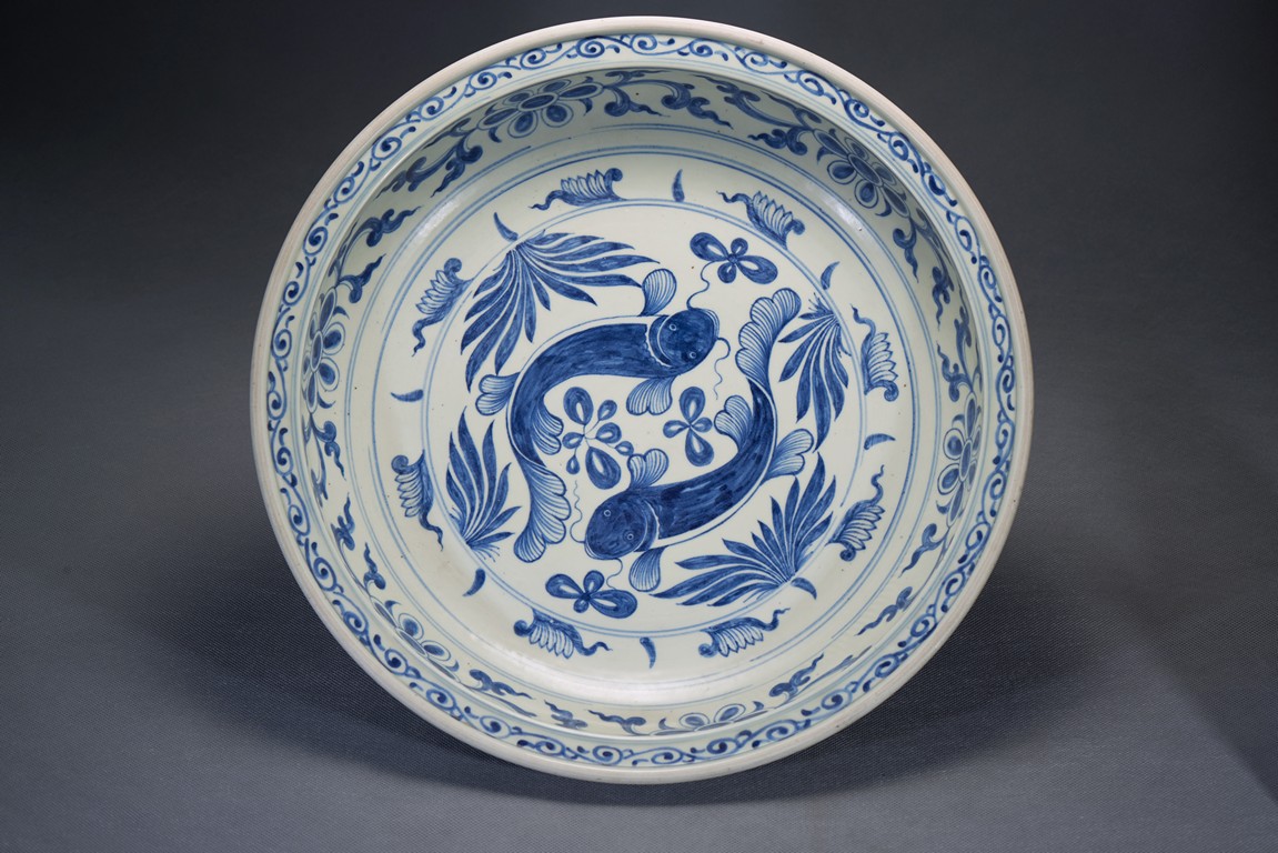Painted with two fish joining head to tail amongst weeds to the central medallion enclosed in a double circle, the side with scrolling floral pattern, the exterior decorated with lotus lappet band.