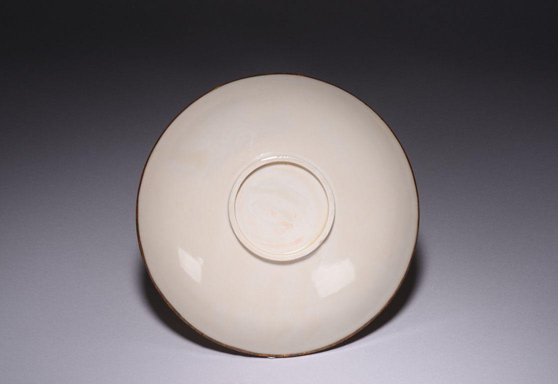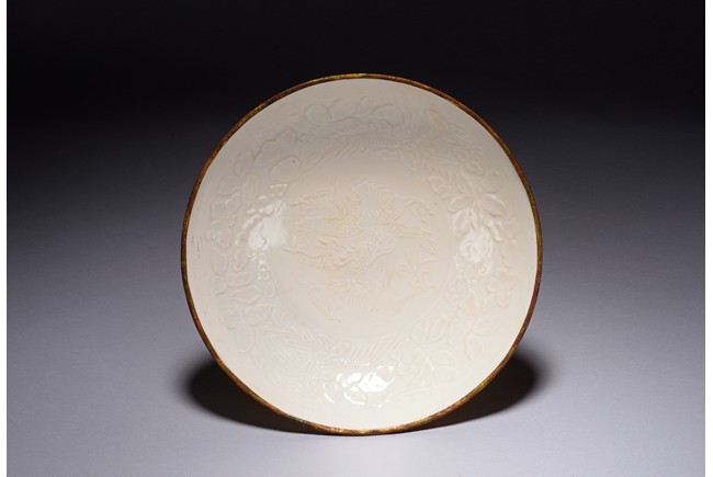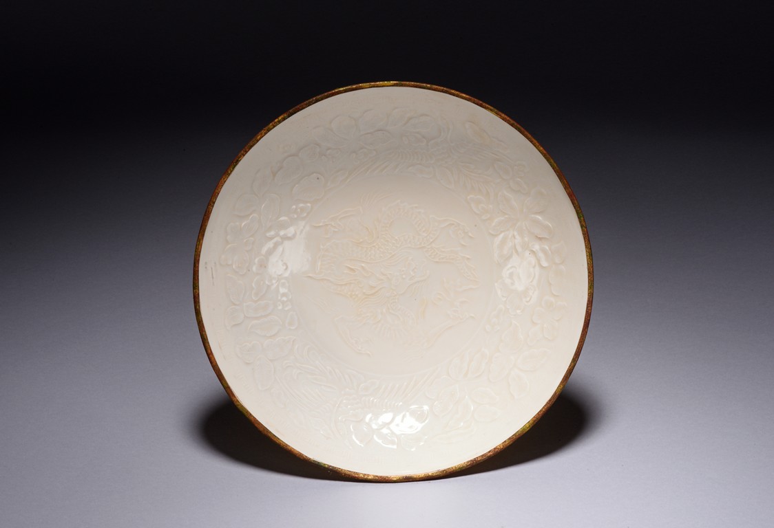 The dish has shallow rounded sides that flare to a slightly everted rim, with metal mount, and the interior is finely carved with a coiled dragon to the center encircled by two leafy floral sprays and phoenix in flight Qing Dynasty period.