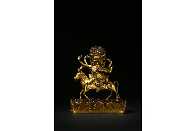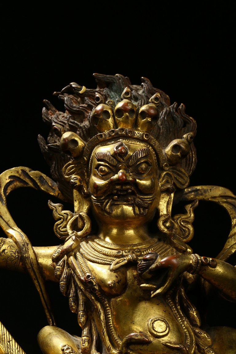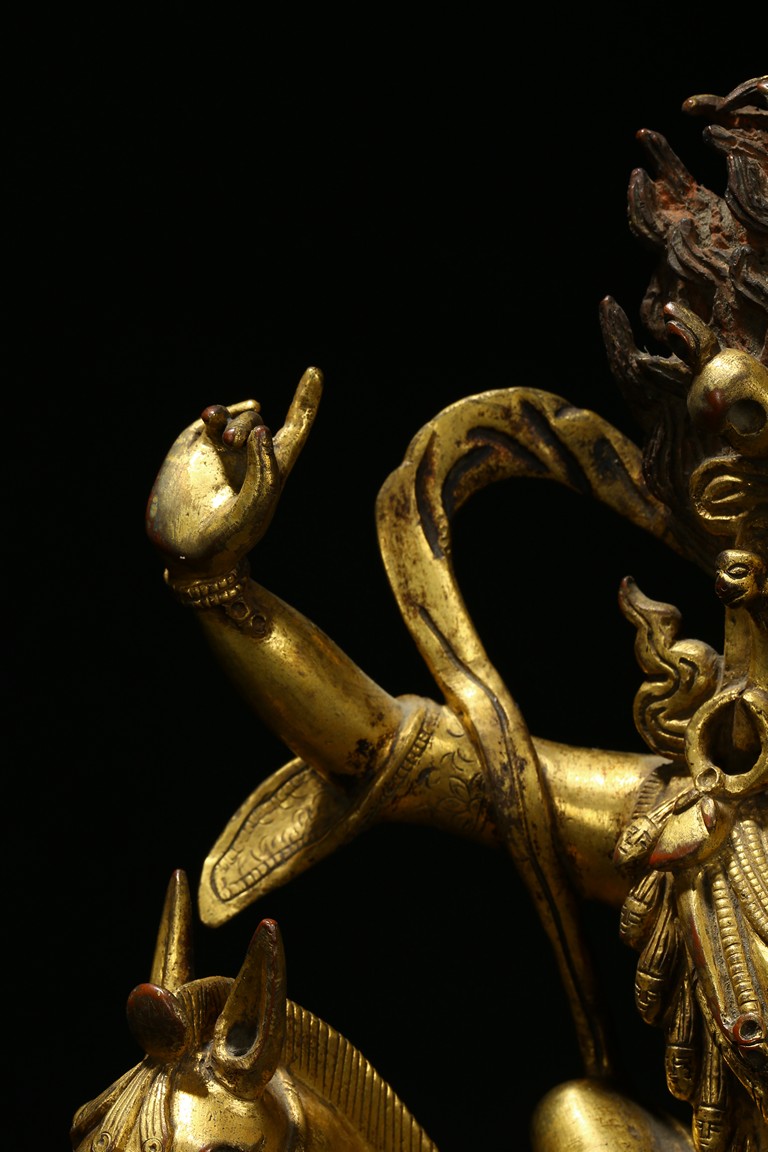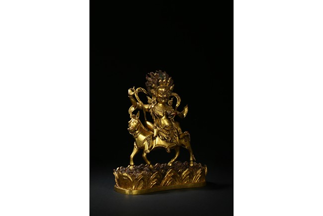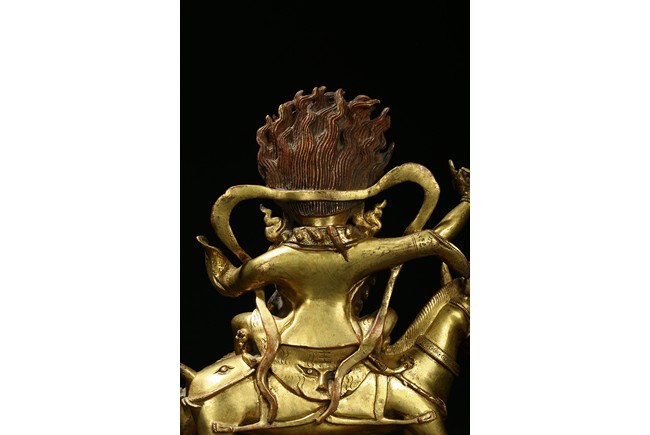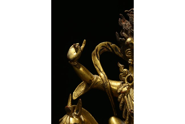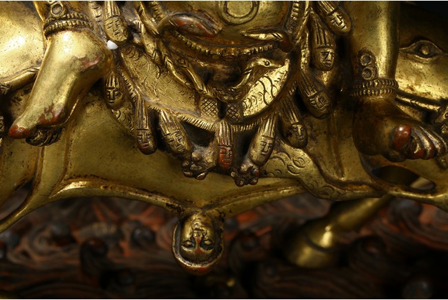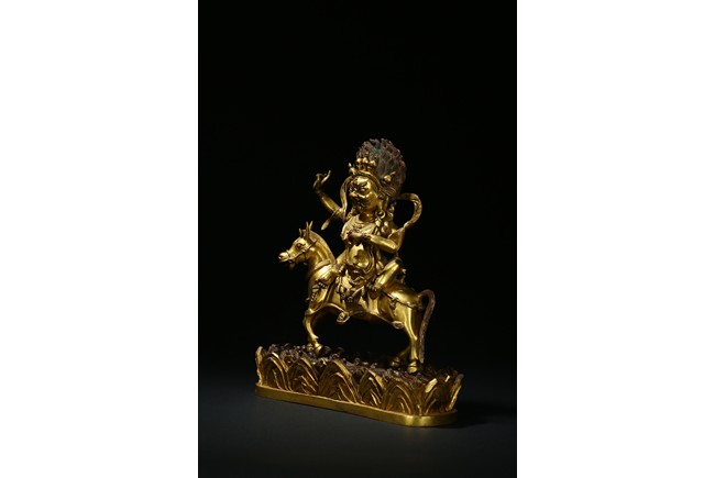 The diety seated on a galloping donkey, the left hand held to the chest and the right arm raised, wearing beaded jewels around the chest, the ferocious face with exaggerated features and pierced with a third eye between the eyebrows, the flaming hair surmounted by a five-skull crown, all striding through a sea of blood and body parts contained within a ring of mountains . Qing Dynasty period.