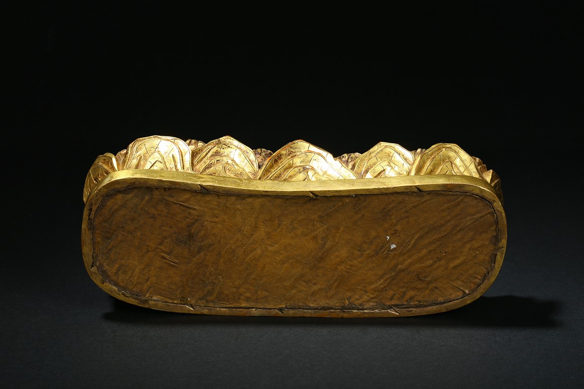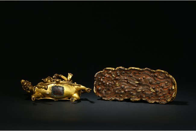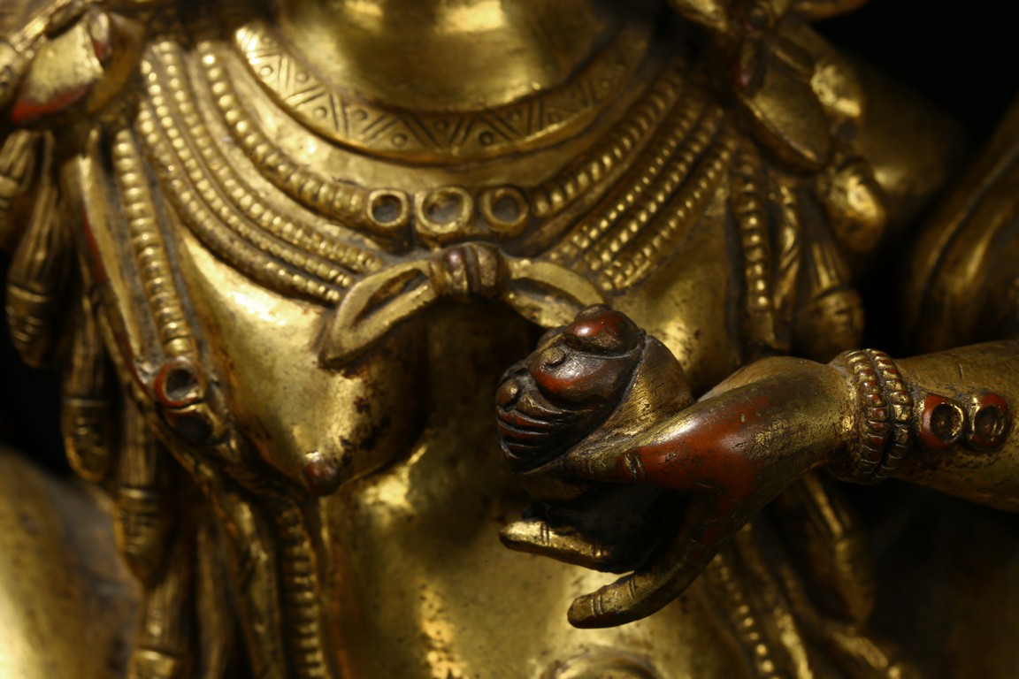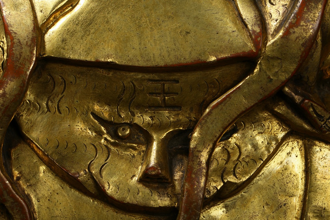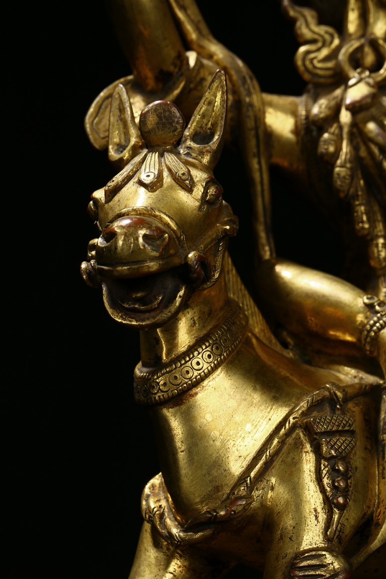 The diety seated on a galloping donkey, the left hand held to the chest and the right arm raised, wearing beaded jewels around the chest, the ferocious face with exaggerated features and pierced with a third eye between the eyebrows, the flaming hair surmounted by a five-skull crown, all striding through a sea of blood and body parts contained within a ring of mountains . Qing Dynasty period.
