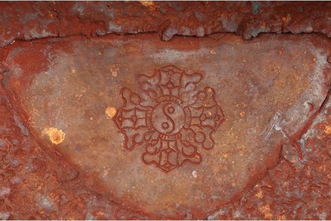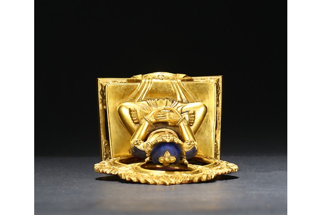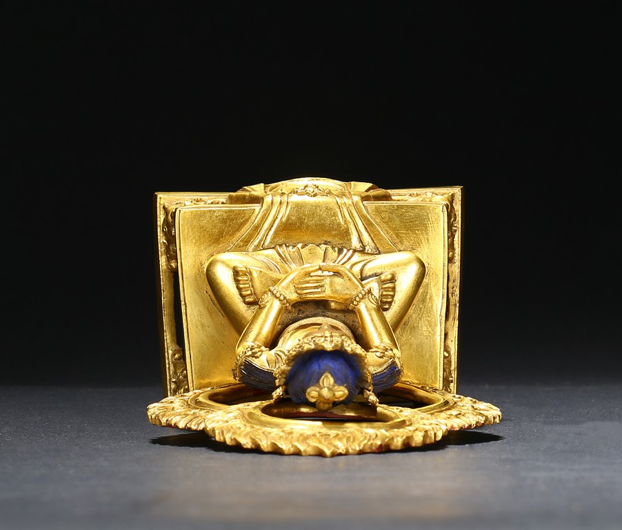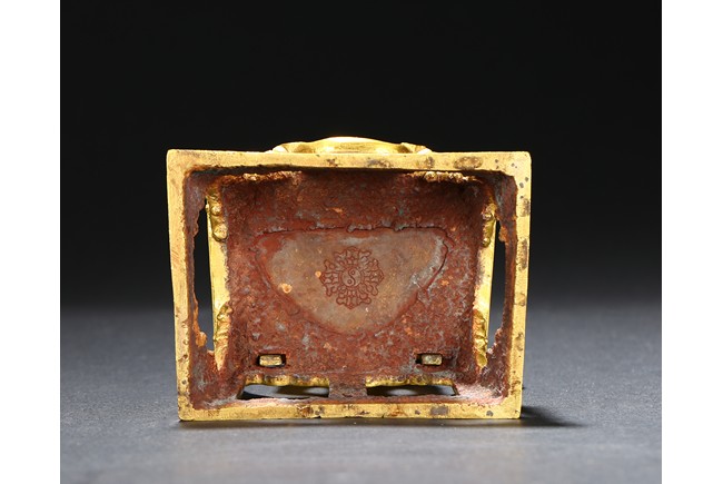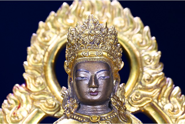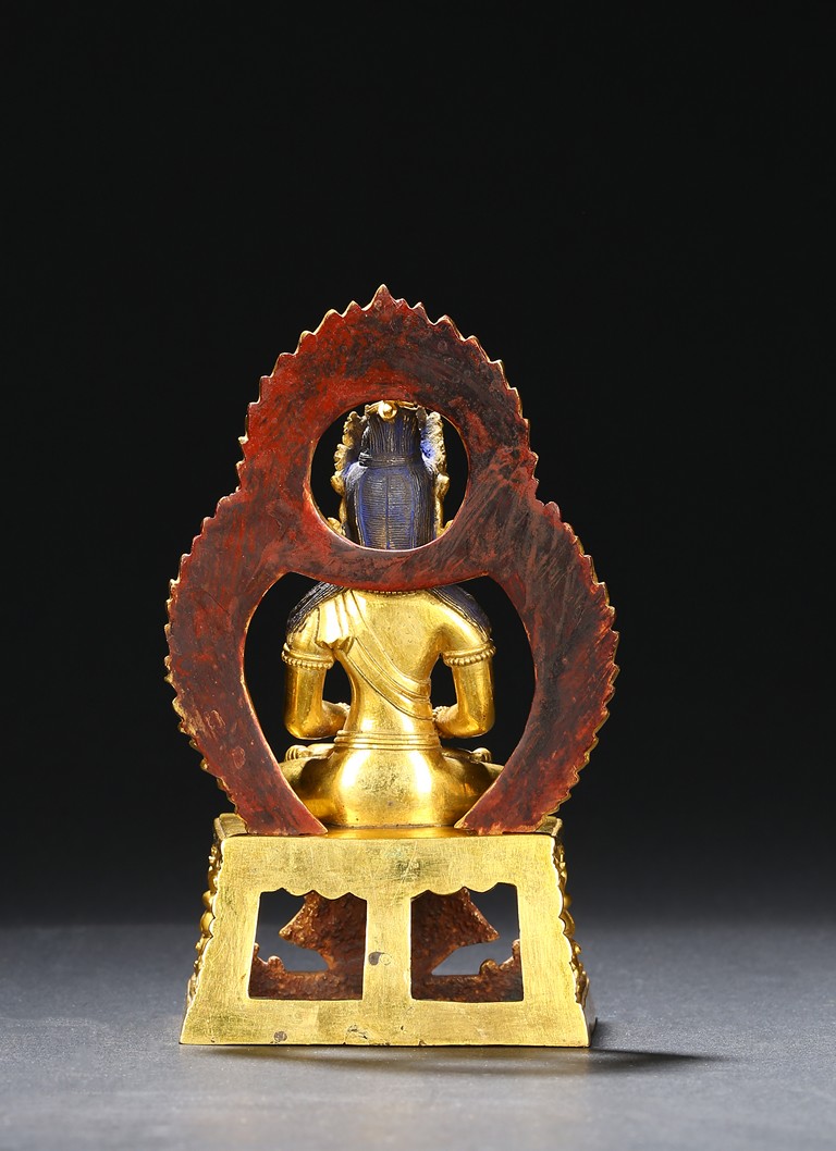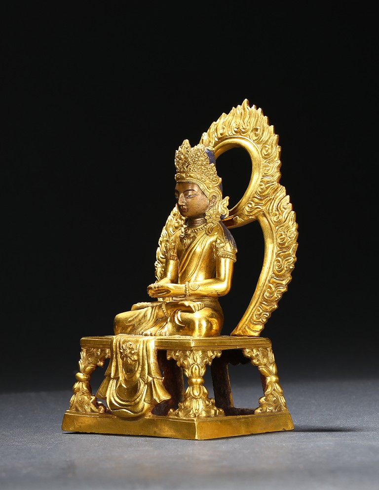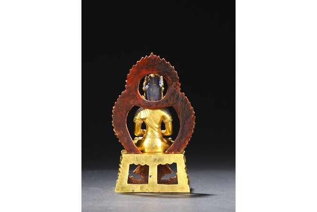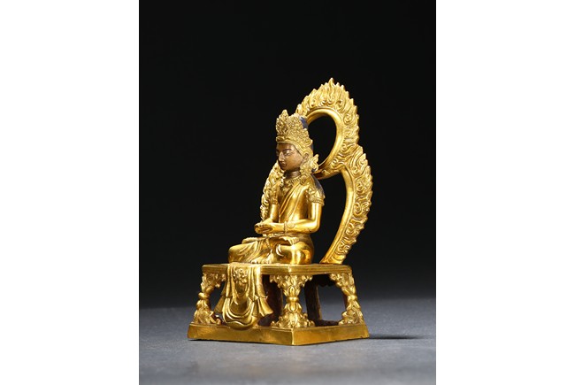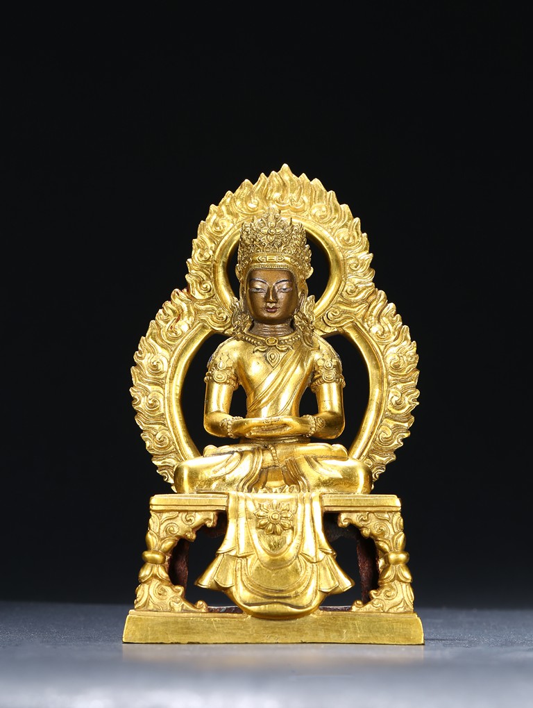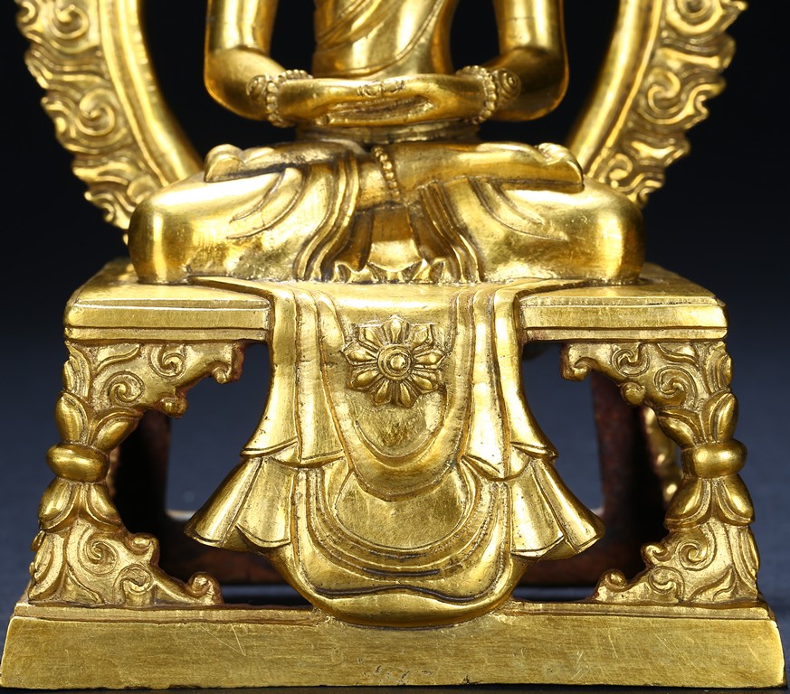 Cast seated in dhyanasana on a rectangular plinth, the hands held in dhyana mudra, wearing long robe draped over the left shoulder leaving the right exposed as well as the jewelled necklace, the face with a meditative expression beneath a coiffure behind a five-leaf tiara, all framed by a separately cast flaming mandorla.