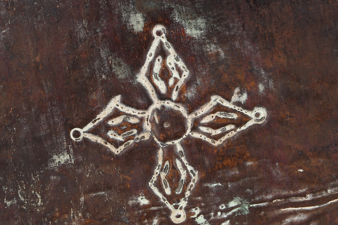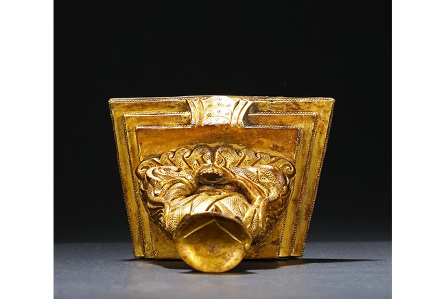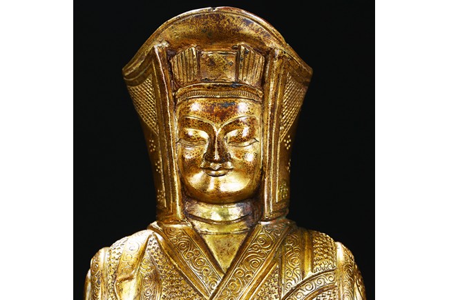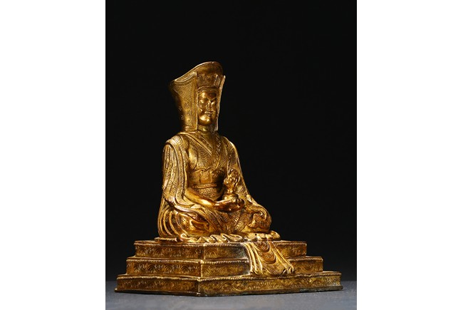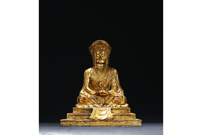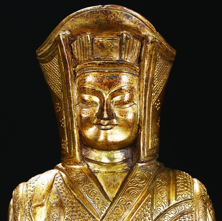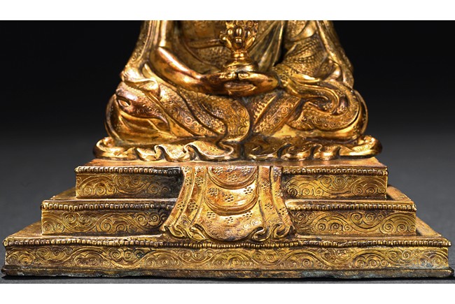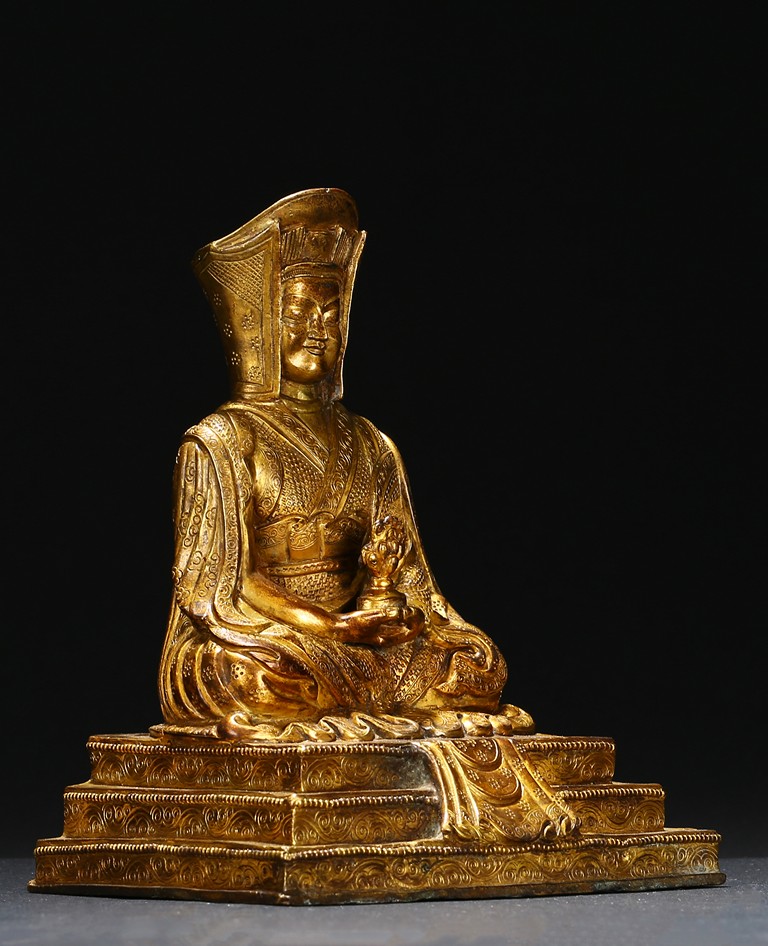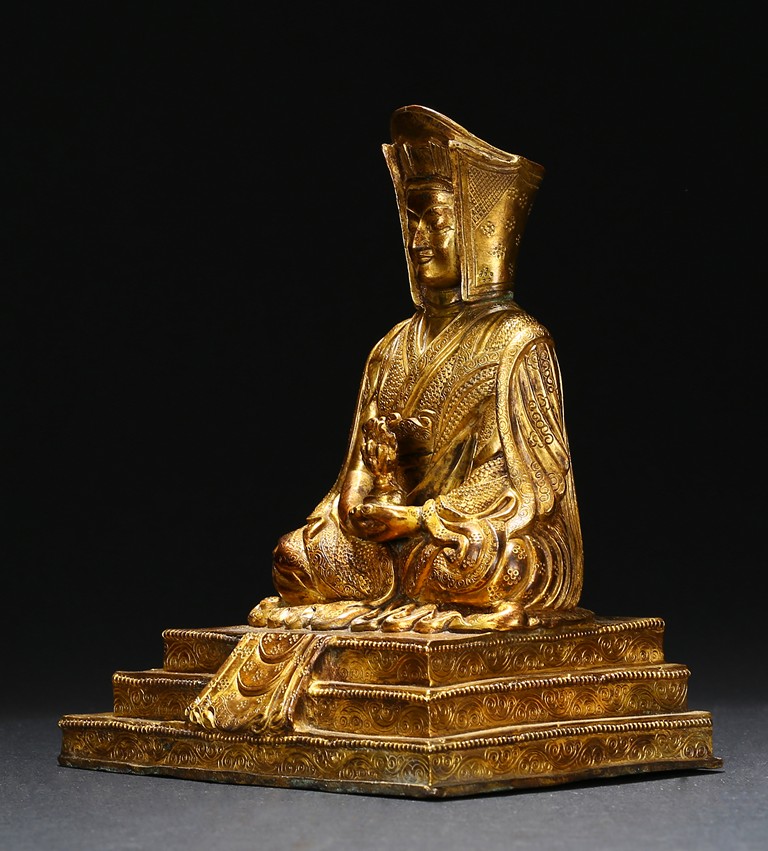 Seated on a stepped plinth, hands holding a ritual object, wearing voluminous robe decorated dense pattern, face in meditation. Qing Dynasty period.