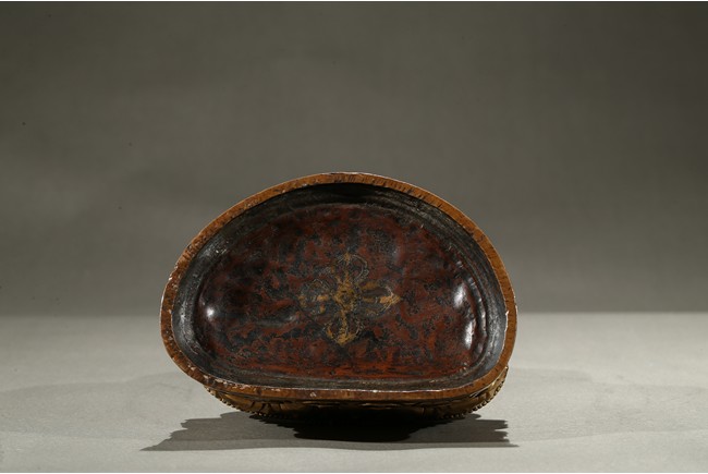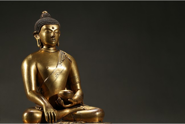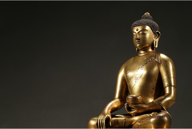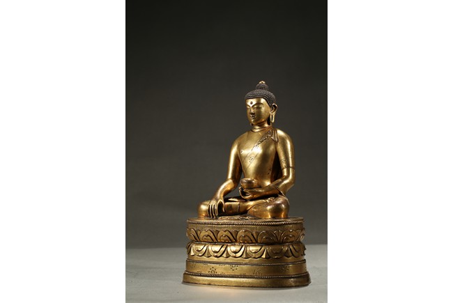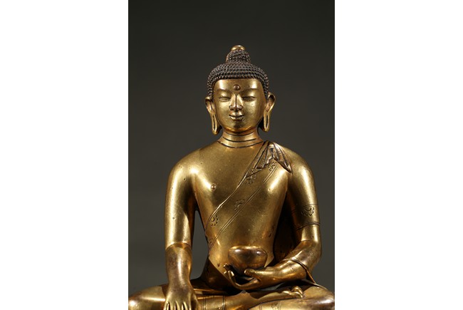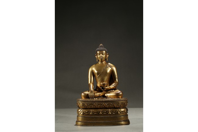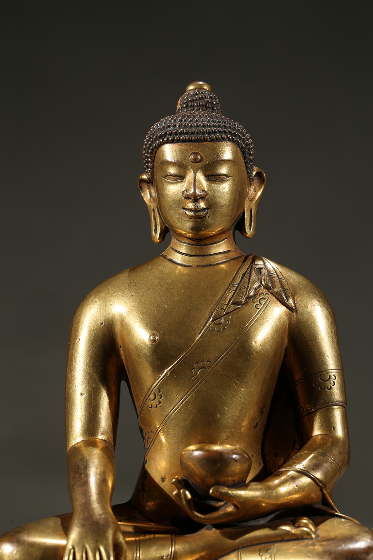Seated in dhyanasana on an elevated double-lotus base with his right hand in bhumisparsha mudra and the left holding a bowl in his lap, clad in a closely-fitting sanghati with a floral hem, the folds elegantly draped over the shoulder and fanning below the ankles, the face with heavy-lidded fish-shape eyes and centered by a raised urna, and the hair in very fine tight curls over the prominent ushnisha and topped with a knop. Qing Dynasty period.