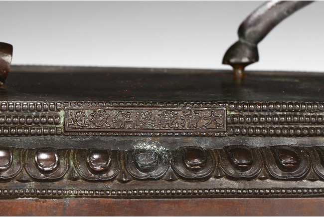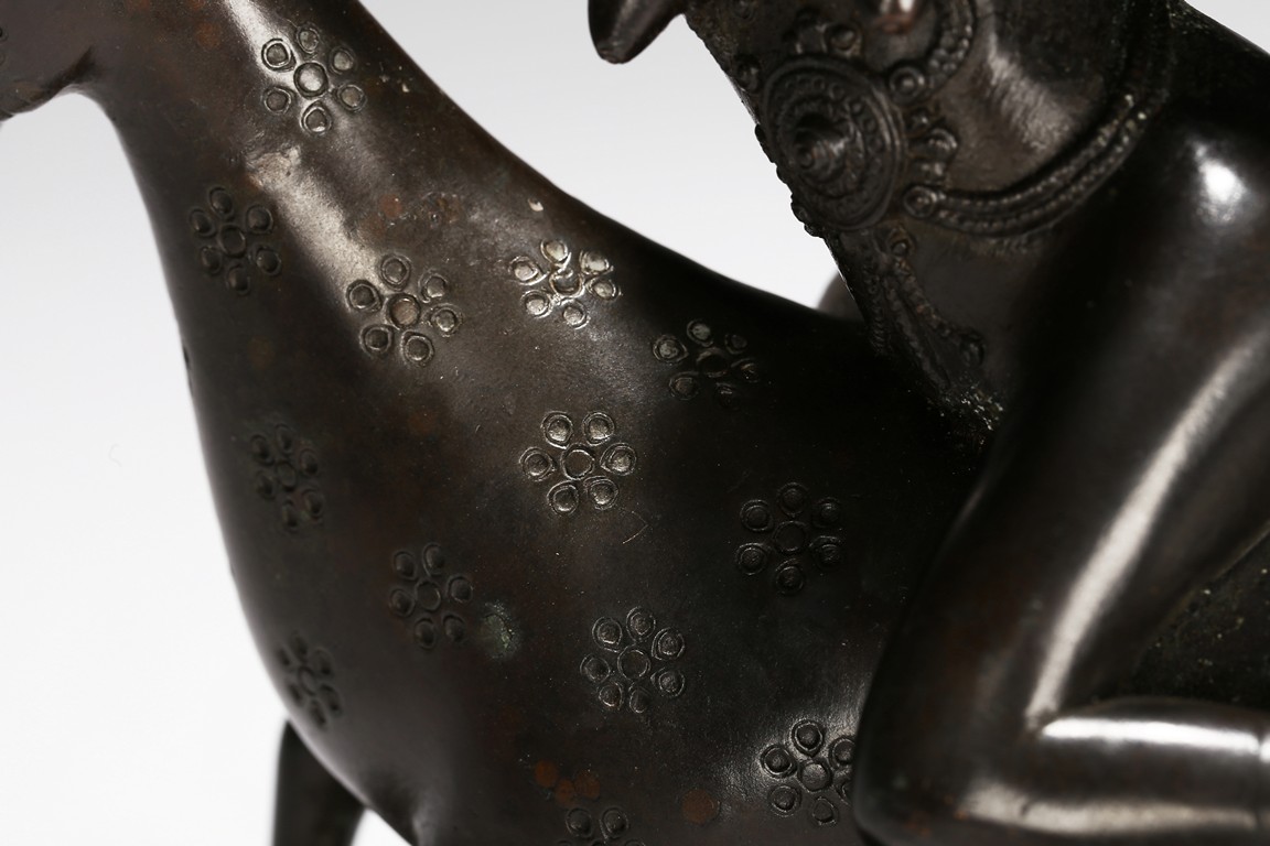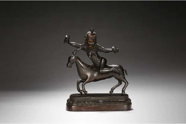The deity is shown seated on a deer upon a lotus throne cast with six character reign mark , both hands outstretched holding a ritual object, face with ferocious expression, body adorned with beaded jewellry. Qing Dynasty period.