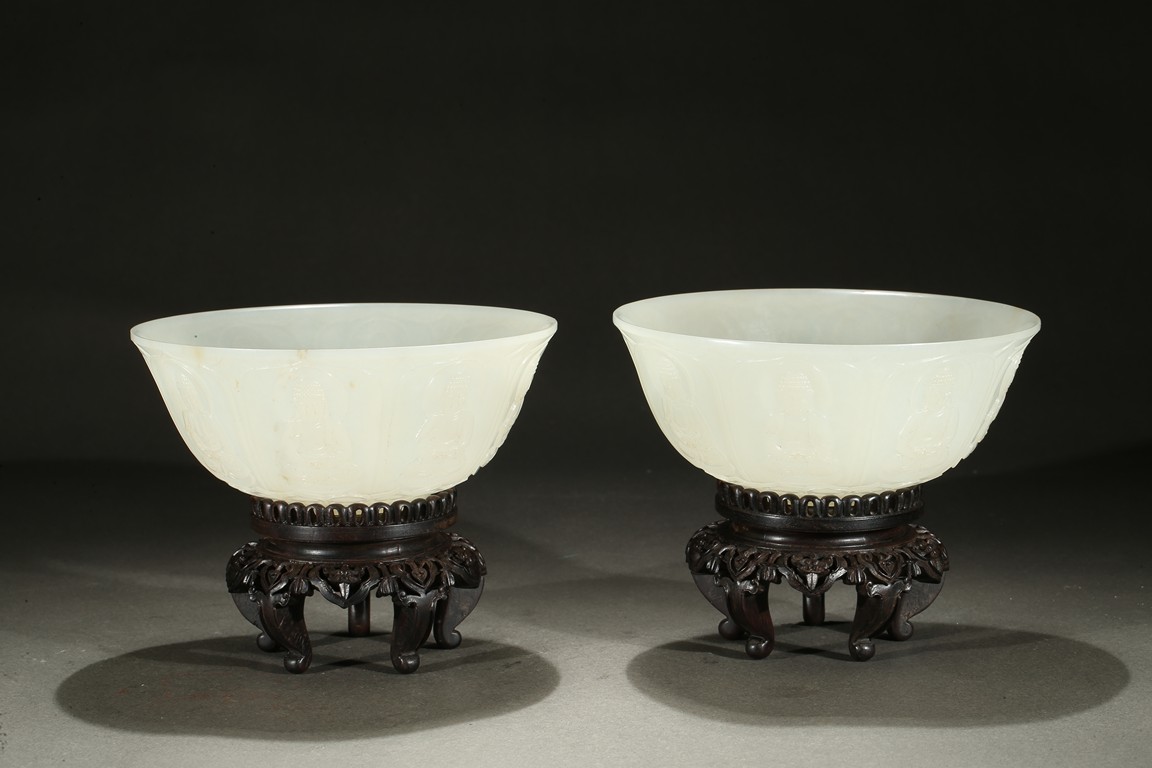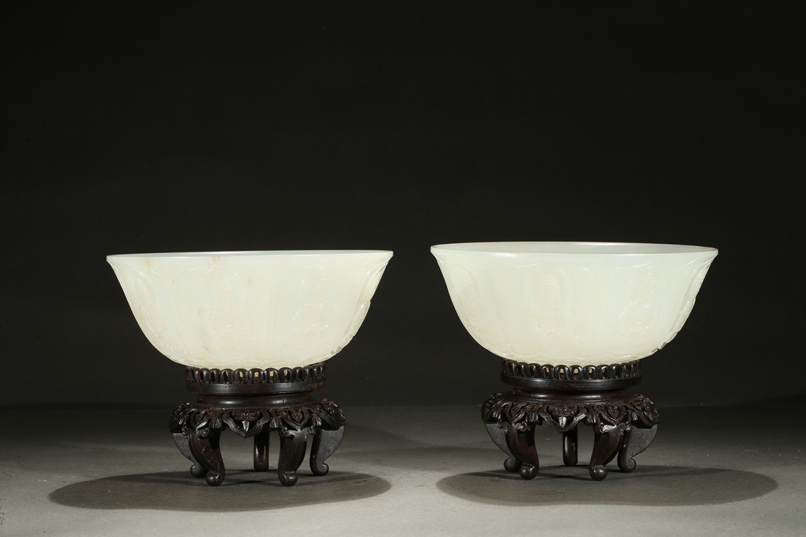 Each carved bowl rising to a slightly flared rim, the body elaborately carved with lotus petal shape panel enclosing a seated Amitabha buddha, the stone is of smoothly polished even white tone, all supported on carved zitan stand. Qing Dynasty Qianlong period.