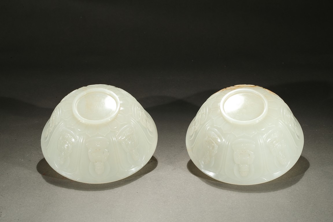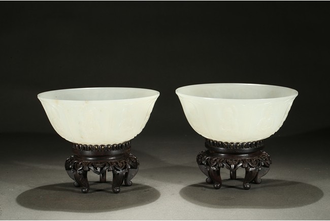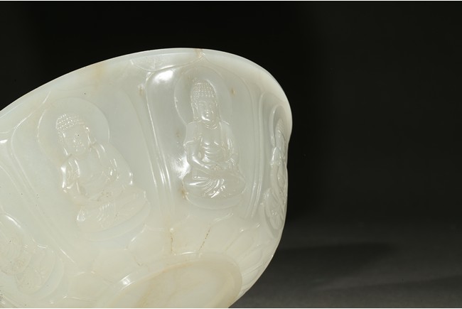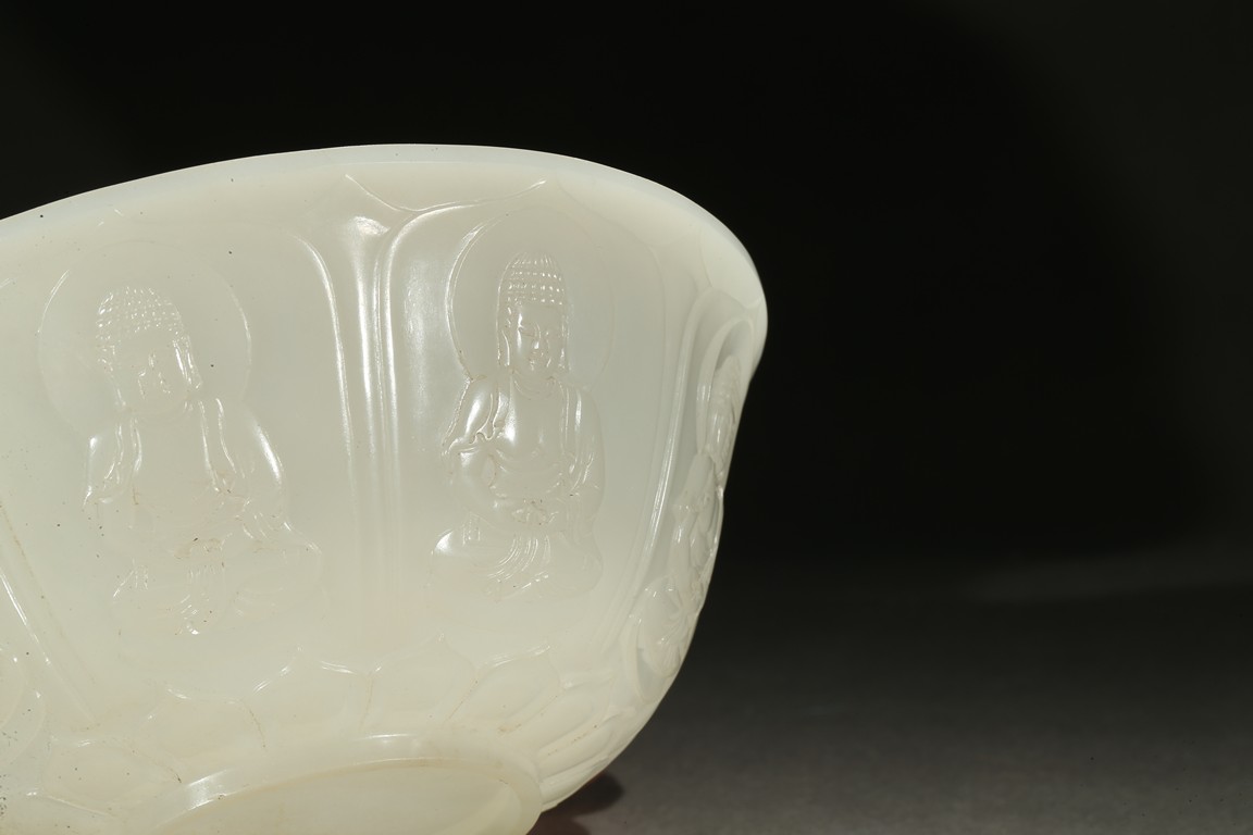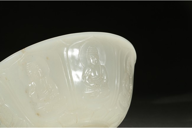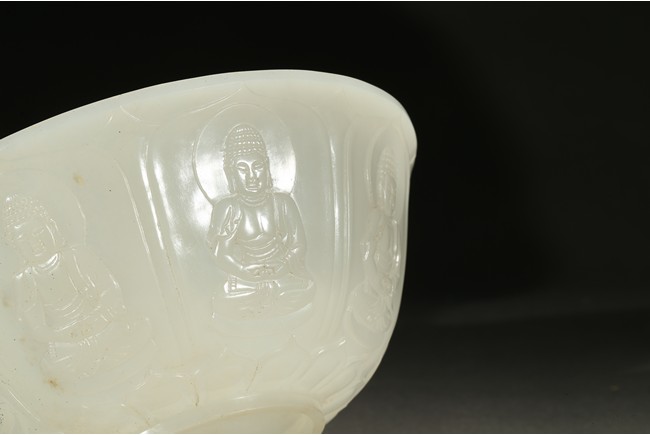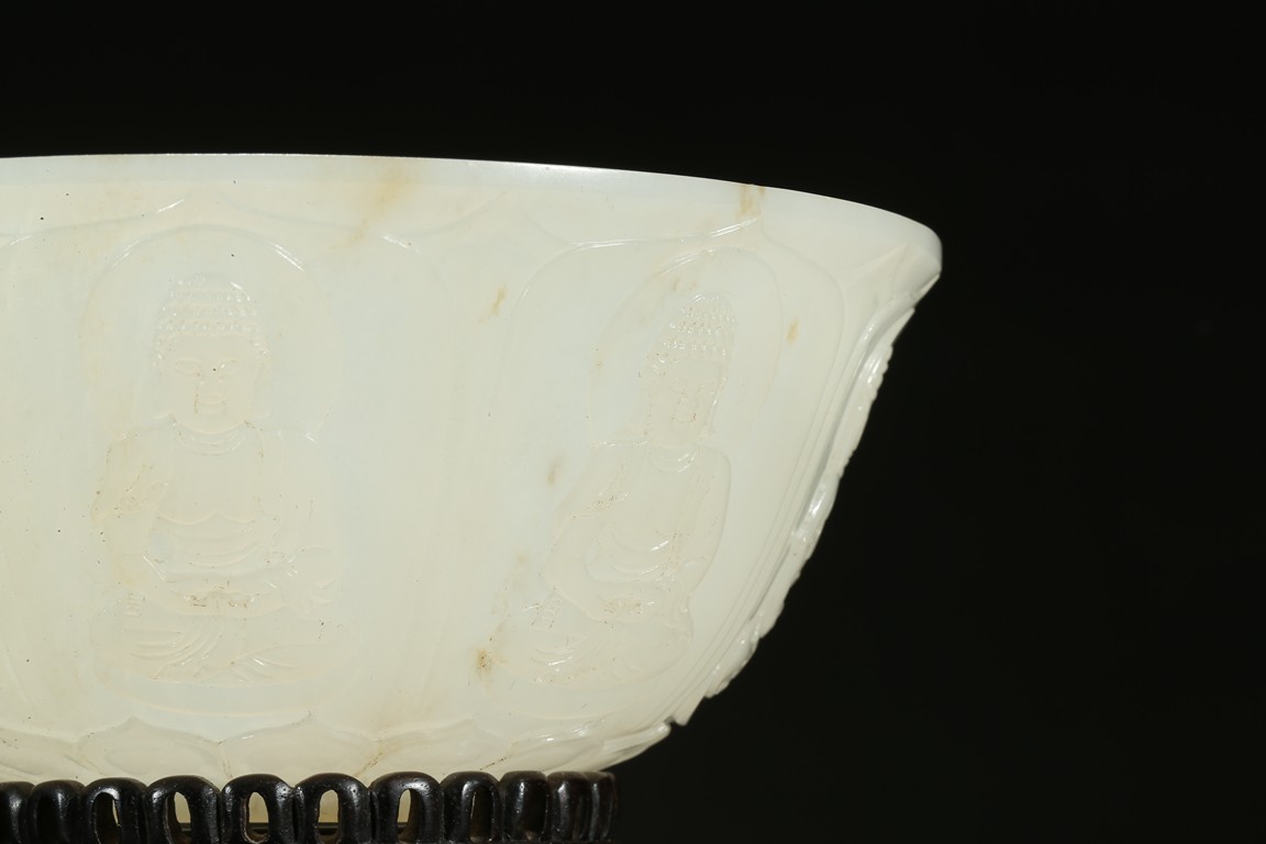 供碗以整塊白玉雕琢而成,玉質瑩潤,用料碩豐,外壁七分蓮瓣之上各雕坐佛七尊,排列缜密,層次分明,生動形象,富有濃郁的佛教色彩,不可多得。