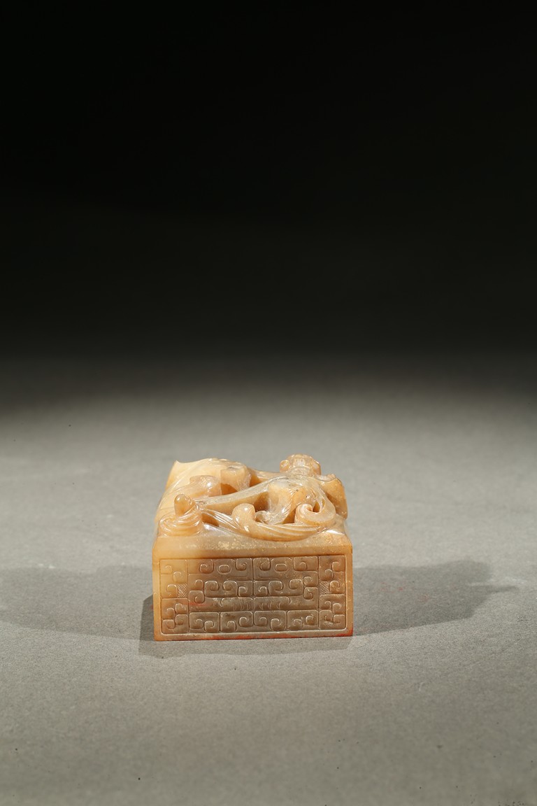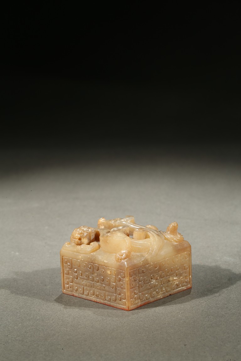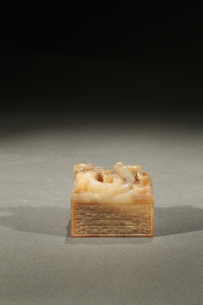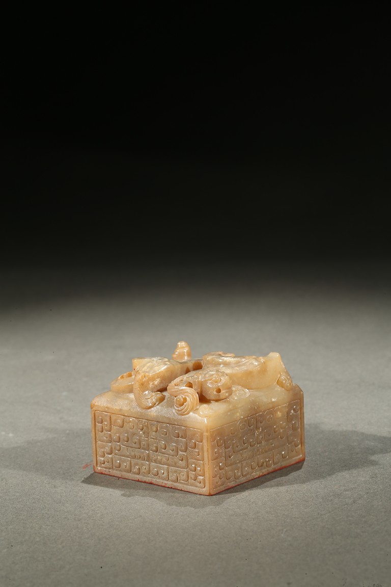 A CELADON JADE CARVED CHILONG SEAL 舊玉螭龍鈕印