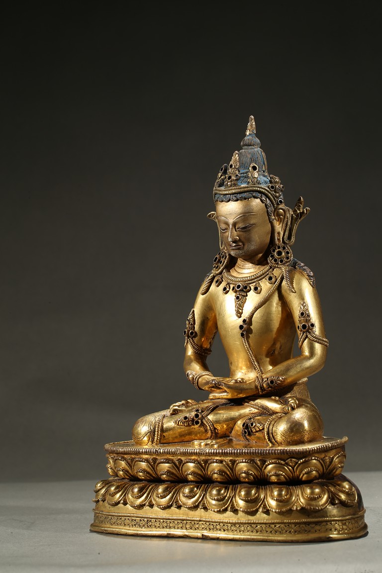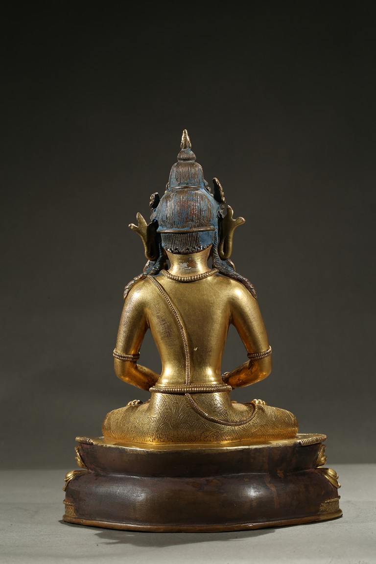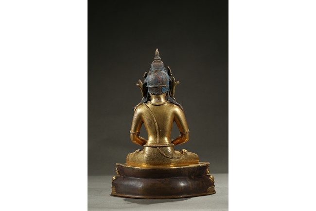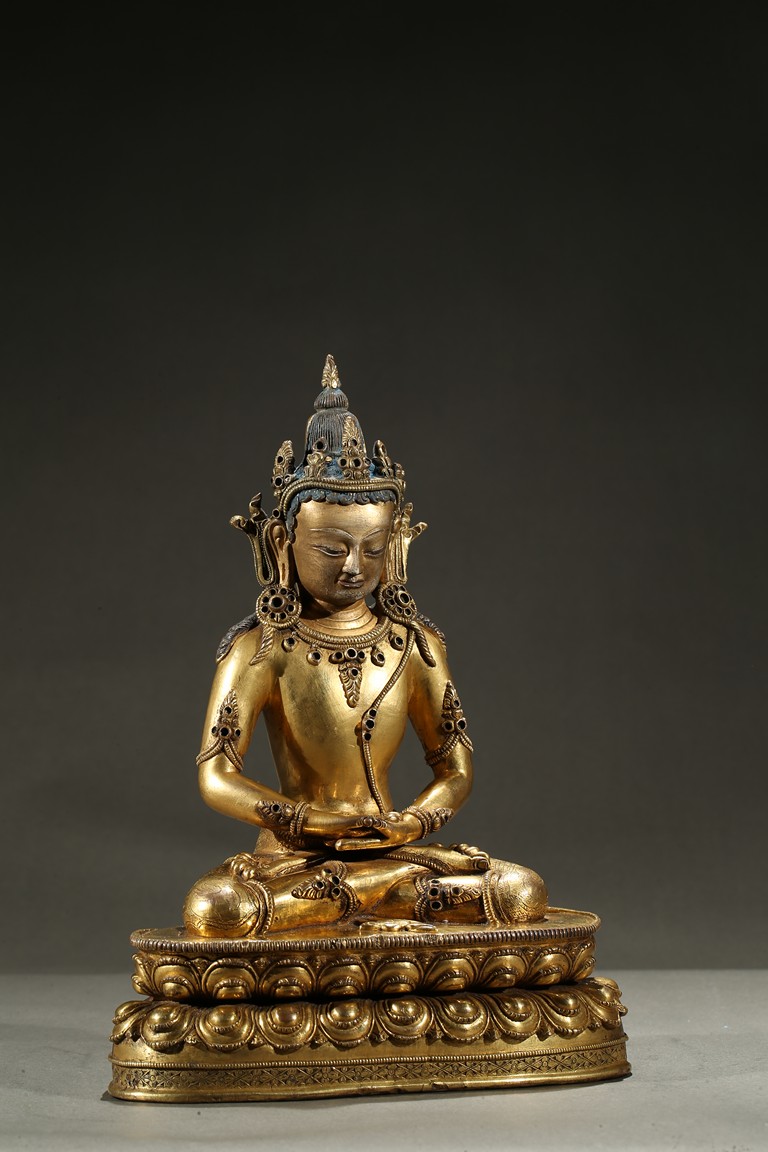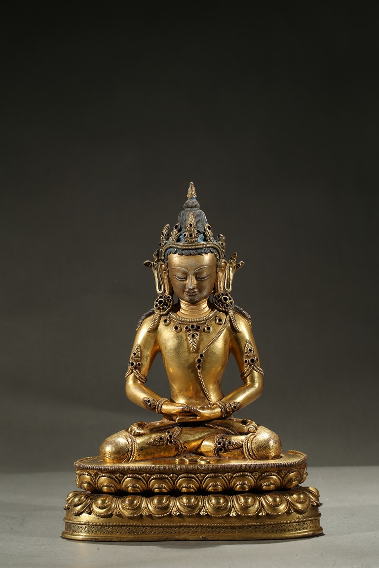 Seated in dhyanasana on a double lotus base with both hands in dhyana mudra, wearing long flowing robes and adorned with circular earrings and necklace. Ming Dynasty period.