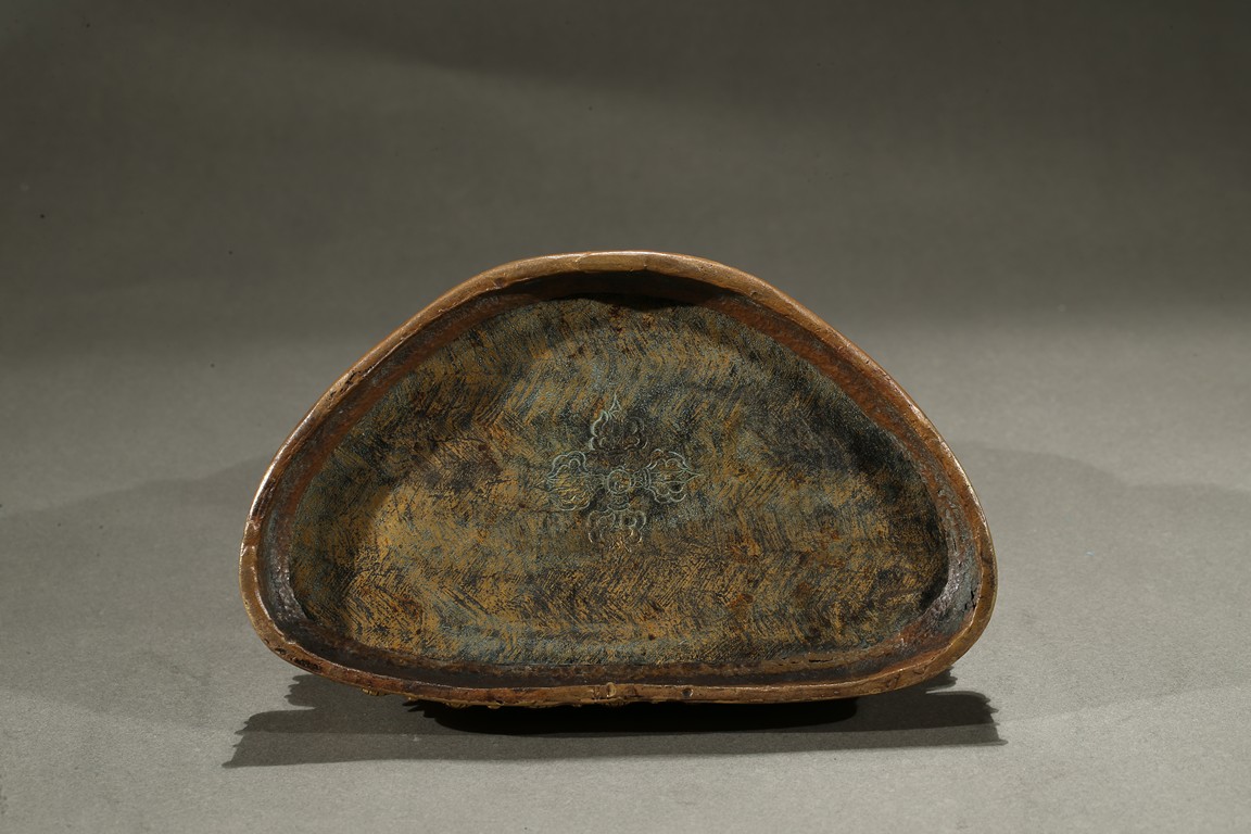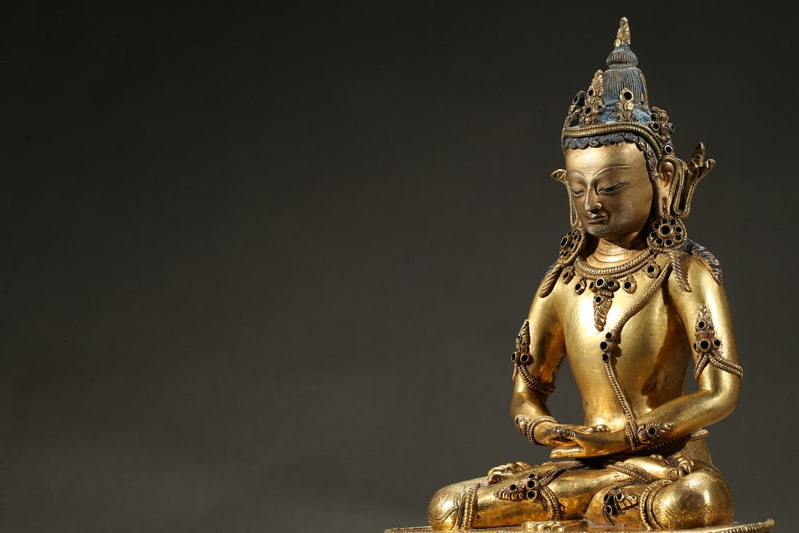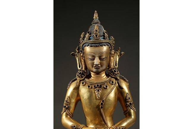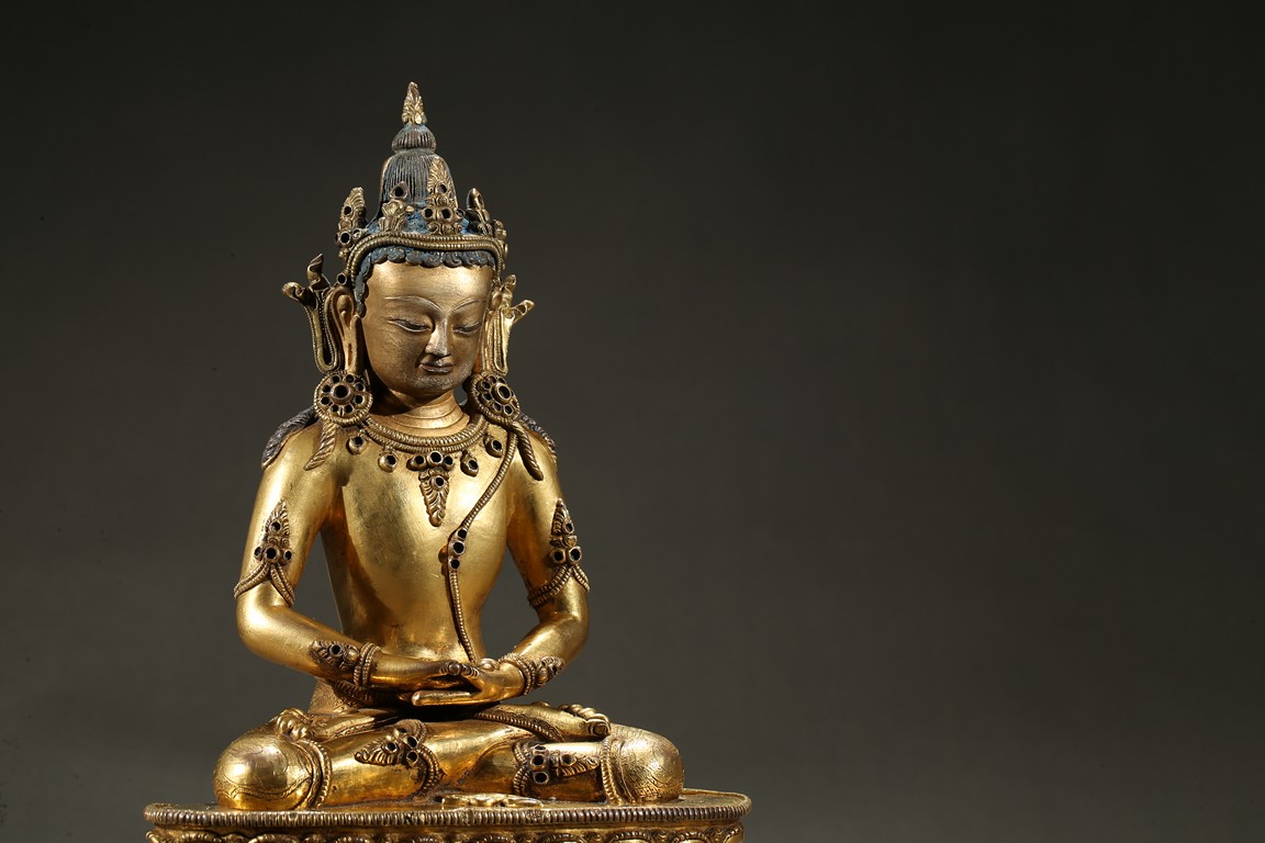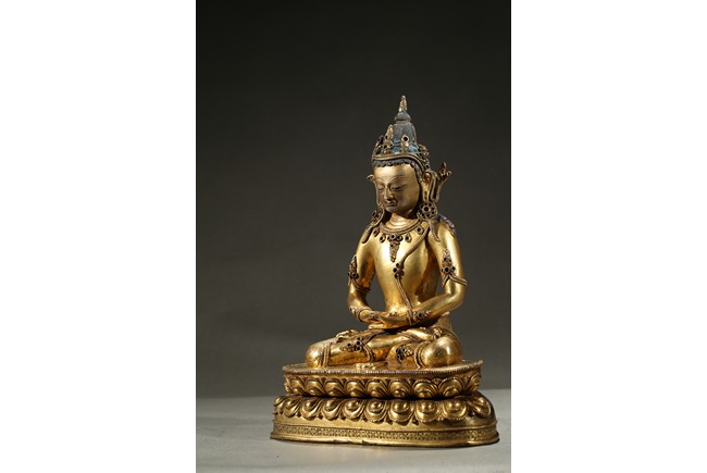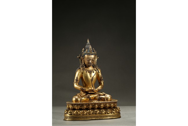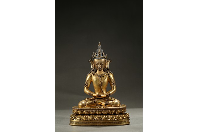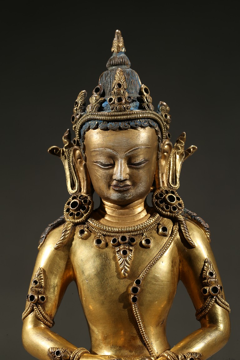 Seated in dhyanasana on a double lotus base with both hands in dhyana mudra, wearing long flowing robes and adorned with circular earrings and necklace. Ming Dynasty period.