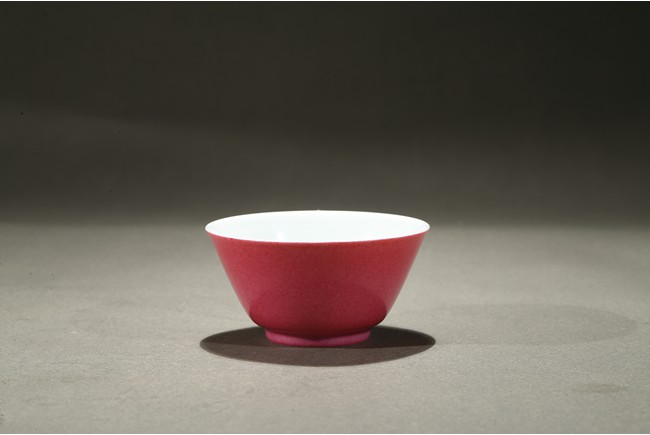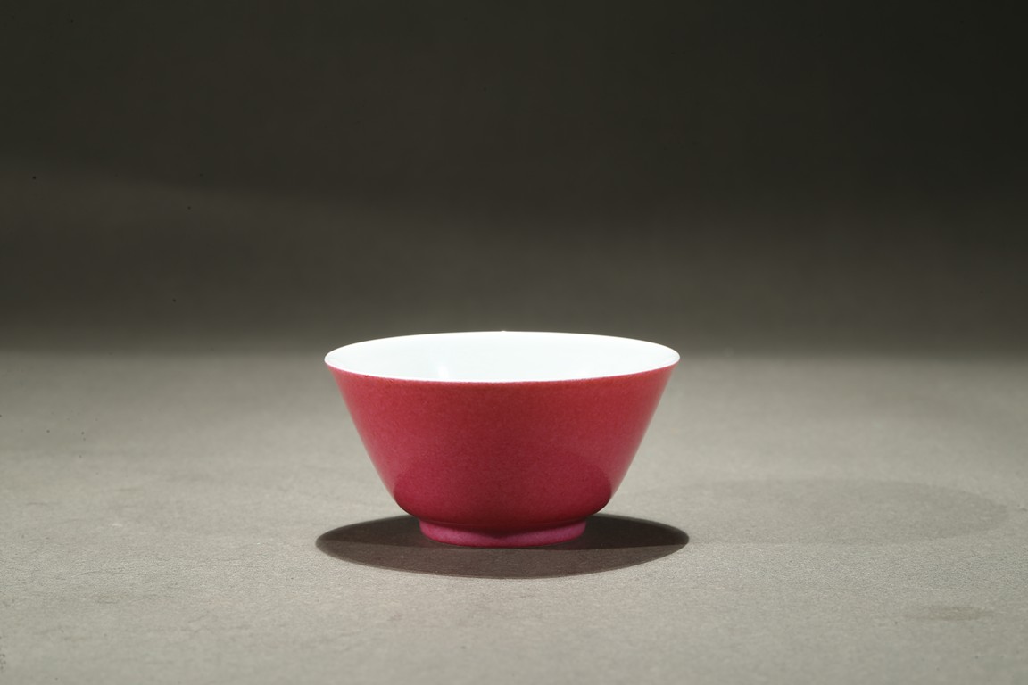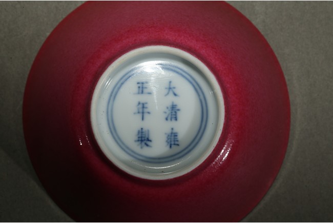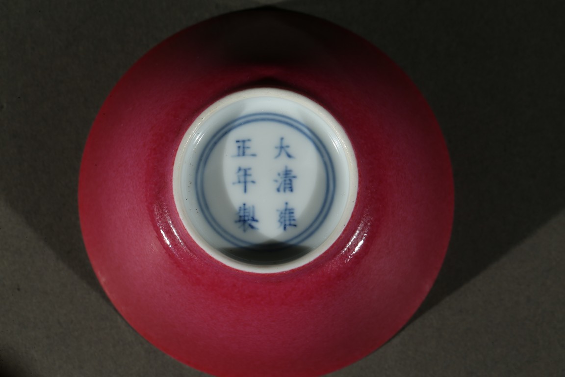 The steep sides rising from circular feet, overall suffused with ruby red glazed, interior decorated, base with six character YONGZHENG mark. Qing Dynasty period.