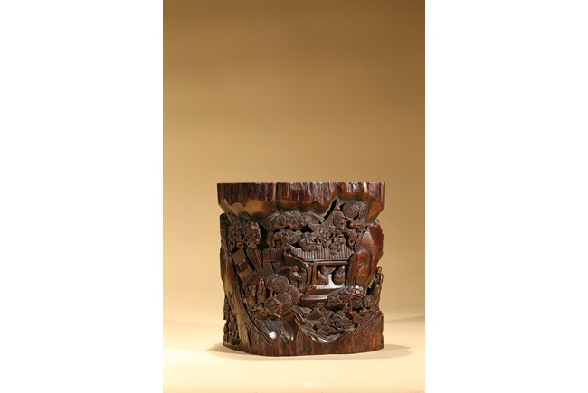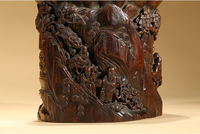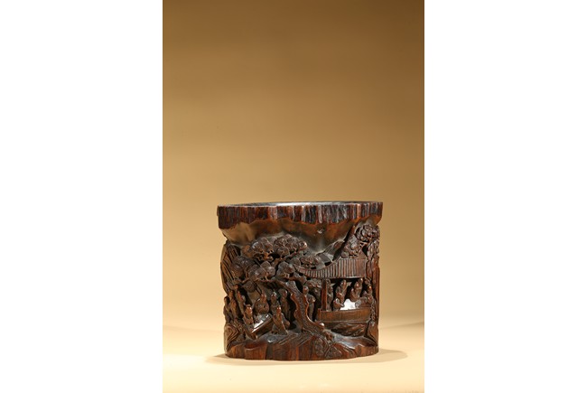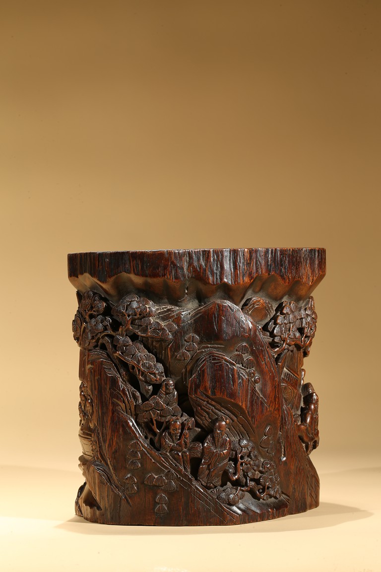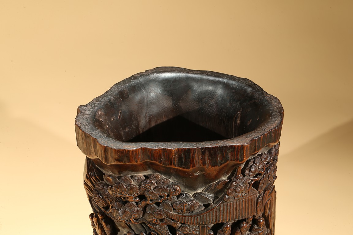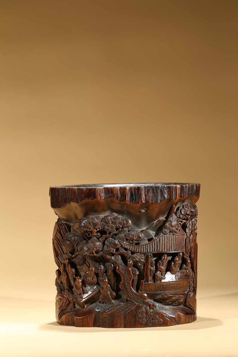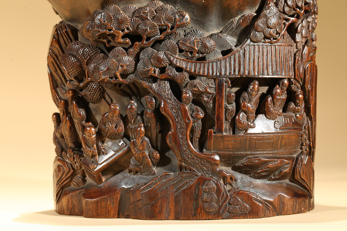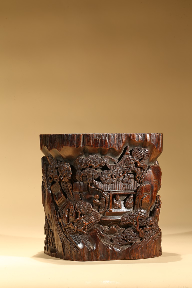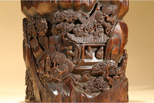 The brushpot finely carved around the body with a scene of literati gathering in a mountain setting with pine trees and pavilion framed by rocky outcrops. Qing Dynasty period.
