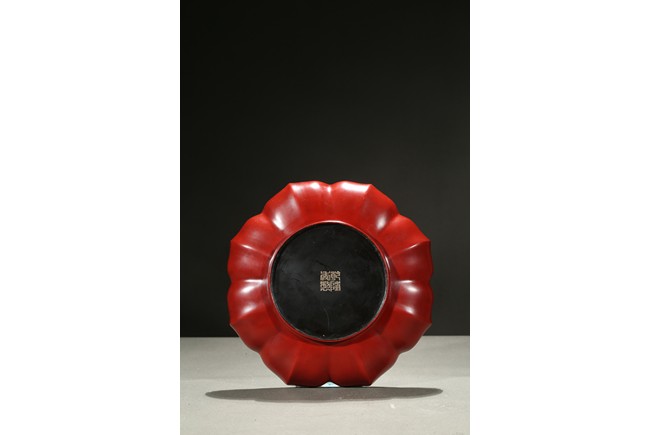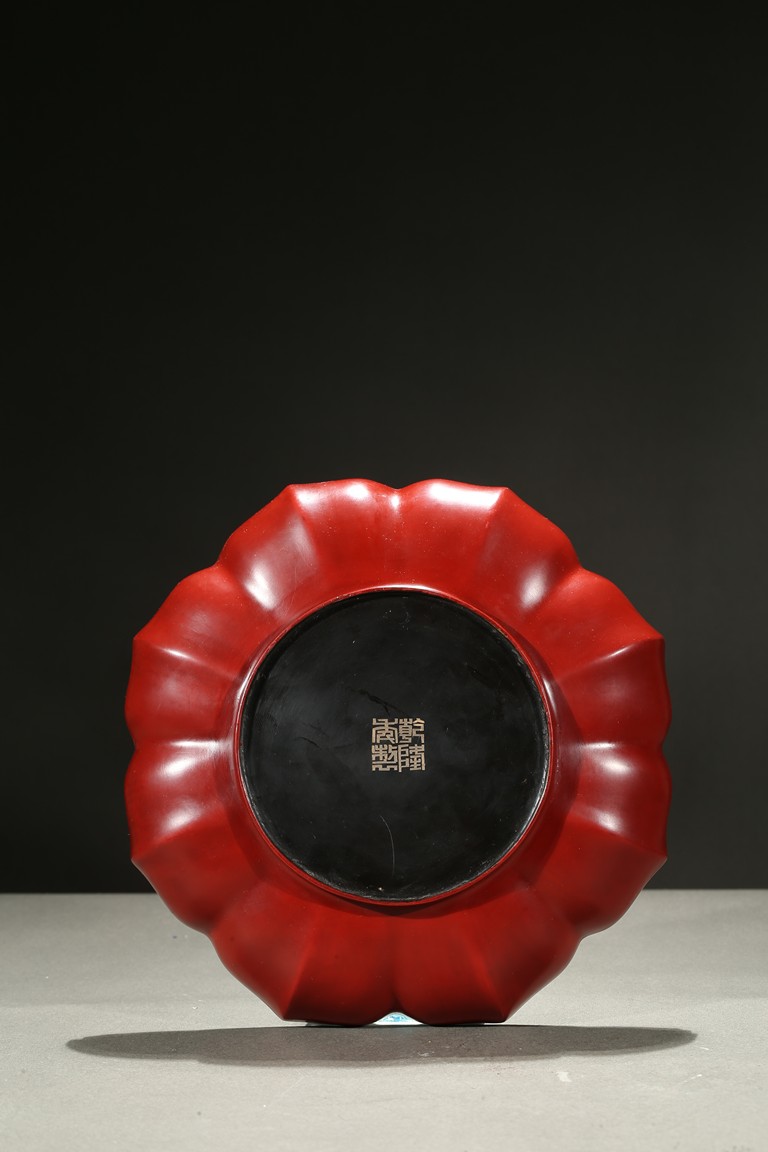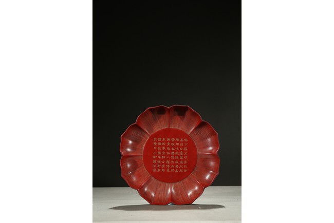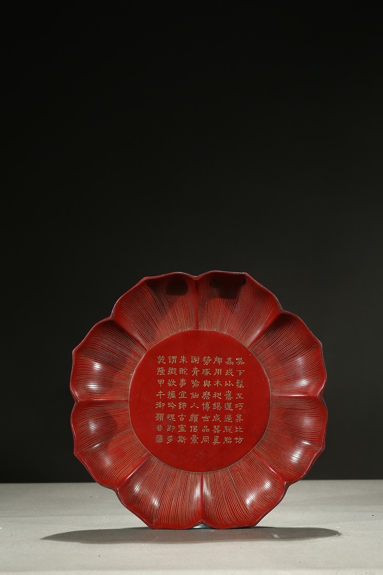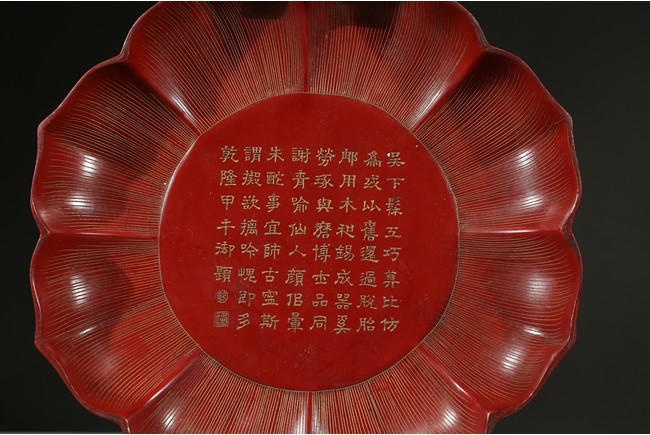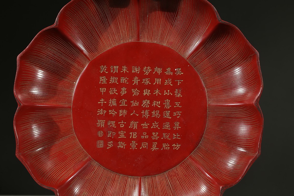The shallow sides rising from a low foot to an eight-lobed rim resembling petals of a lotus flower, the center inscribed in gilt with Imperial poem and two seal marks, the black lacquer underside with a mark.